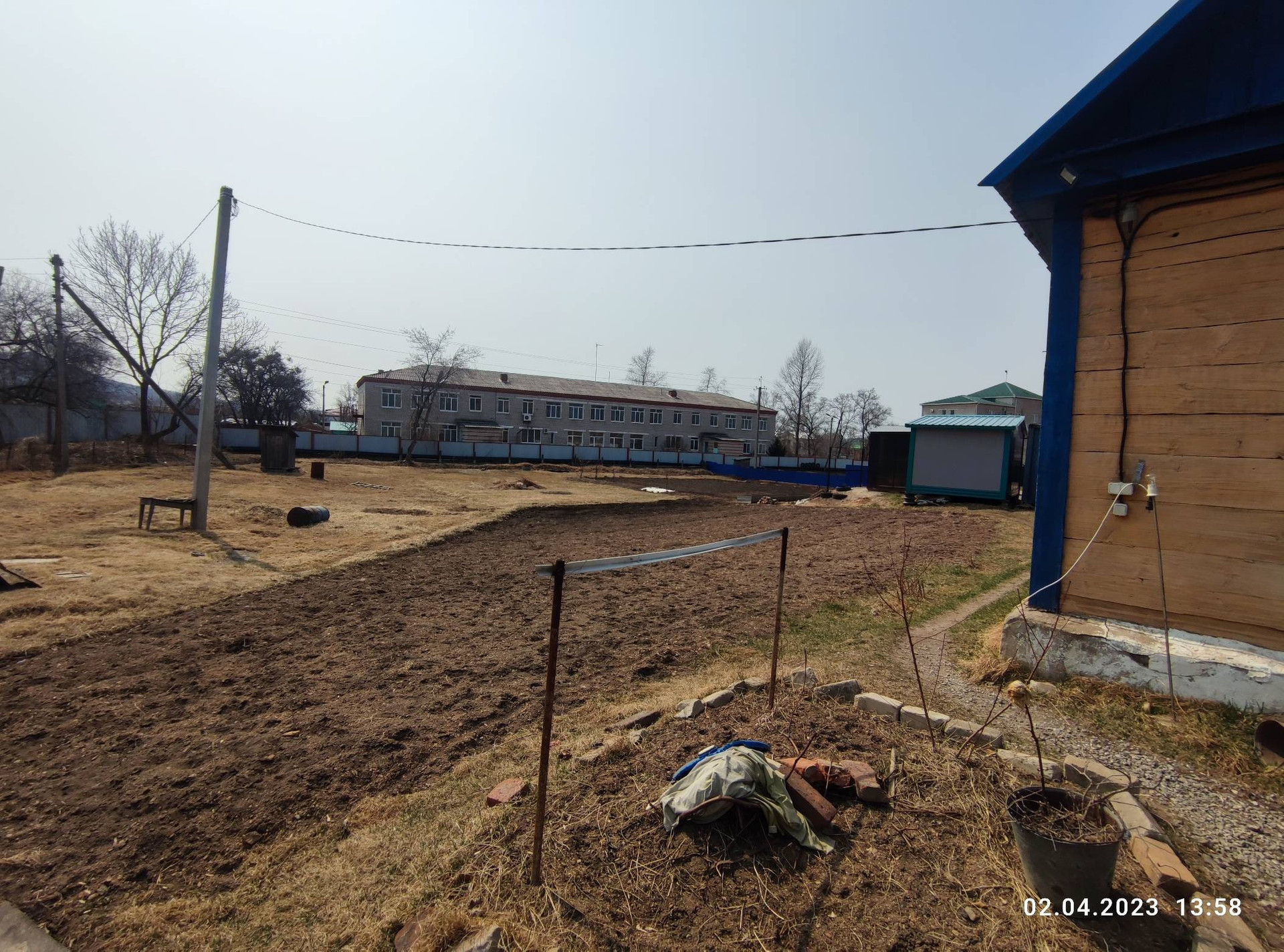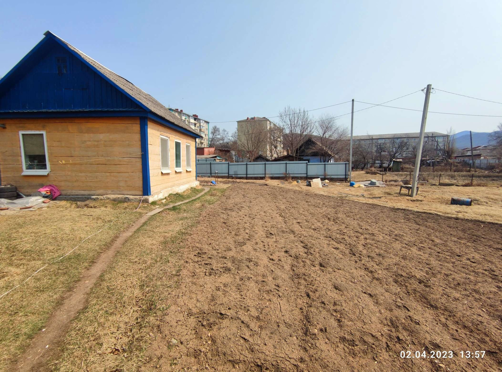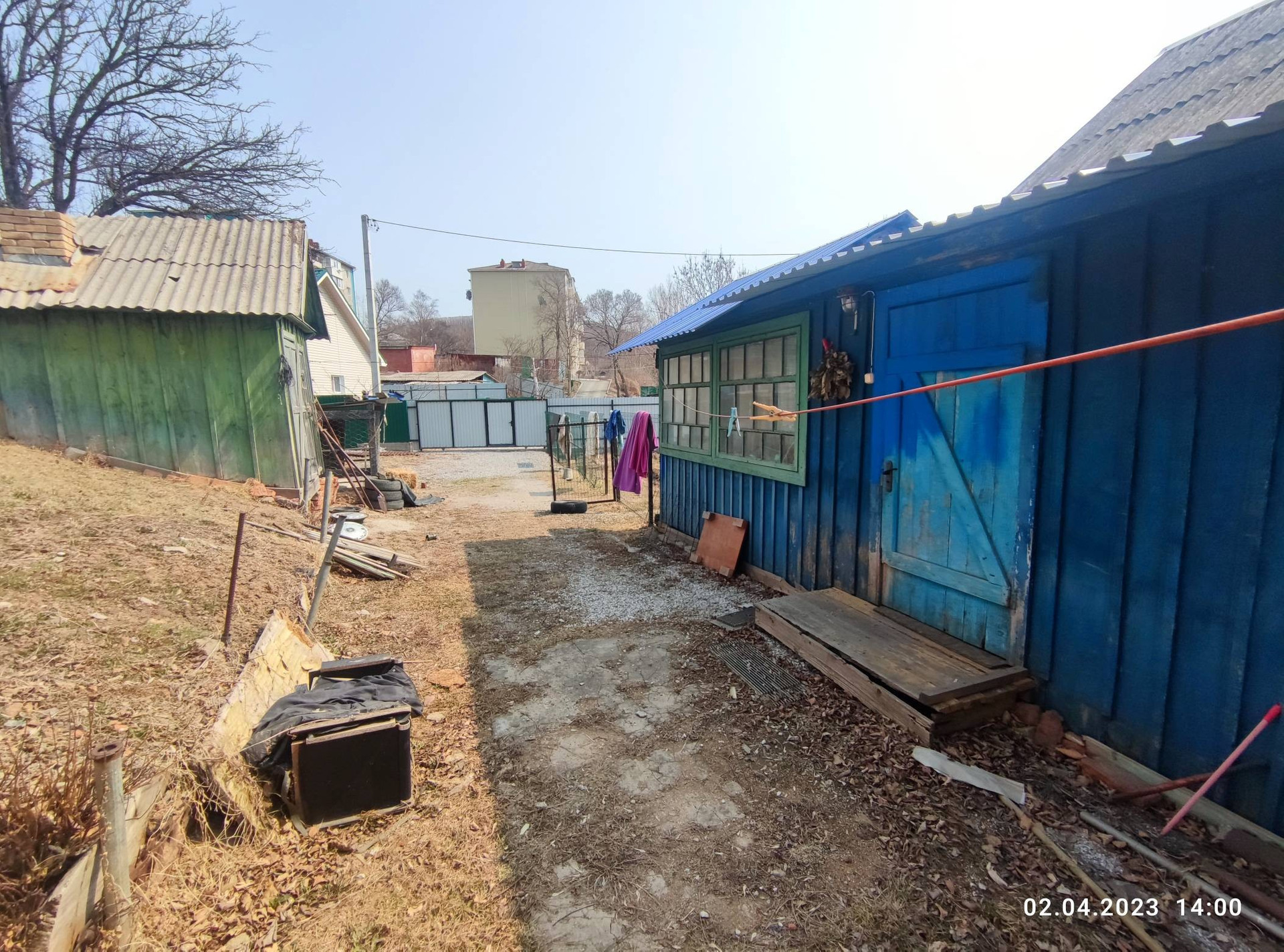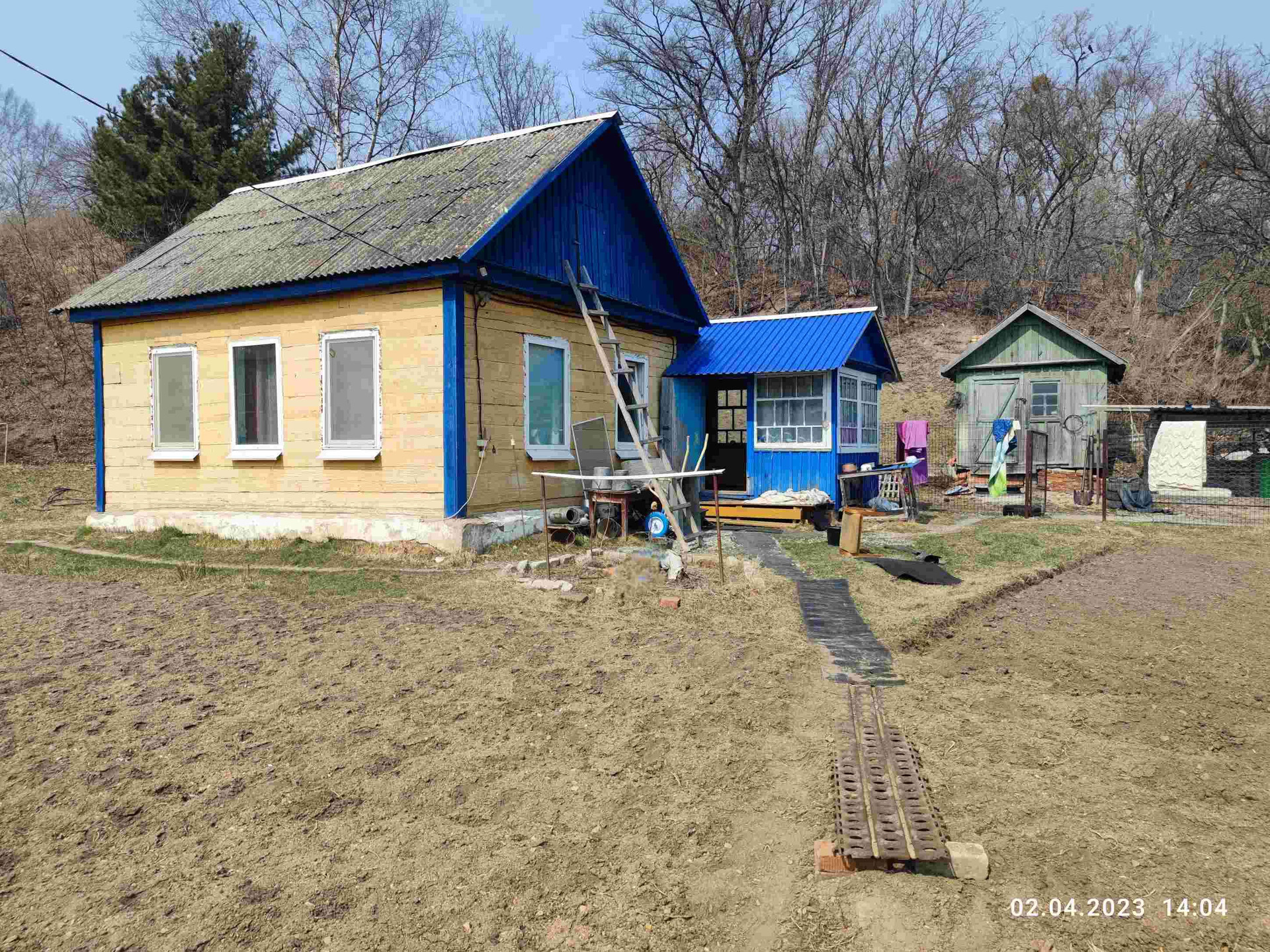 Участок огорожен забором.Ворота откатные , металлопрофиль.