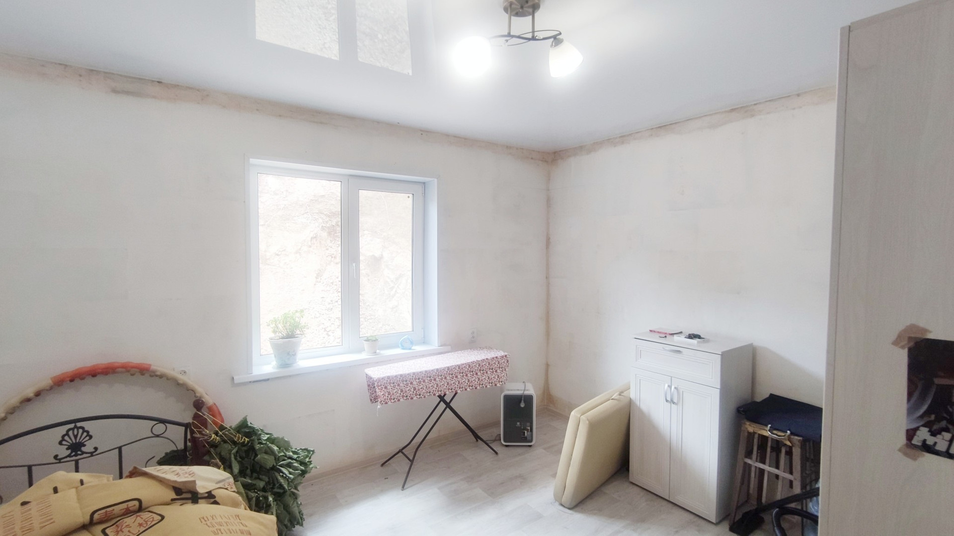 - Потолок высокий, натяжной с софитами.