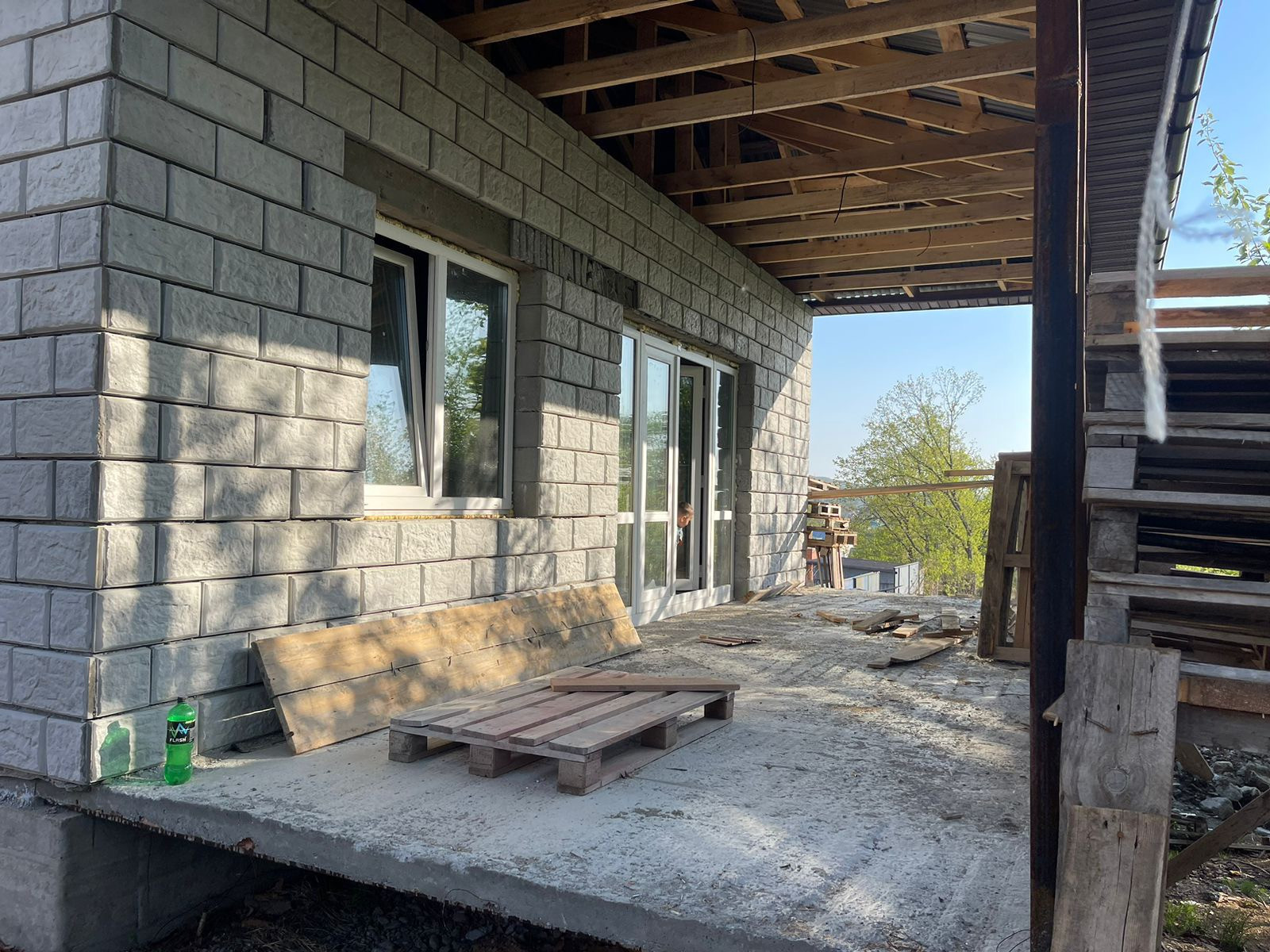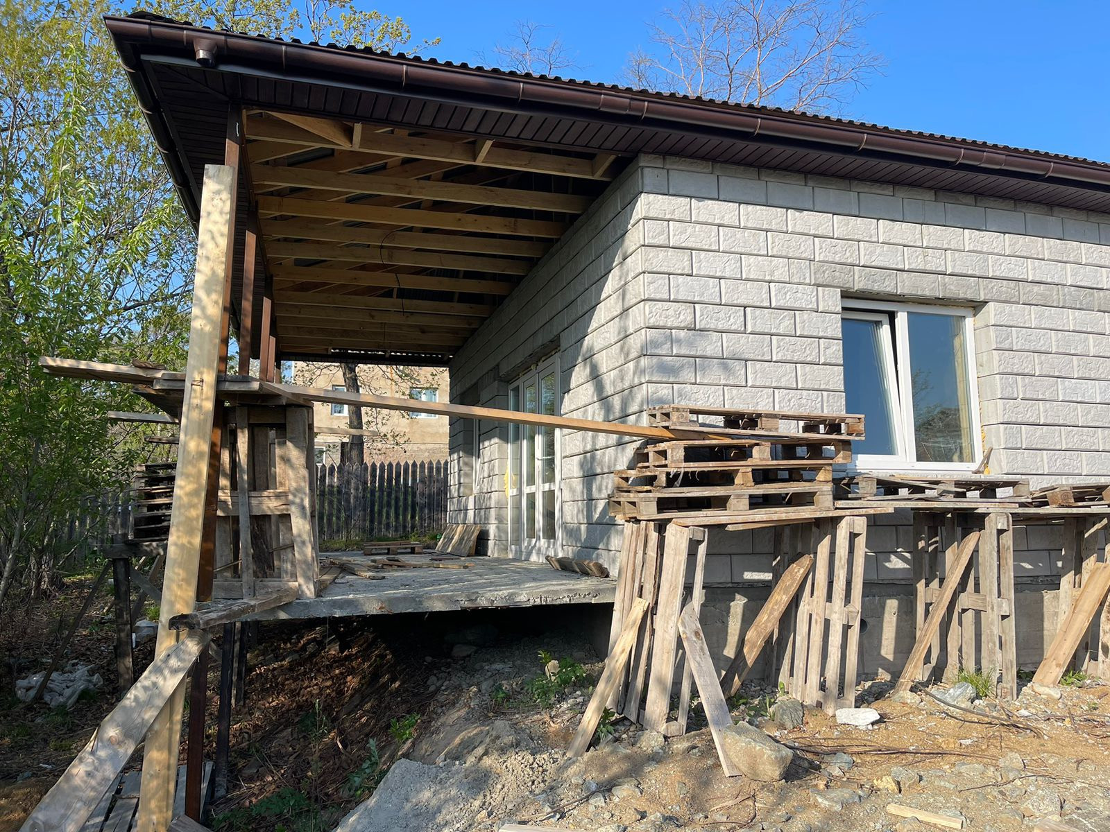 Дом построен из пеноблока с облицовкой (облицовку над окнами планируем доделать, не хватила материала, до заказали) Фундамент - плита. Перегородки в доме - отсевные блоки. В доме затерты стены и проведена электрическая проводка. Земельный участок вокруг дома отсыпан грунтом. Окна пластиковые, тройной стеклопакет. Крыша скатная.