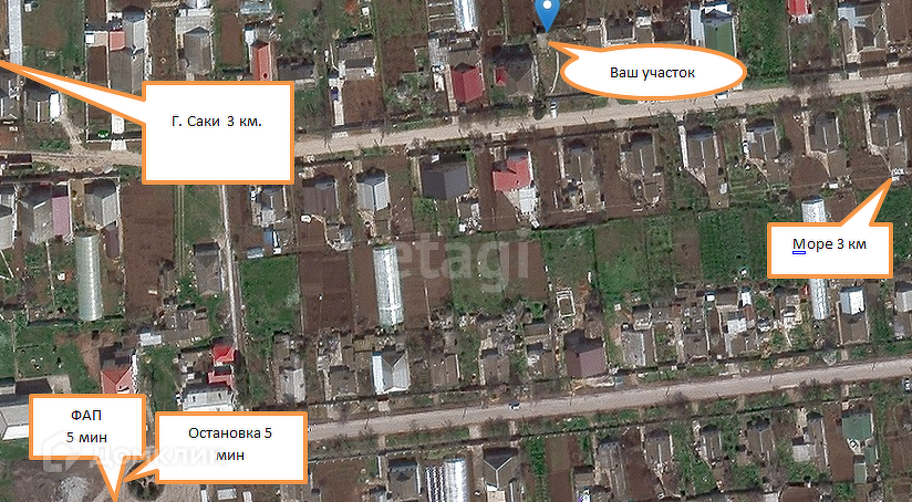 Инфраструктура развита, остановка автобуса в 5 минутах ходьбы (транспорт ездит регулярно), в селе есть акушерский пункт, магазины, специализированный автобус возит в школу и сад. До города саки 3 км, до моря 3 км.