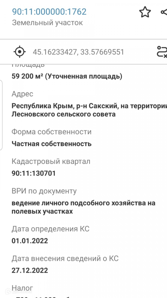 Хорошее вложение для коммерческих целей. Земля ЛПХ, возможно раздел по гектарам или раздел на участки. За газ и электричество, которое проходит по участку оплачивают раз в квартал по 25 тыс.руб. Возможна продажа через дом клик, кадастровый номер 90:11:000000:1762.