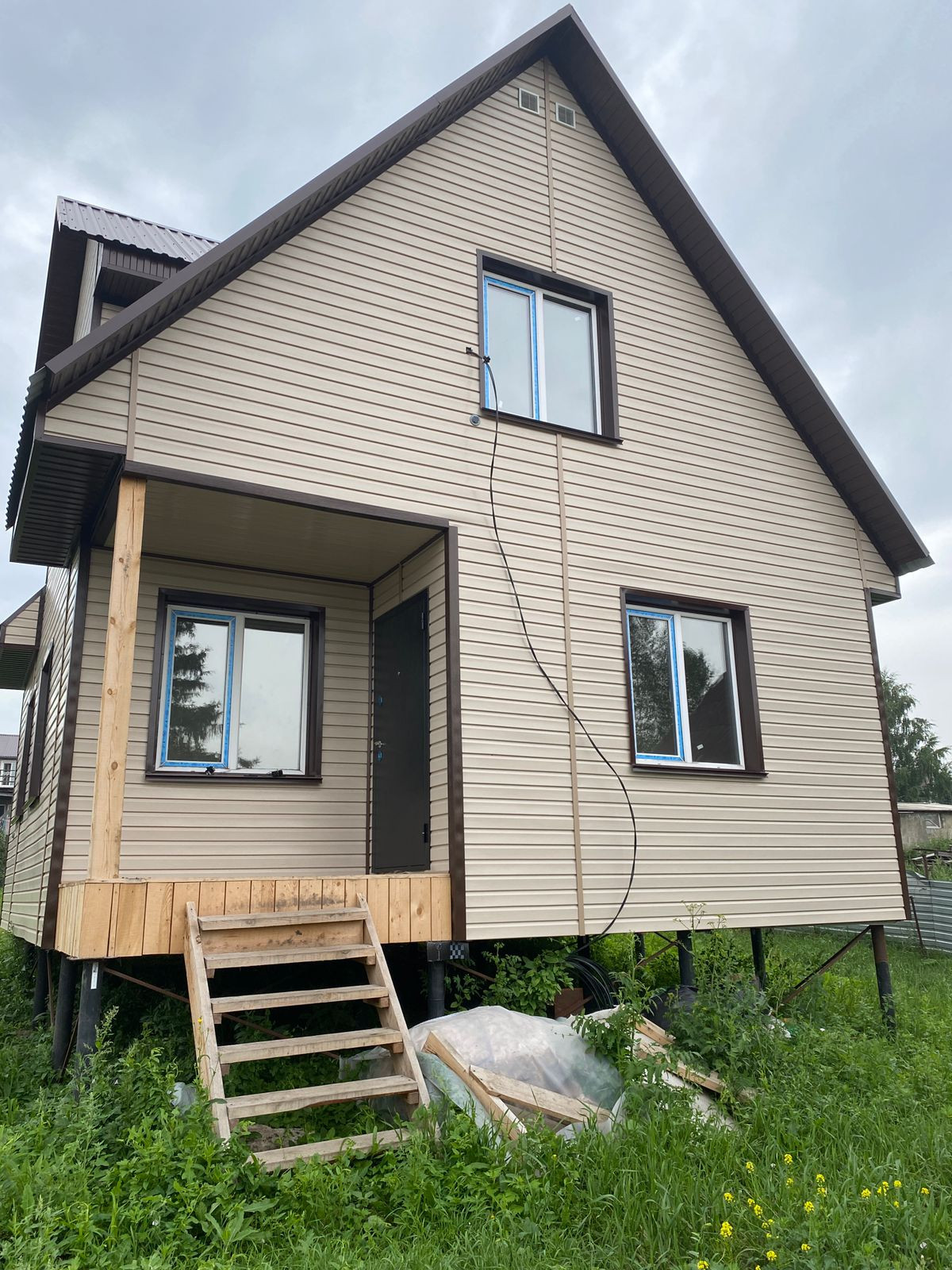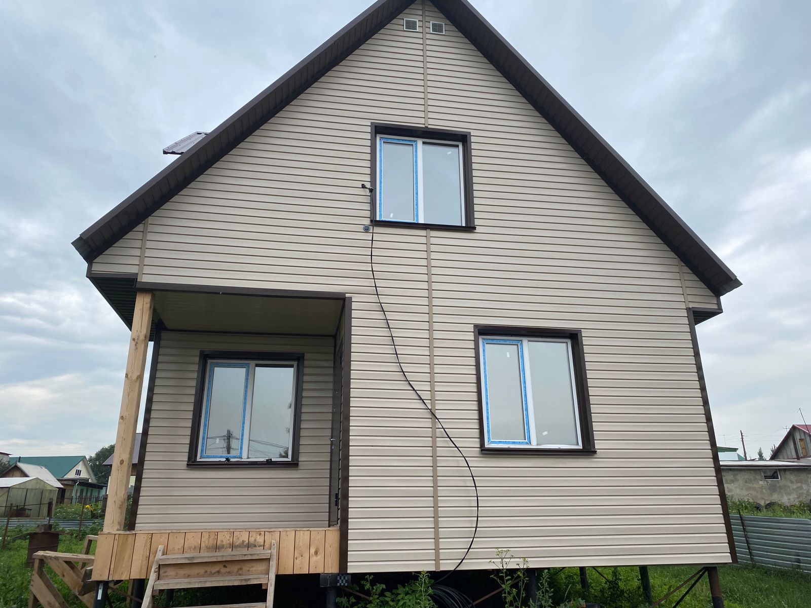 Продается новый дом на основе деревянного каркаса. В состав стены входит каркас утеплитель, защитные пленки с обеих сторон, облицовка наружной стены сайдингом.