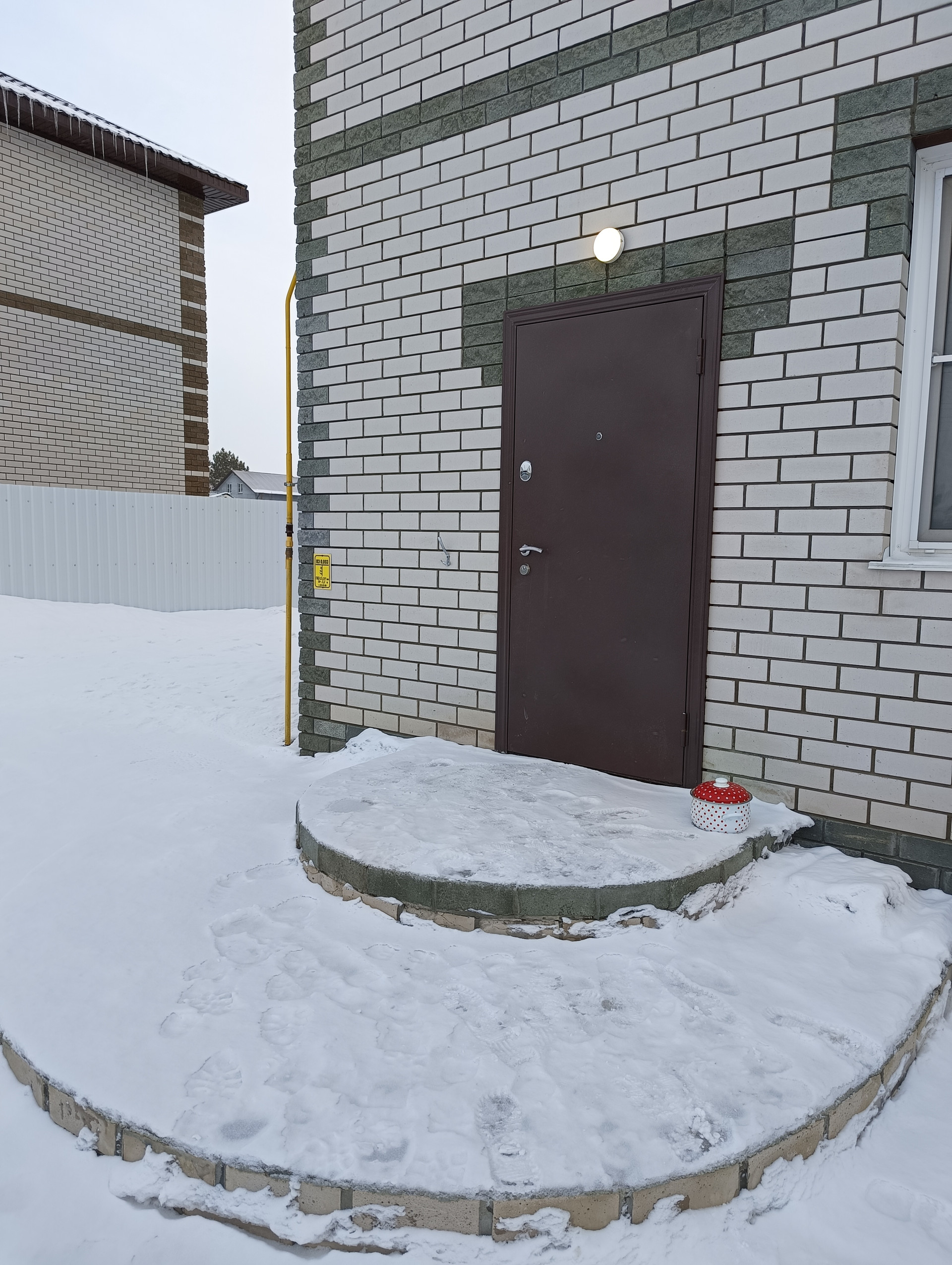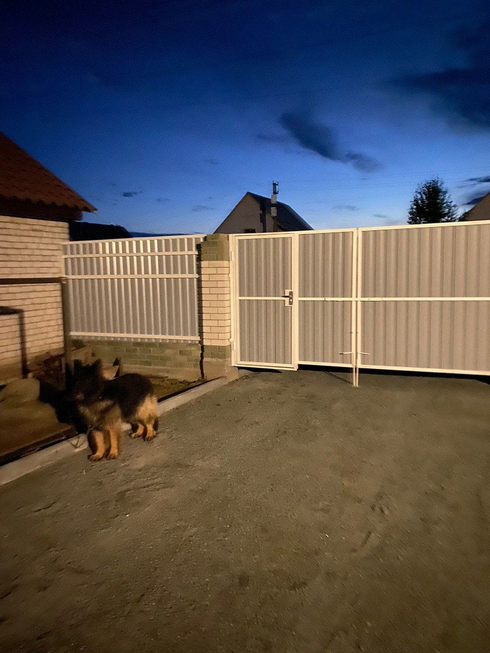 - Забор на кирпичном фундаменте с двумя воротами. Вольер для собаки. Придомовая территория отсыпана мелким отсевом.