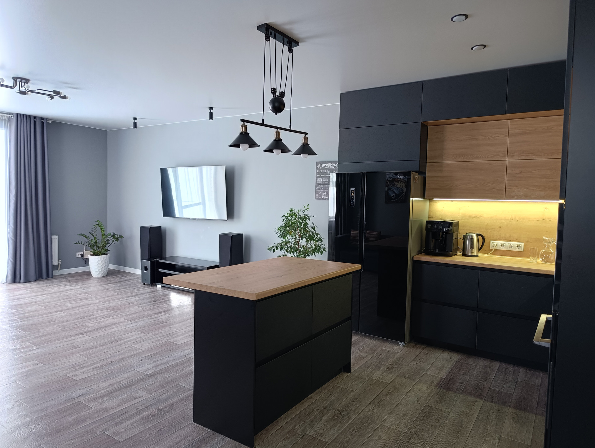 - Во всем доме светильники с несколькими световыми режимами, регулируются с пульта.