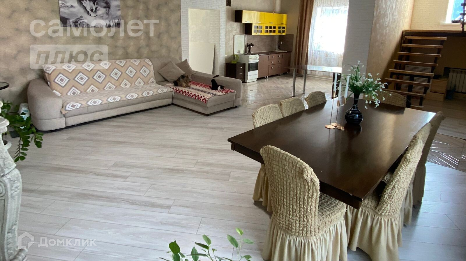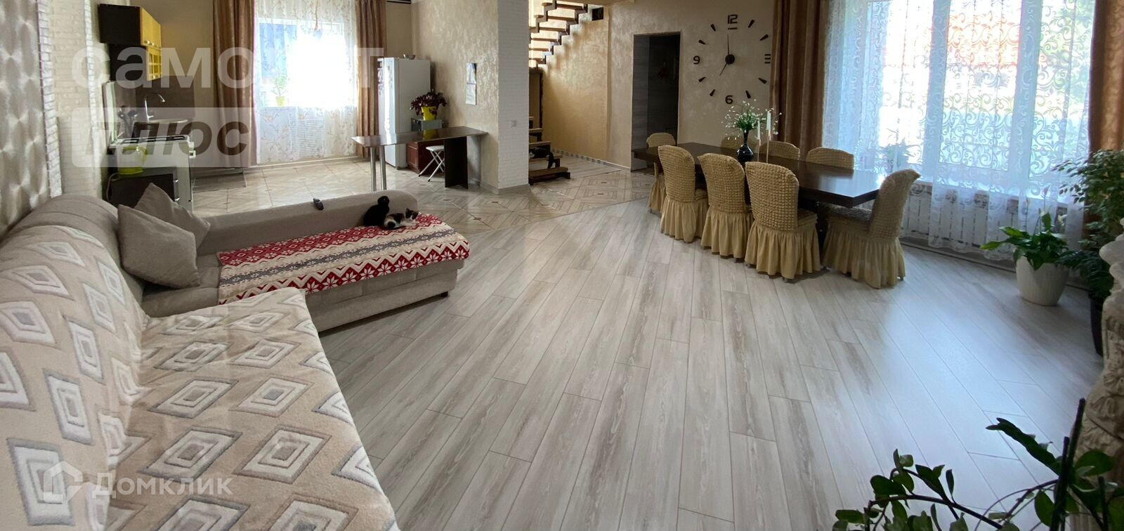 - На первом этаже просторная и светлая кухня-гостиная, комната и раздельный сан узел. Также есть выход из дома в огород. По всему периметру первого этажа установлены теплые полы.