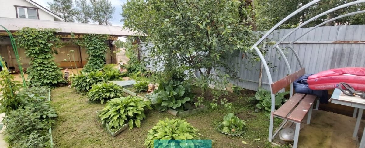 На участке расположены плодовые деревья, смородина, малина, клубника, красивые цветущие кустарники.