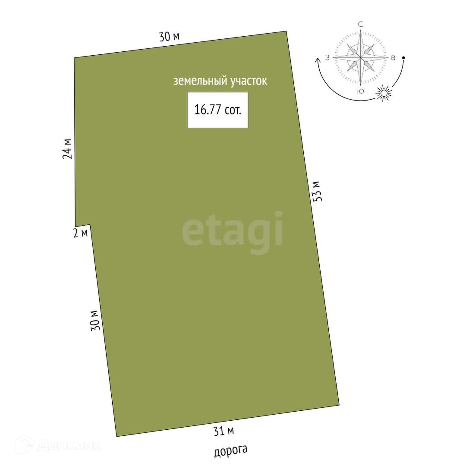Участок ровной прямоугольной формы, 16,8 соток. Категория: земли населенных пунктов, вид разрешения: для индивидуального жилищного строительства. Огорожен невысоким забором. Есть возможность построить гараж, парковочные места.
