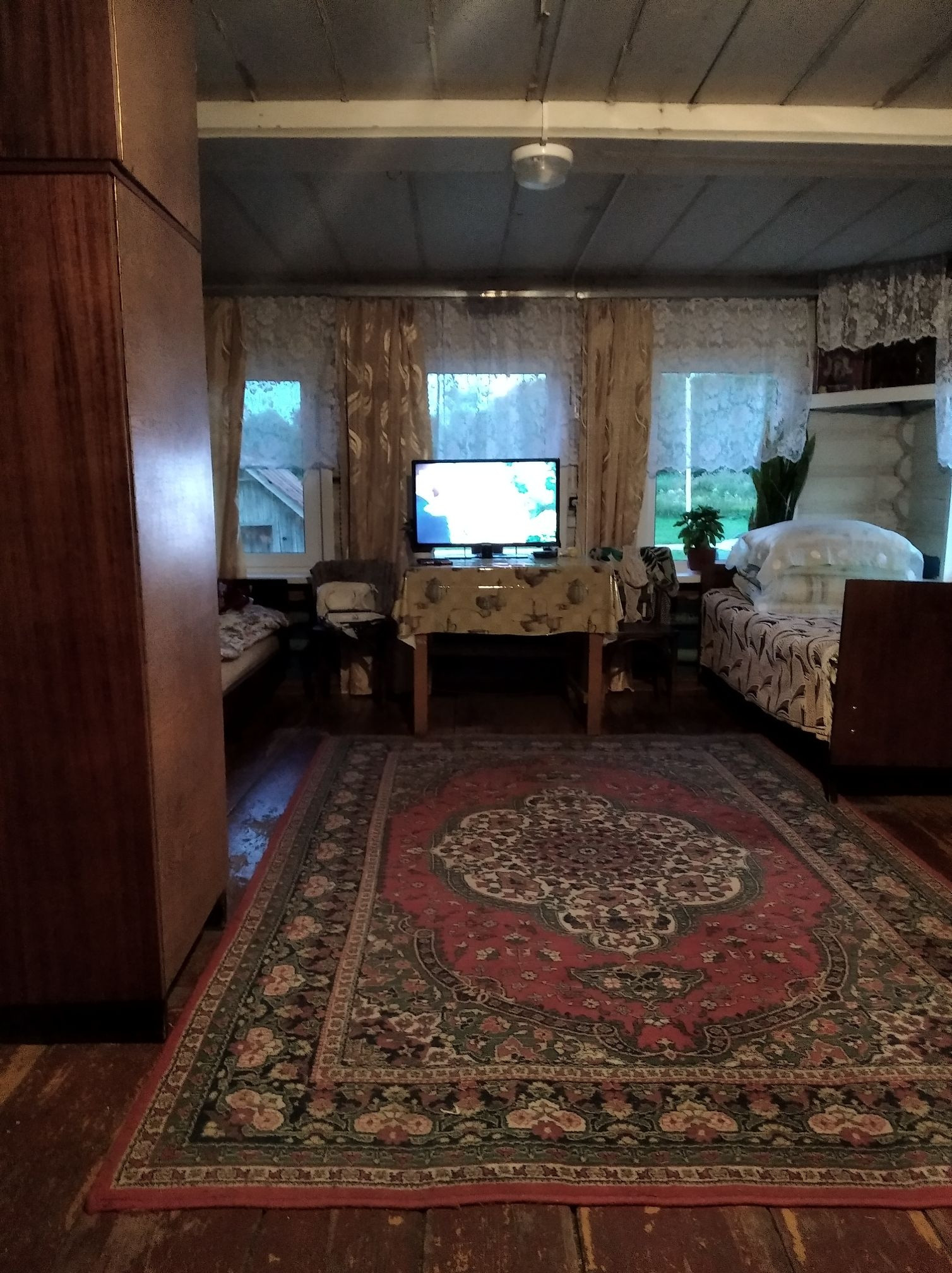 дом бревенчатый на фундаменте, окна пластиковые, крыша шифер имеется баня кирпичная, огород посажены яблони и кусты смородины черной и красной, есть погреб для хранения овощей и фруктов, рядом лес места грибные и ягодные, есть пруды где можно ловить рыбу, подъезд к дому хорошей, дом пригоден для постоянного проживания