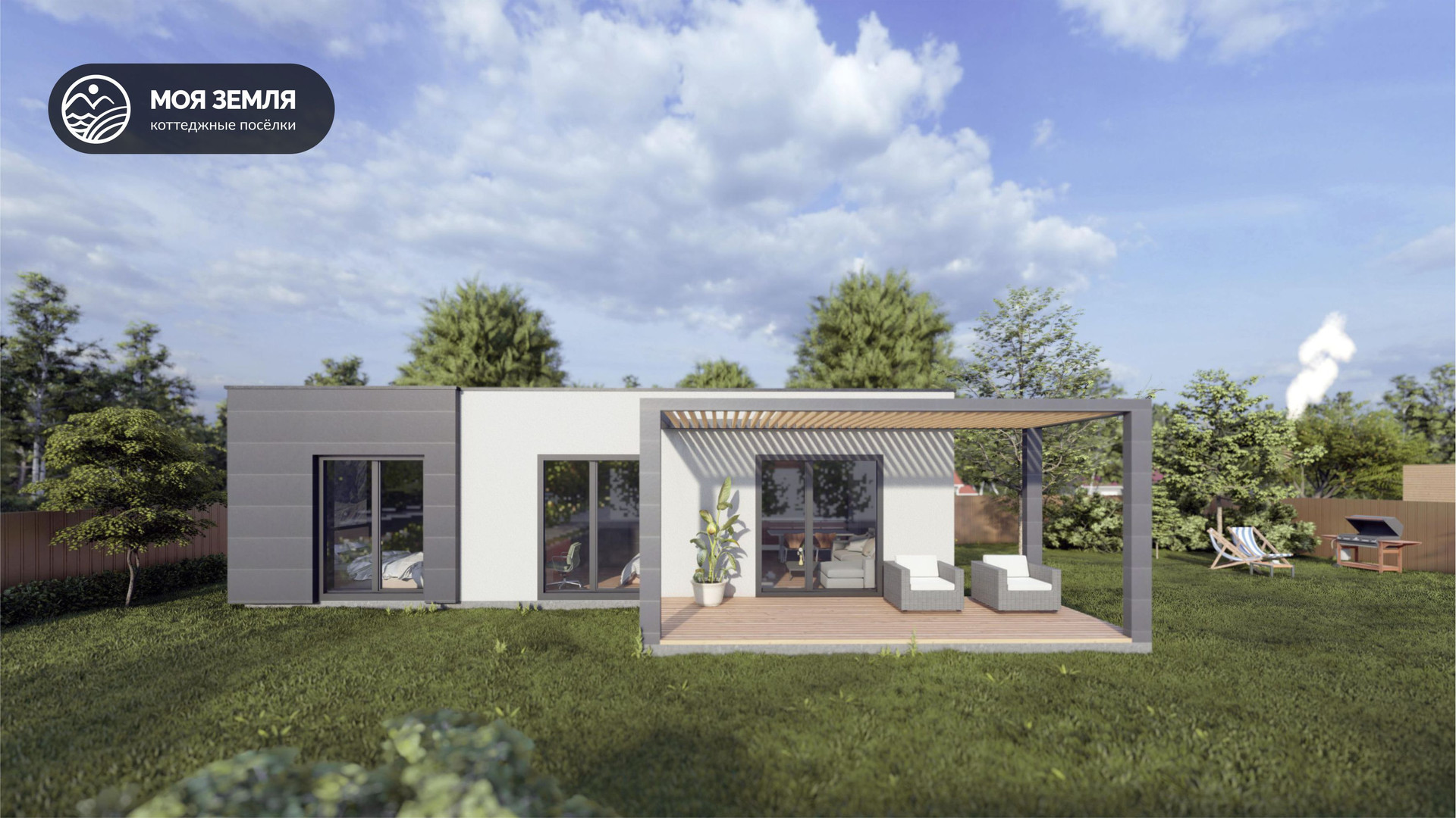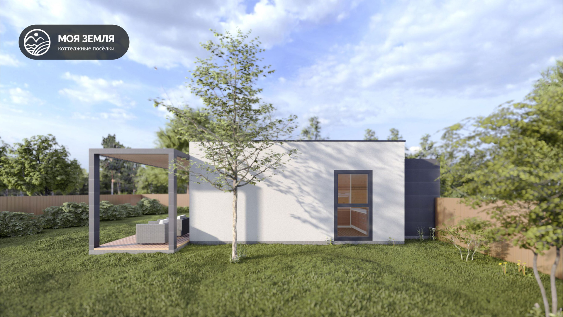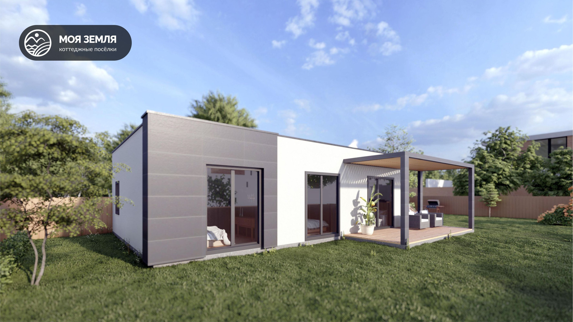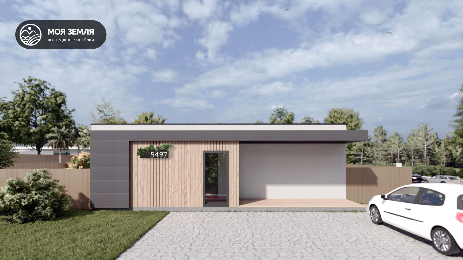Внешние элементы: вентилируемый фасад из фиброцементных панелей;