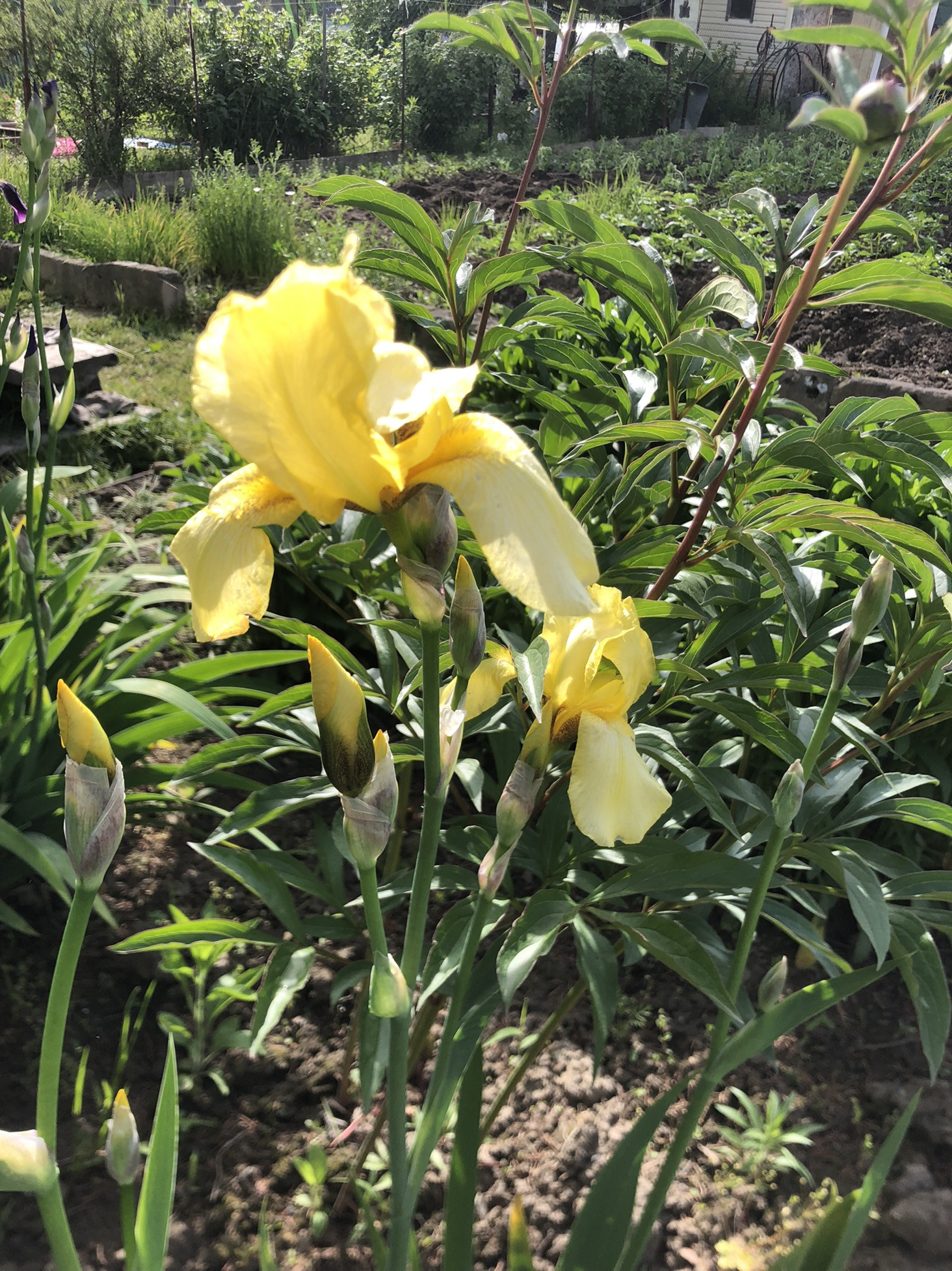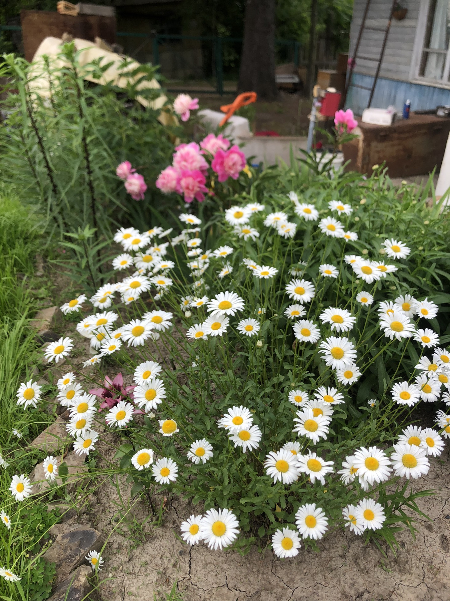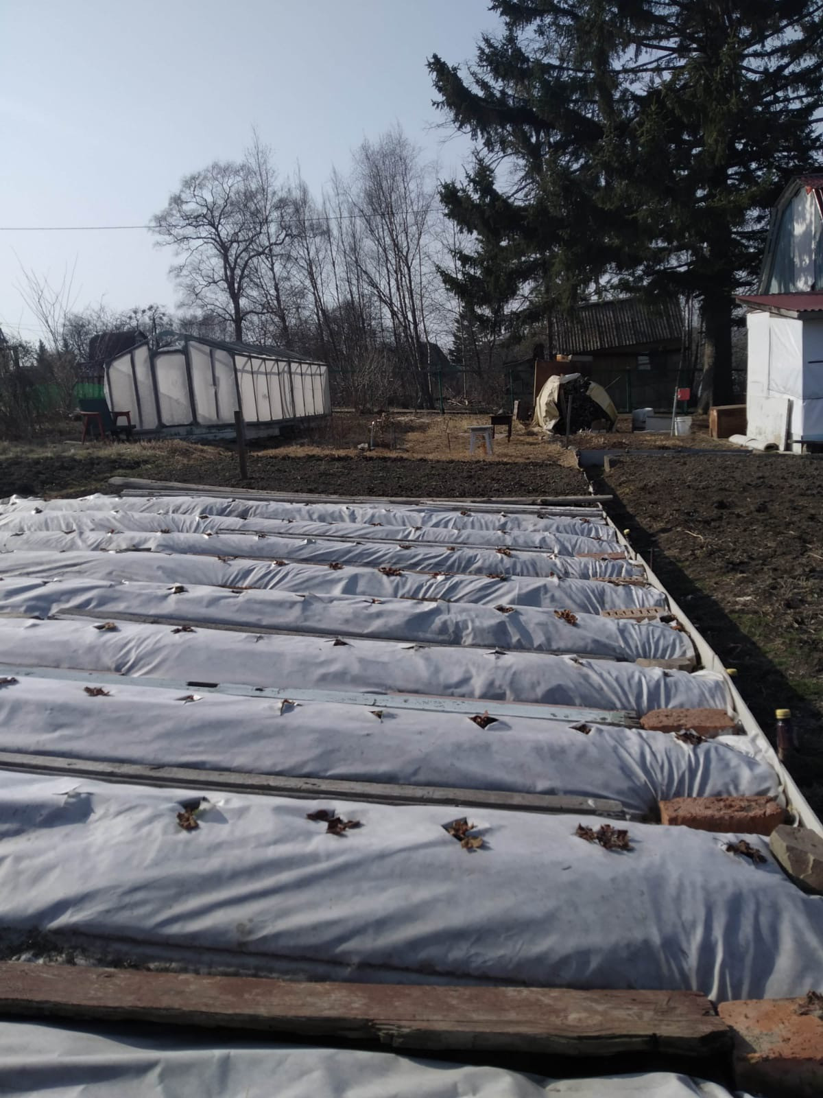 Под агротекс посажена клубника сортовая в прошлом году, три года можно не пересаживать, уход минимальный, урожай ранний. Растут три больших куста крупной не кислой смородины и два маленьких, есть красная и белая смородина, крыжовник, малина , ежемалина, молодая жимолость, приморский виноград, слива. Кусты все осенью удобрены. Посажен озимый чеснок. Из декоративных посадок: сирень, рододендрон, можжевельник, гортензия, пионы, лилии, ирисы, ромашки, хоста, очиток, роза, лужайка с декоративным газоном. У дома большая ель, на участок тень не даёт.