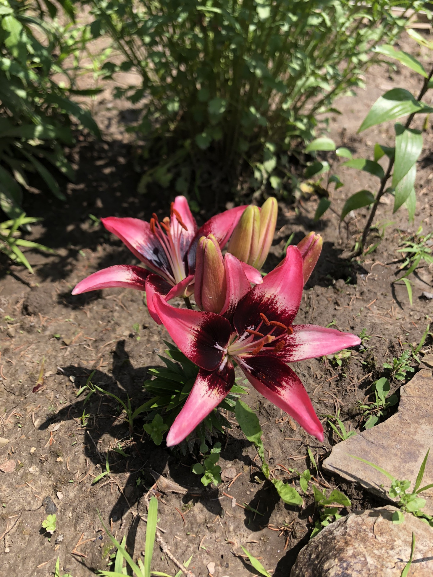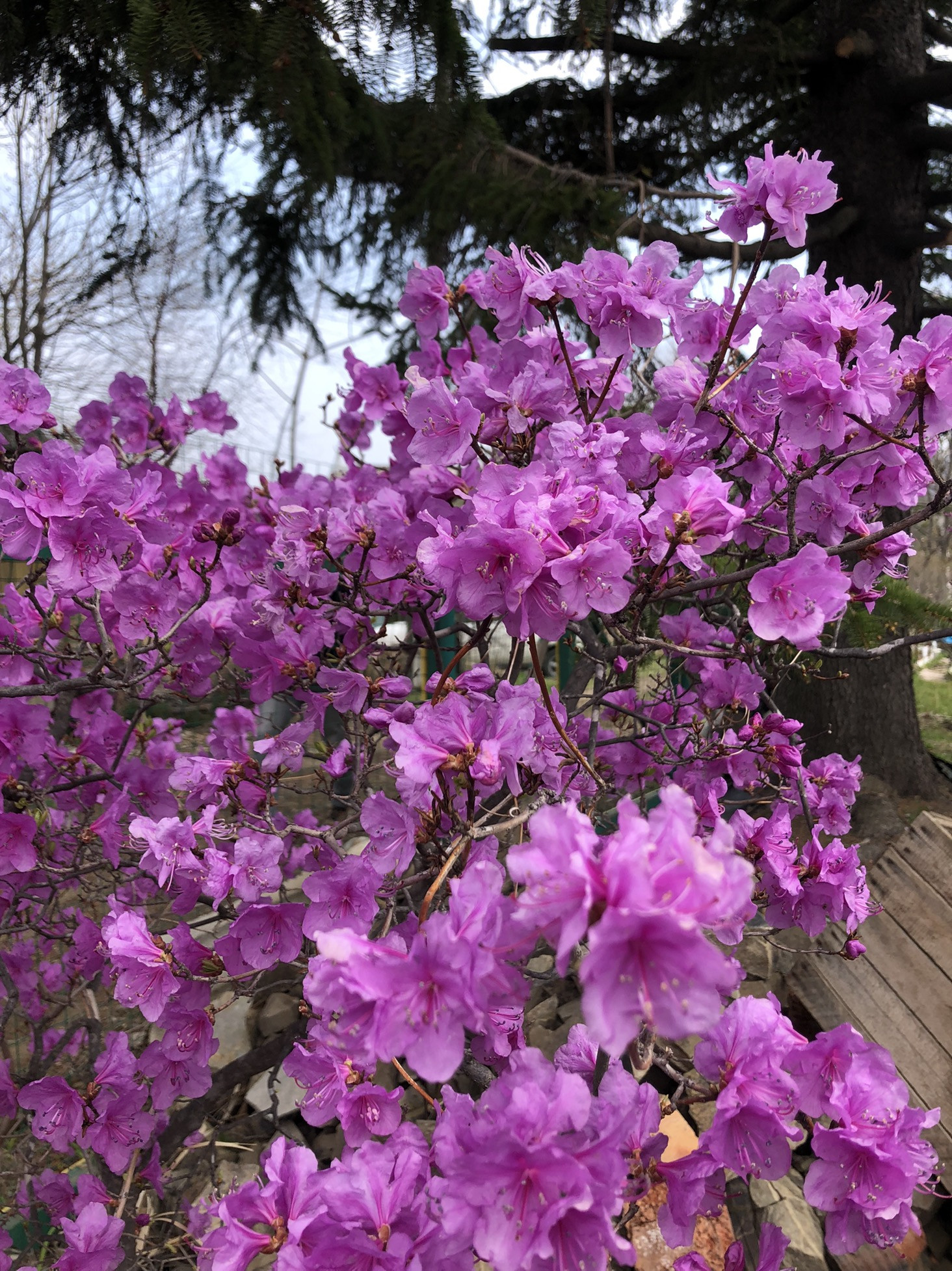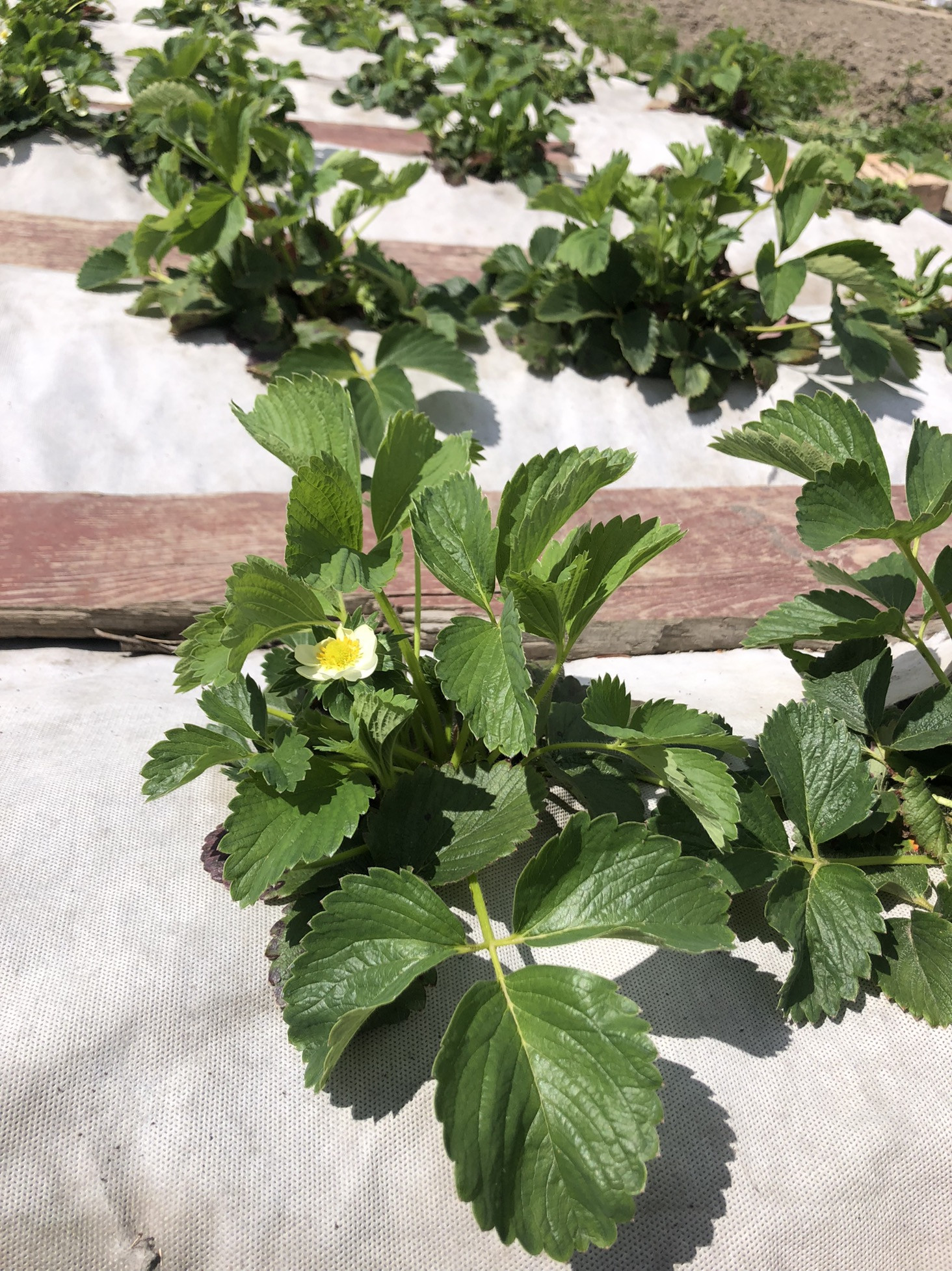 Под агротекс посажена клубника сортовая в прошлом году, три года можно не пересаживать, уход минимальный, урожай ранний. Растут три больших куста крупной не кислой смородины и два маленьких, есть красная и белая смородина, крыжовник, малина , ежемалина, молодая жимолость, приморский виноград, слива. Кусты все осенью удобрены. Посажен озимый чеснок. Из декоративных посадок: сирень, рододендрон, можжевельник, гортензия, пионы, лилии, ирисы, ромашки, хоста, очиток, роза, лужайка с декоративным газоном. У дома большая ель, на участок тень не даёт.