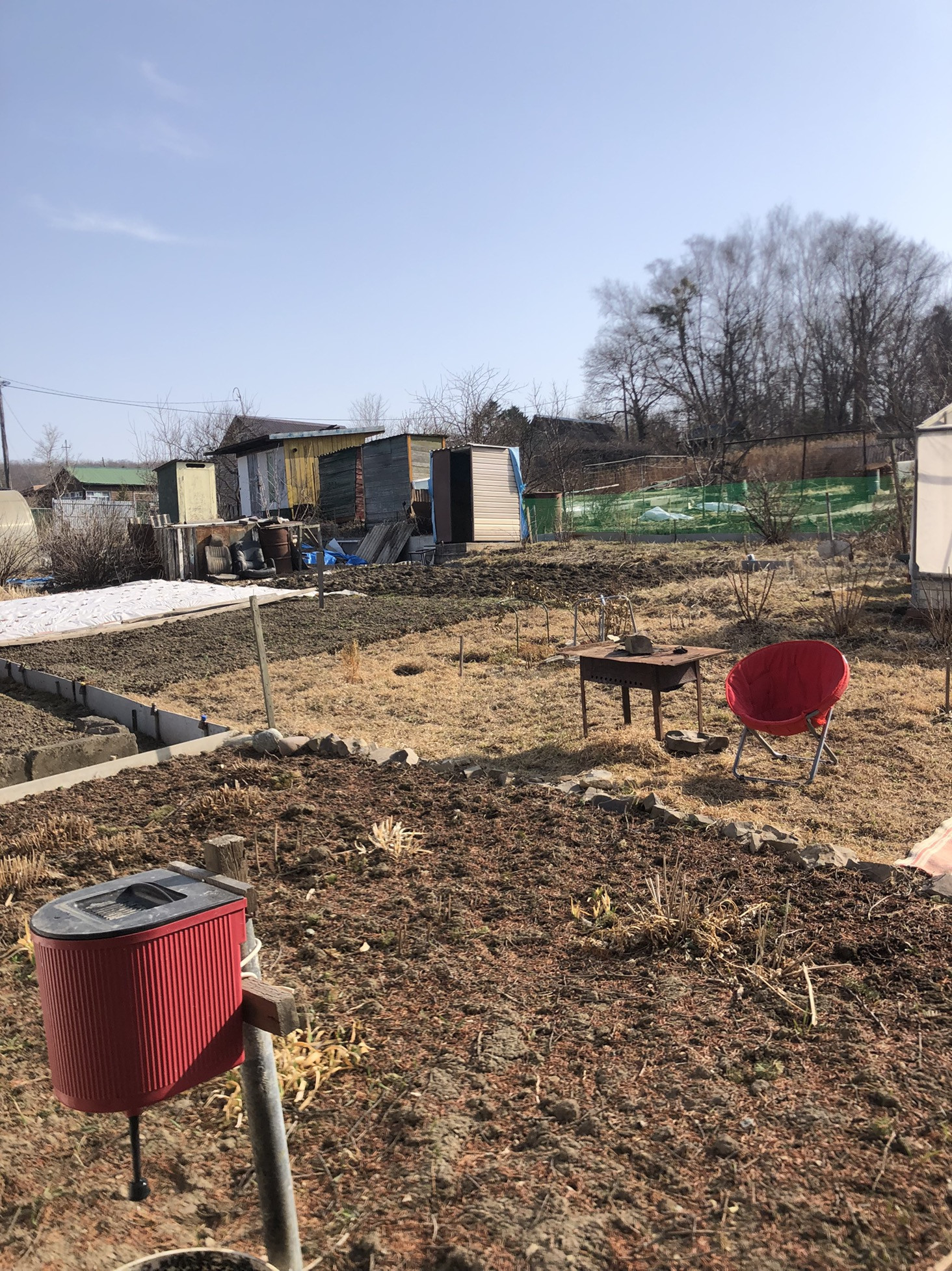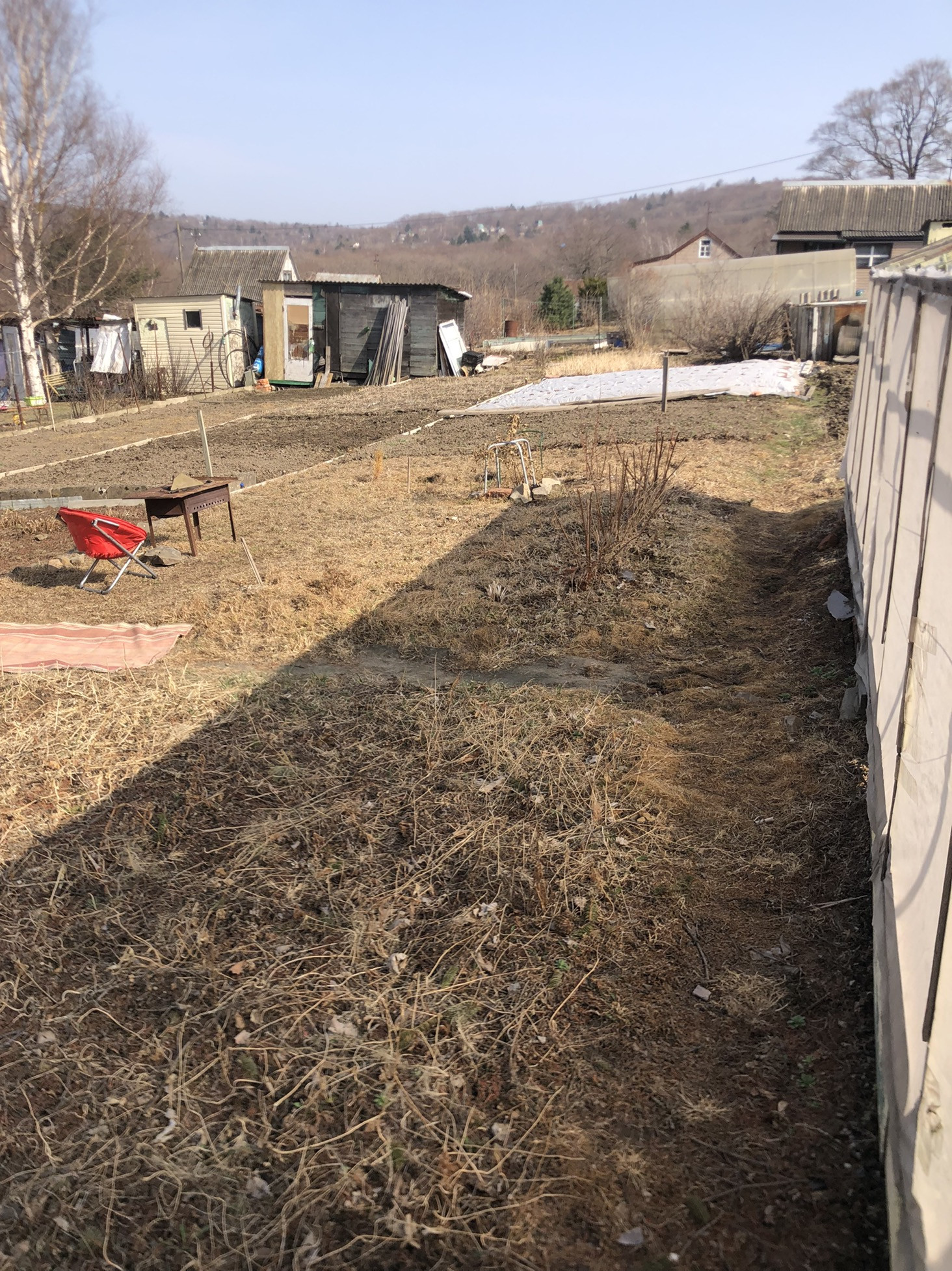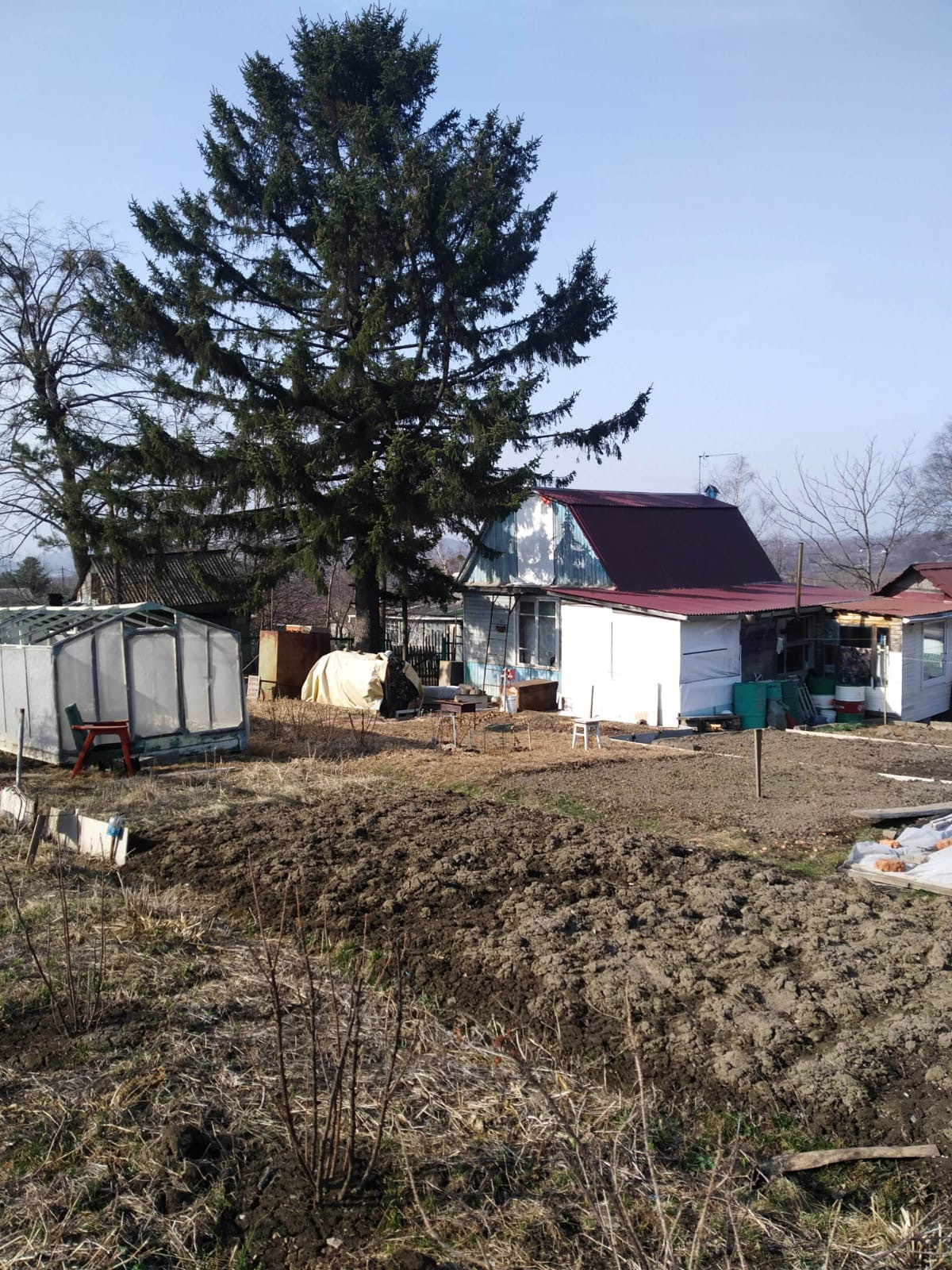 Из построек на участке: туалет, душ, сарай, залит фундамент под новый сарай, деревянная теплица.