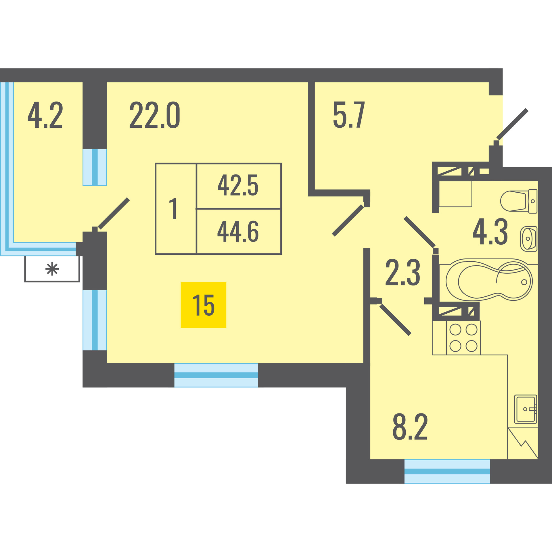 Общая площадь 43.5 м2