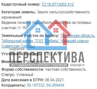 Параметры :общая площадь 13 соток , для ведения личного подсобного хозяйства .