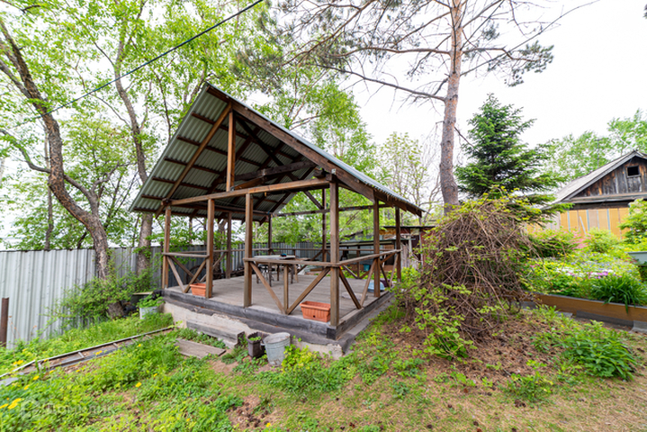 На территории : гараж, два домика для отдыхающих, 2 технических помещения, летняя кухня, навес, дополнительный летний водовод от скважины, с подогревом. Участок разделен на две секции: посадочная зона и фруктовый сад, в зоне сада есть водоем. На участке имеется огромное количество фруктовых деревьев и кустарников : сливы, абрикосы, вишни, груши, яблоня, малина ремонтантная, клубника, дальневосточный орех, боярышник, калина, рябина, лимонник и т.д.