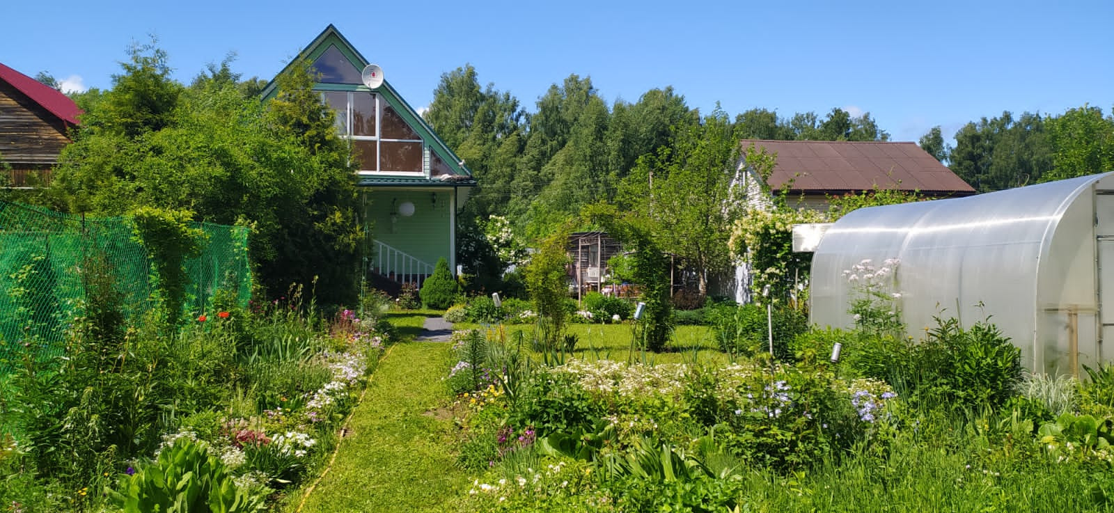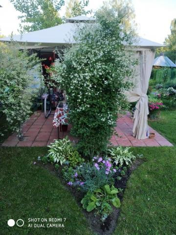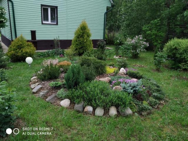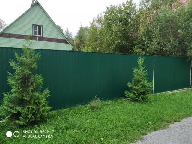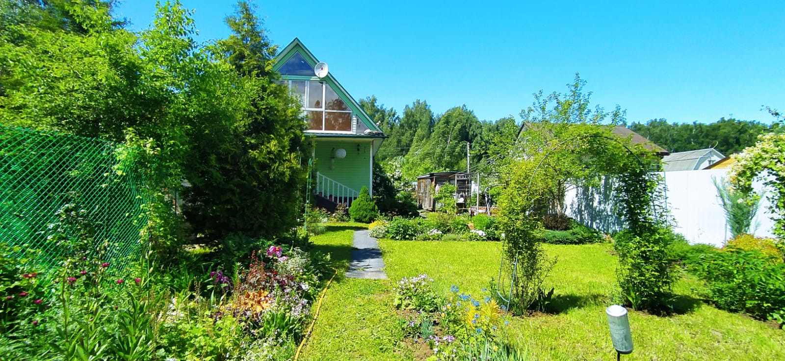 На участке сделан ландшафтный дизайн, плодовые деревья, кусты, клумбы, клубника. На участке также есть хоз. постройки, летний душ. Участок огорожен забором, 2 калитки, ворота. Машиноместо на участке.