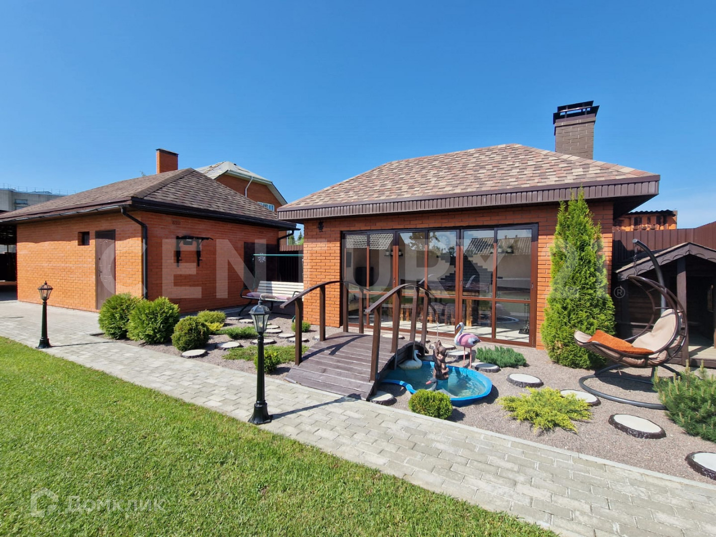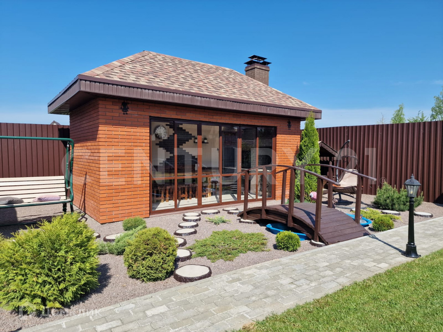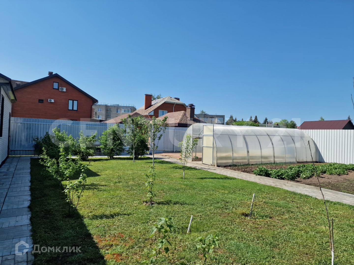 Участок 12 соток, земли населенных пунктов, ИЖС. Правильной формы, огорожен со всех сторон.  Идеально ухожен. Рядом с домом - просторный навес и кирпичный гараж. Разделен на две зоны - зону отдыха (лужайка с газоном, беседка с кухней и барбекю) и хозяйственную зону (хоз. постройки, теплица, огород и сад).