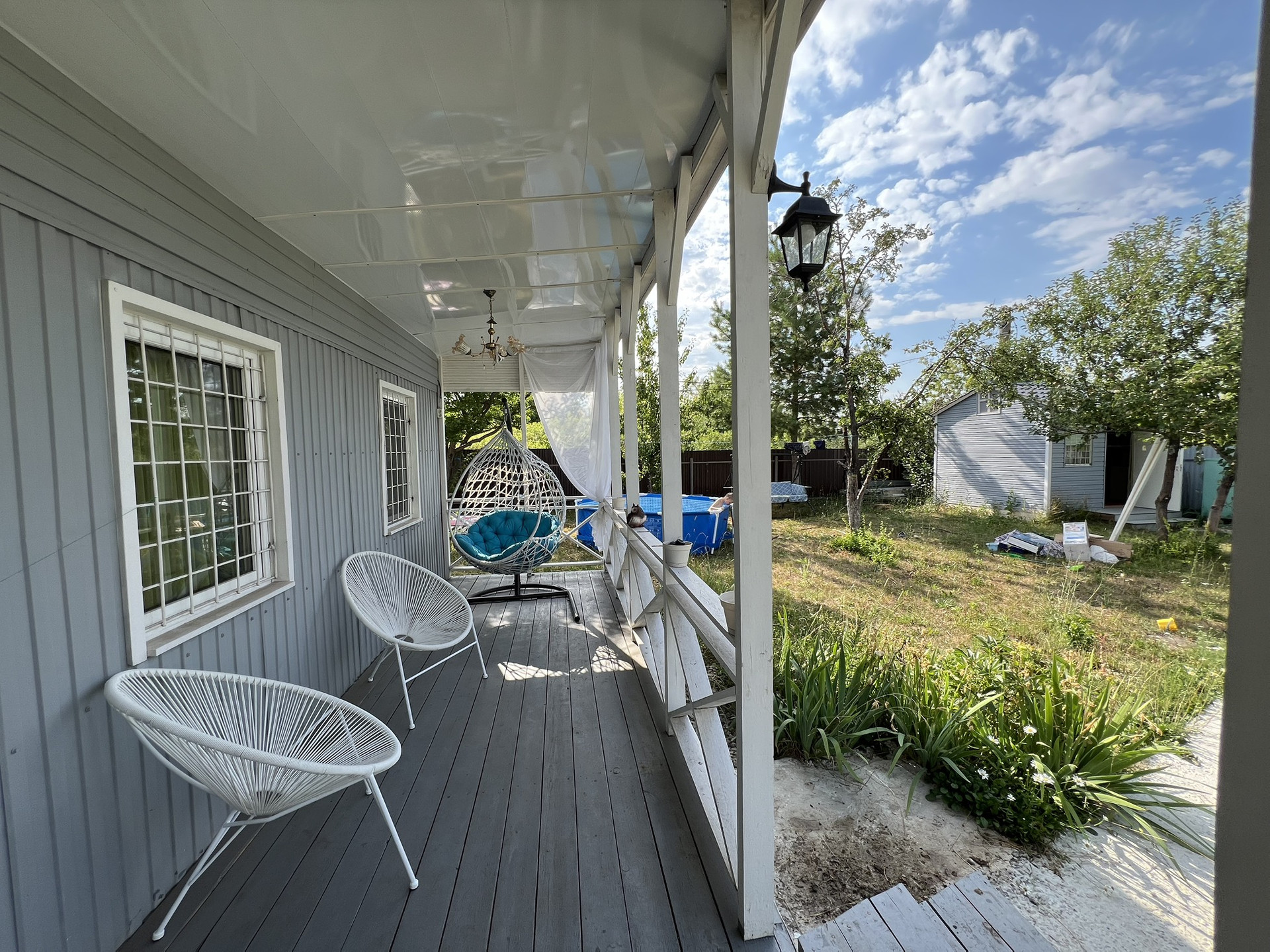 Современная дача для отдыха: качели, бассейн, бетонная парковка на два авто, бетонные дорожки.