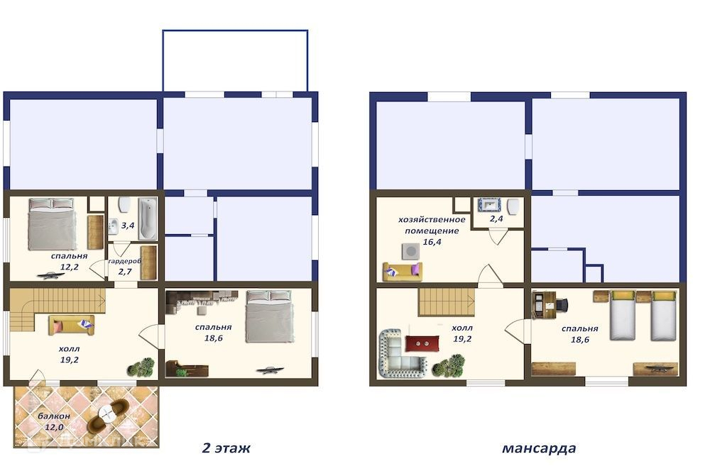 2 этаж: холл, 2 спальные комнаты, с/у, балкон.