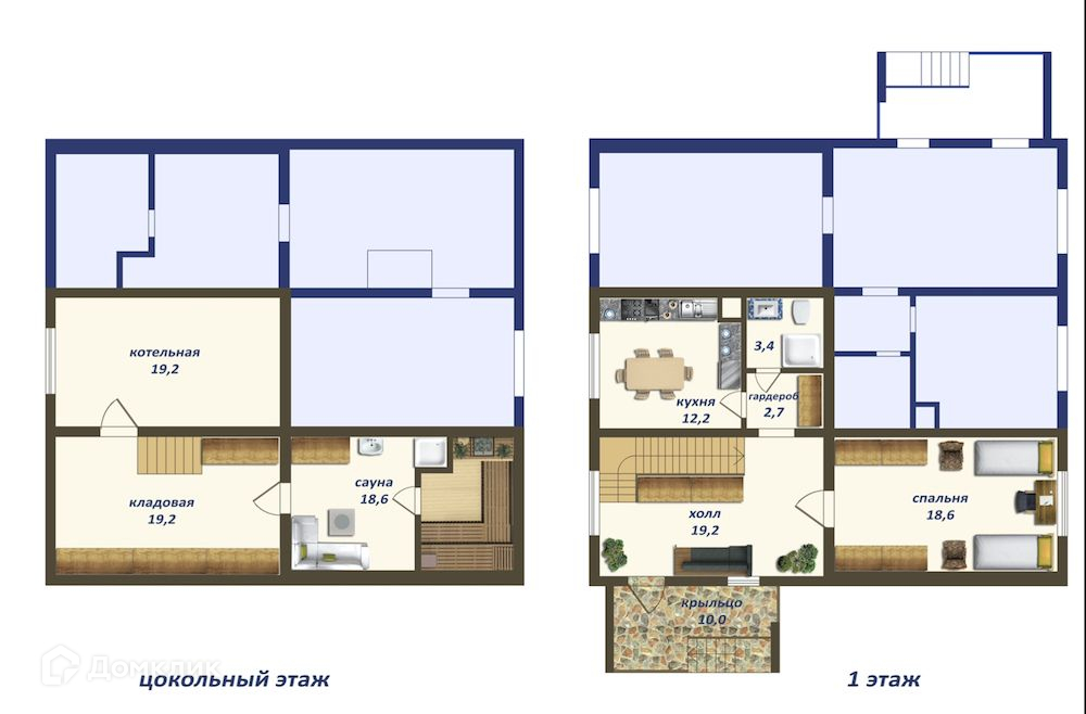 Цокольный этаж: 3 подсобных помещения, под сауну, душевую и комнату отдыха.