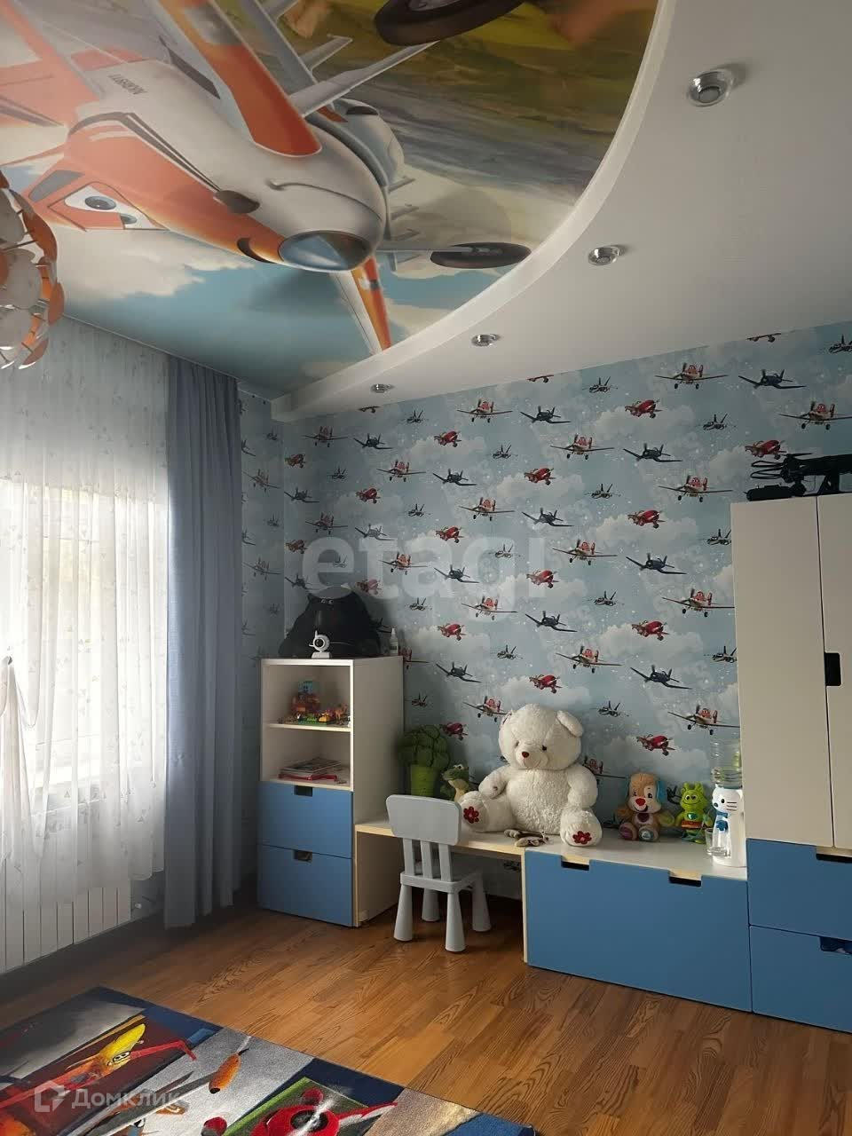Трехэтажный дом, на первом кухня столовая, гостевой санузел, гостевая спальня, игровая с возможностью выхода на участок. На втором этаже хозяйская большая спальня с гардеробной комнатой санузлом и сауной, две детские комнаты, кинотеатр и спортивный зал. На третьем этаже большая игровая зона, и еще одна комната, в хозяйской спальне вся мебель произведена из дуба, а так же кухня, прихожая и полы.