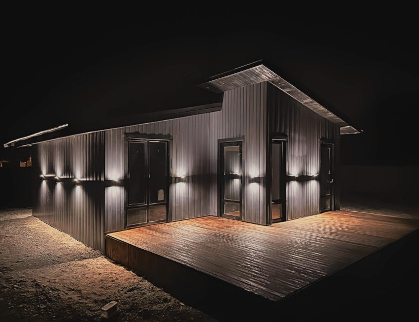 Дом каркасного типа с современной внешней отделкой и освещением фасада по периметру.