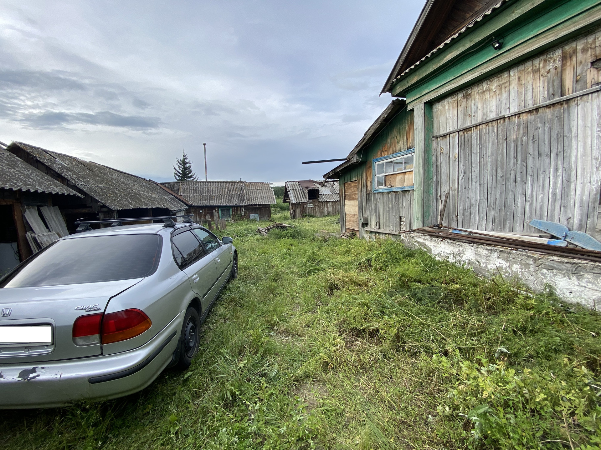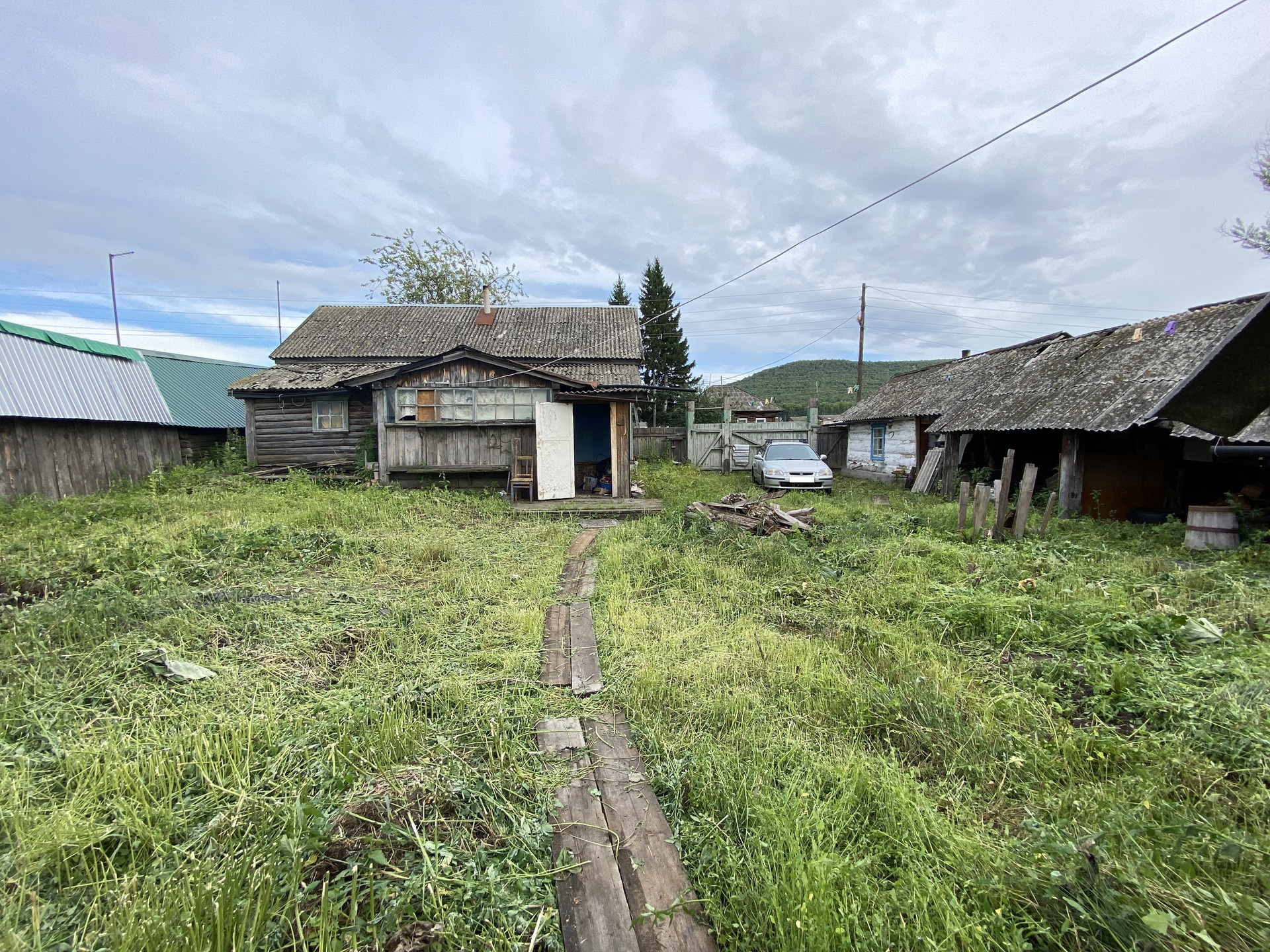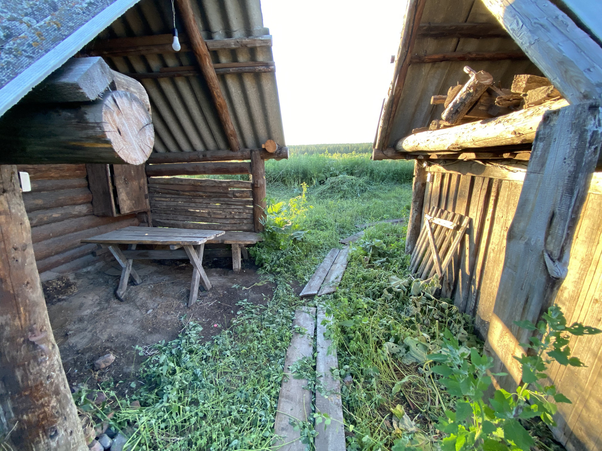 Дом, летняя кухня и баня из кругляка. Из доп. построек - крольчатник (как идти в сторону туалета, справа), курятник (пристроен к бане), под навесом дровяник (возле летней кухни).