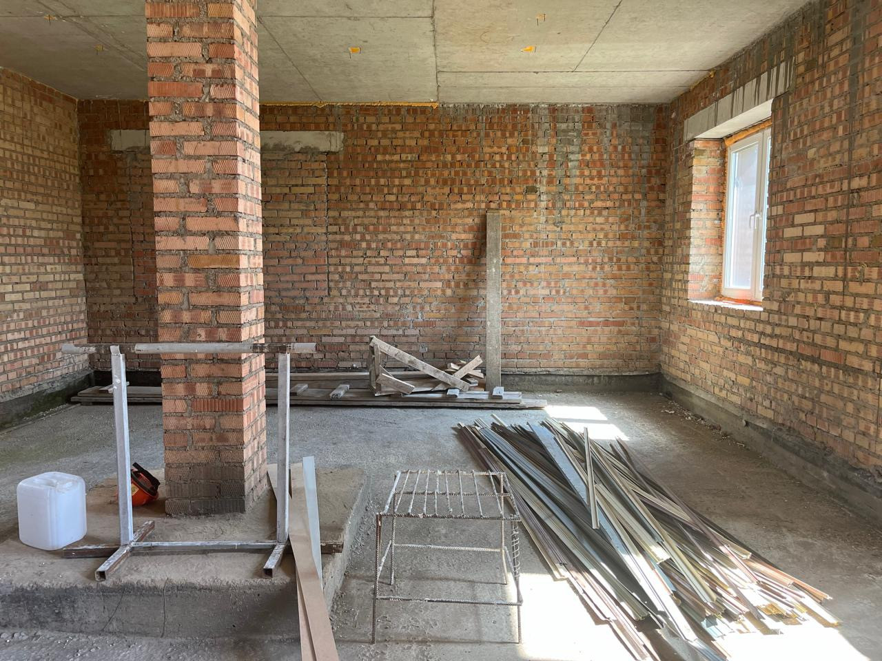 Кирпич,гараж на одно авто, кухня гостиная, санузел.