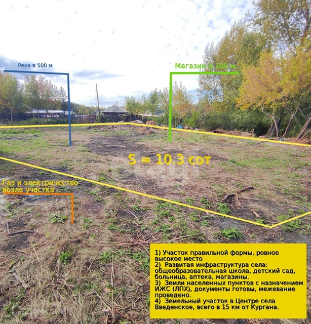 Продается земельный участок в Центре села Введенское, всего в 15 км от Кургана. 10 соток земли правильной формы, ровное высокое место, плодородная земля. Все коммуникации по улице: электроэнергия и газ! Хорошо развитая инфраструктура села: общеобразовательная школа, детский сад, больница, аптека, магазины. Земли населенных пунктов с назначением ИЖС (ЛПХ), документы готовы, межевание проведено.Помощь в одобрении ипотеки по Госпрограмме под 7,3% на покупку и строительство жилого дома! Заинтересовало предложение, Звоните!
