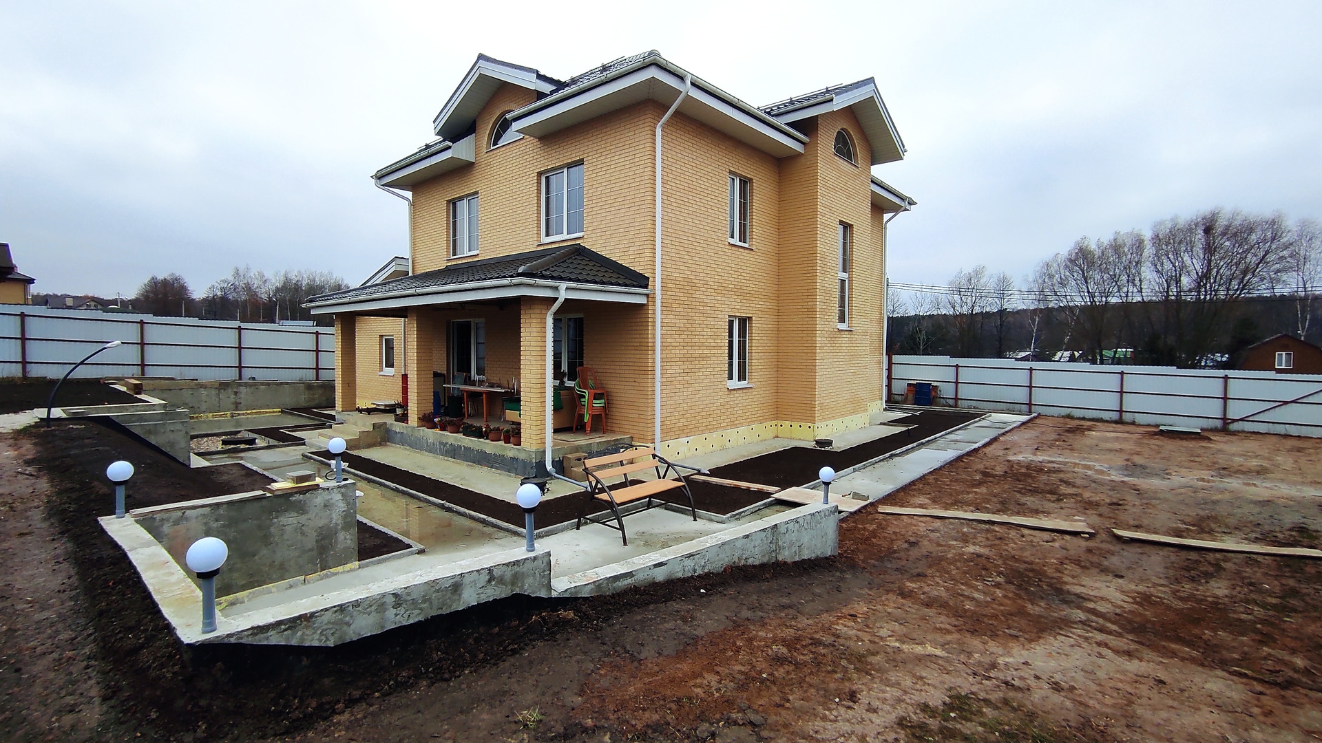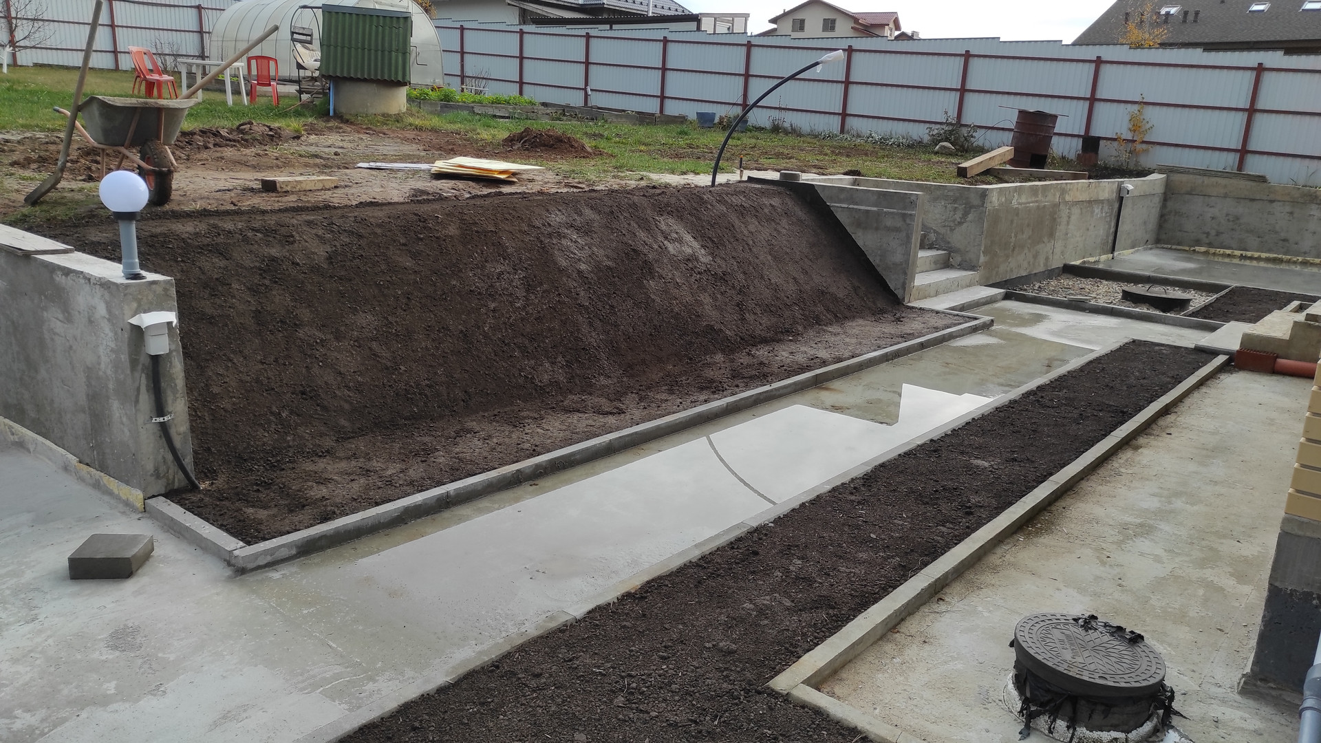 + Залиты бетоном: отмостка, подпорные стенки, дорожки и площадки под отделку брусчаткой.