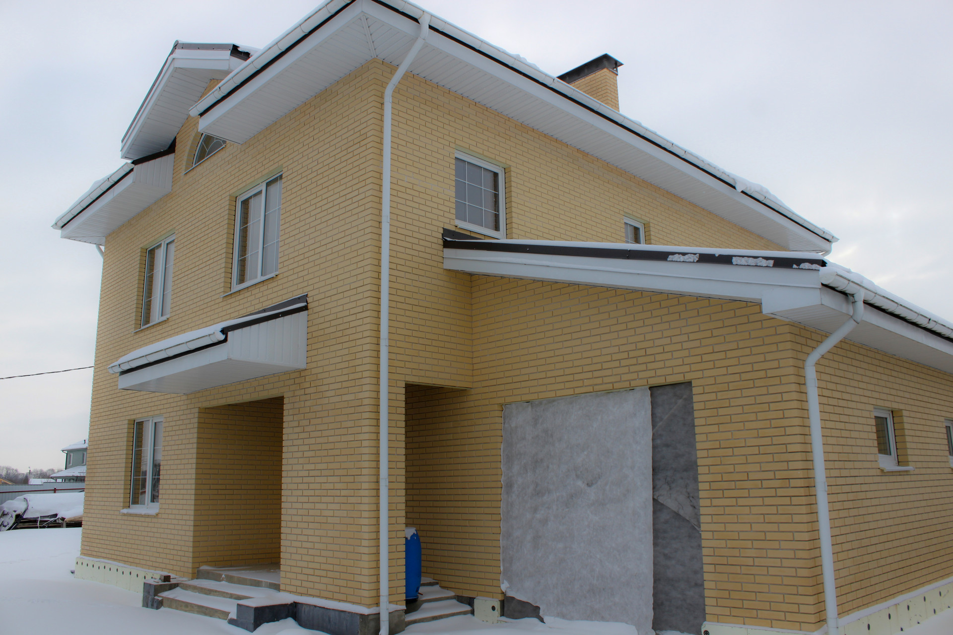 Пол 1 и 2 этажа, лестница монолитные. Чердачное перекрытие деревянные балки. Крыша металлочерепица Grand line classic quarzit lite rr32. Софиты, водостоки, трубы Grand line. Окна поворотно откидные Rehau Delight Design.