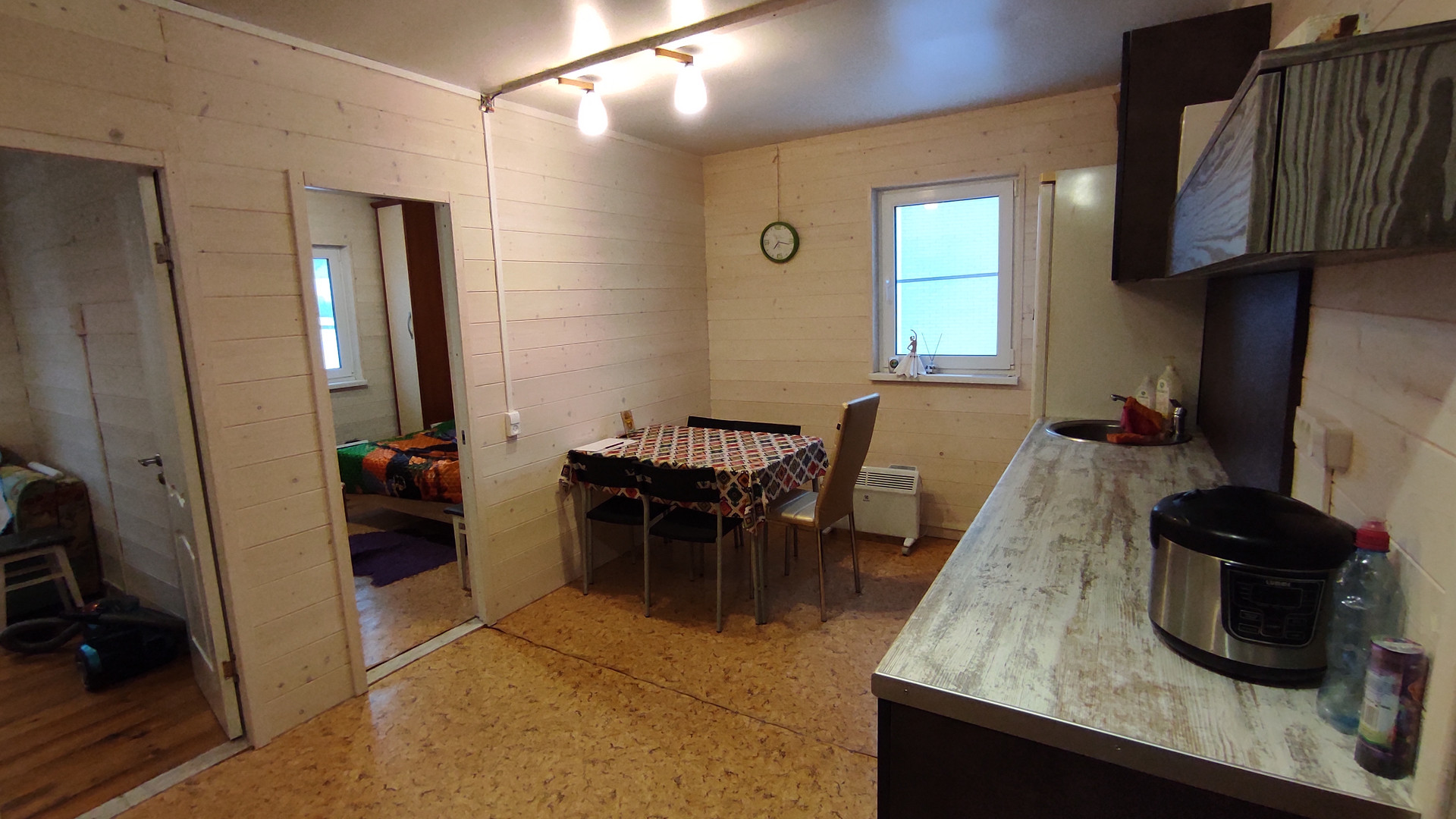 В теплое время года каркасный дом подключается к колодцу, который обеспечивает его водой. В каркасном доме имеется душ, туалет, стиральная машинка и все, что необходимо для проживания.