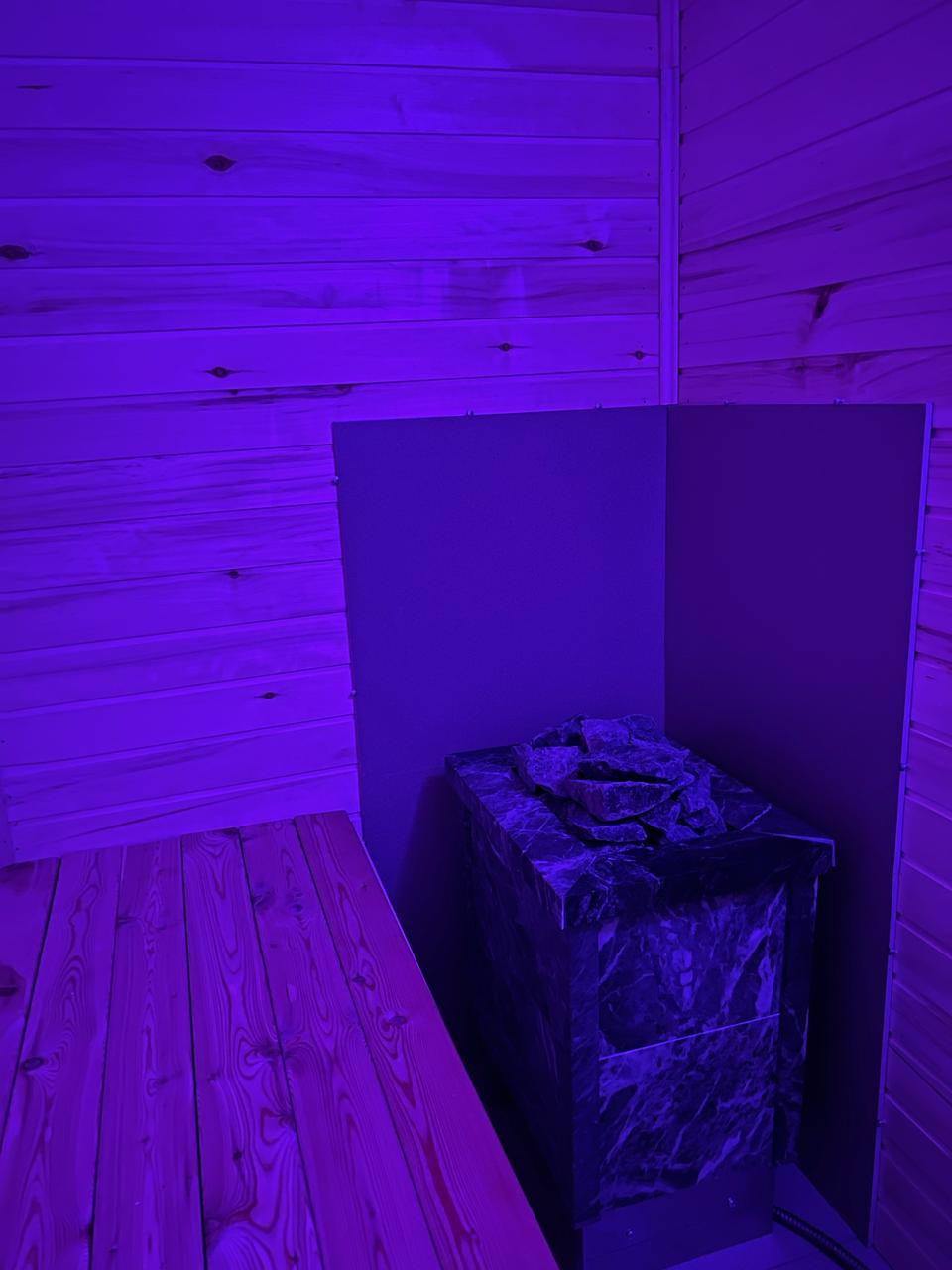 Сауна с электрокаменкой , отделана натуральным камнем «змеевик».