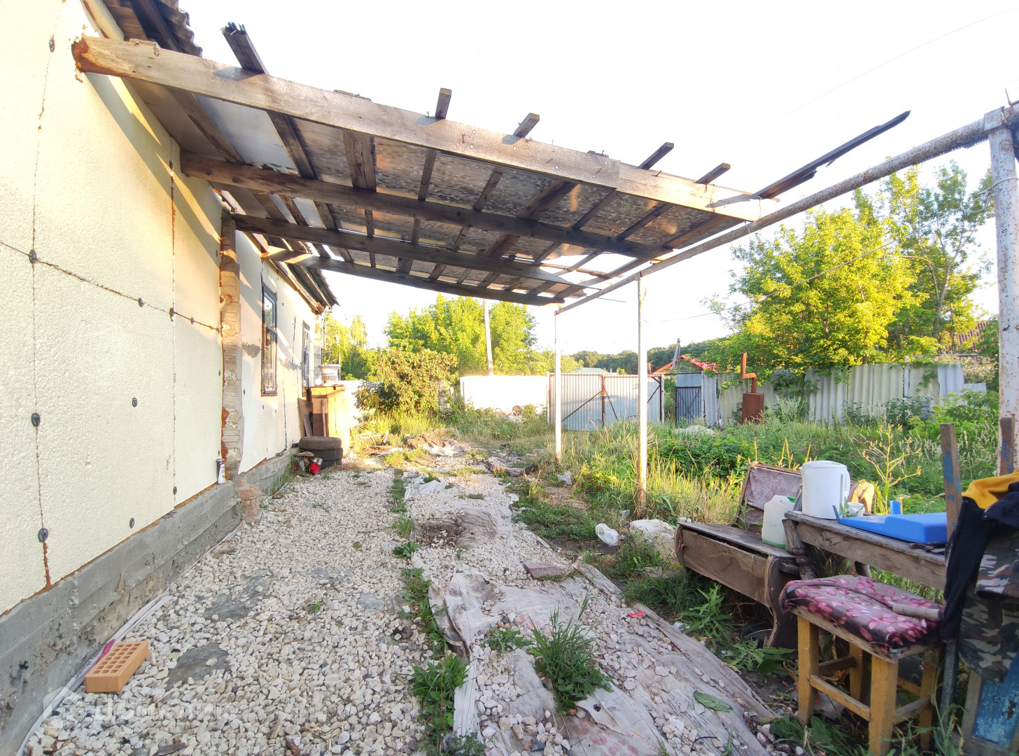 Стоянка, ворота, забор, есть навес у дома.