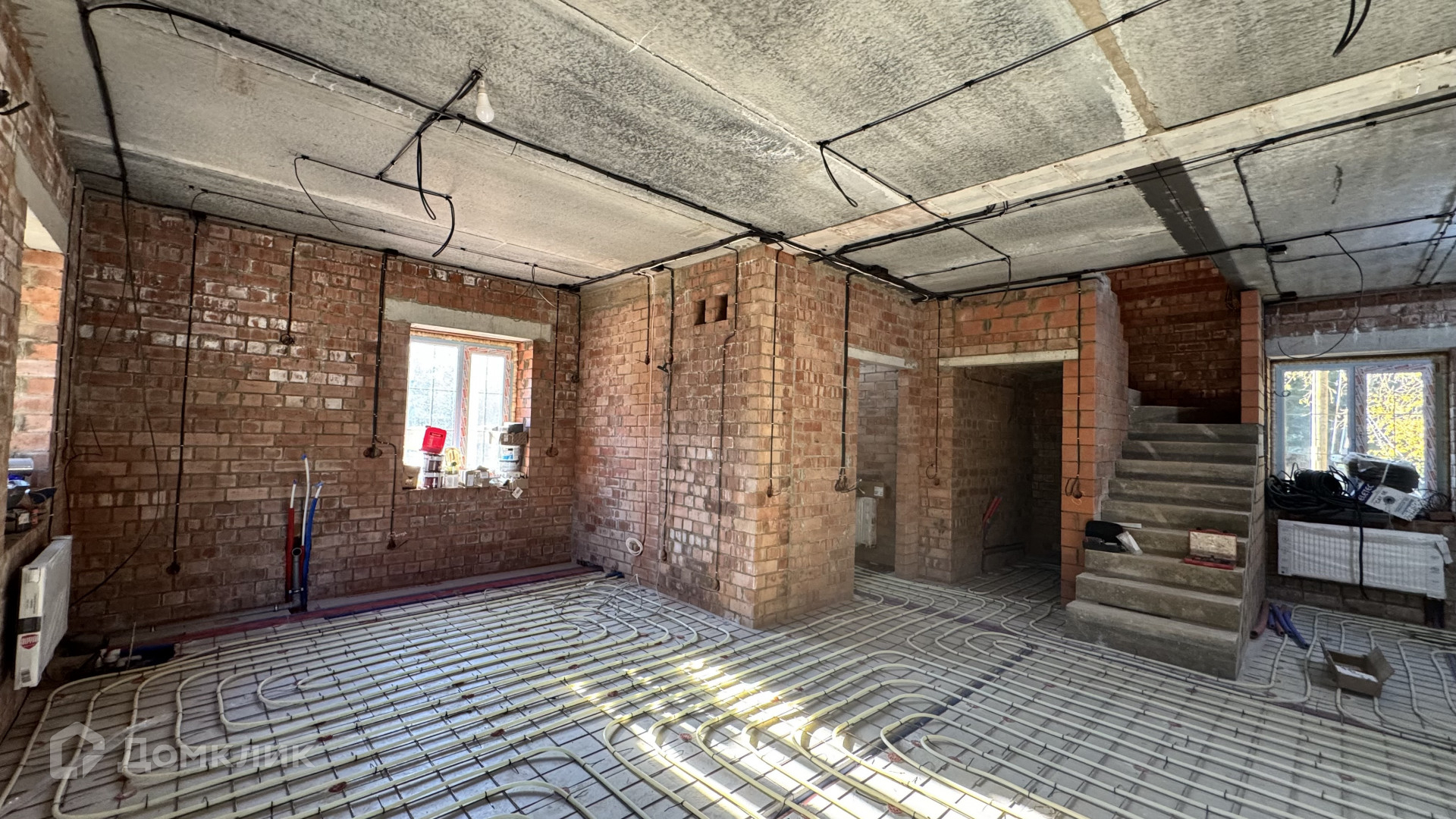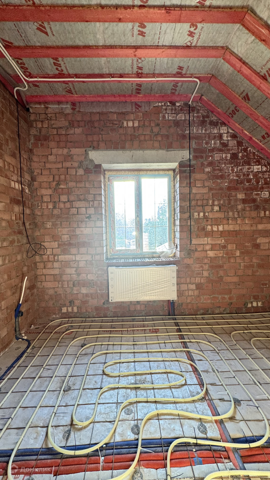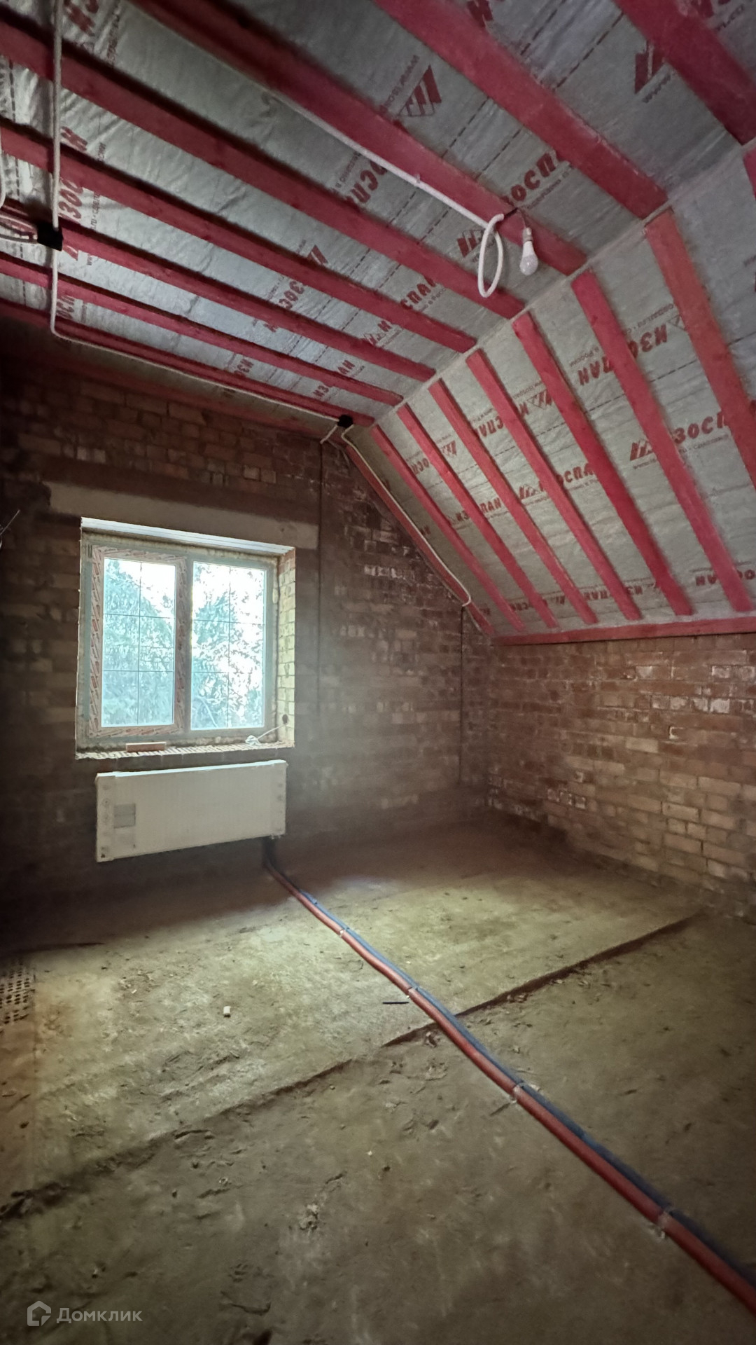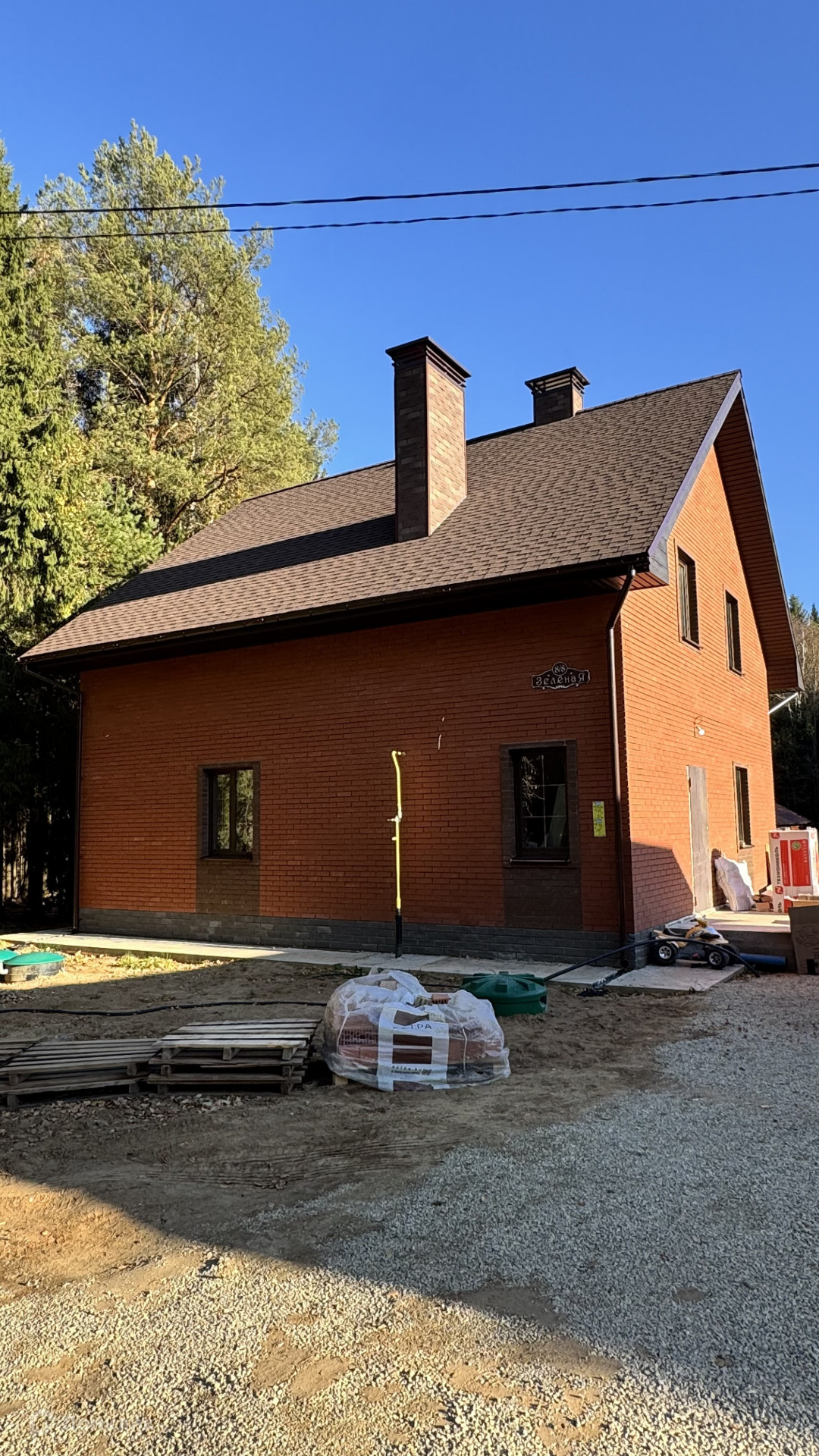 В дом заведен газ, скважина 43 метра, септик, сделаны работы: электрика, теплые полы, стяжка полов будет входит в стоимость, установлены котлы газовый и электрический, высокие потолки, есть выход на террасу, на втором этаже три спальни и санузел с окном