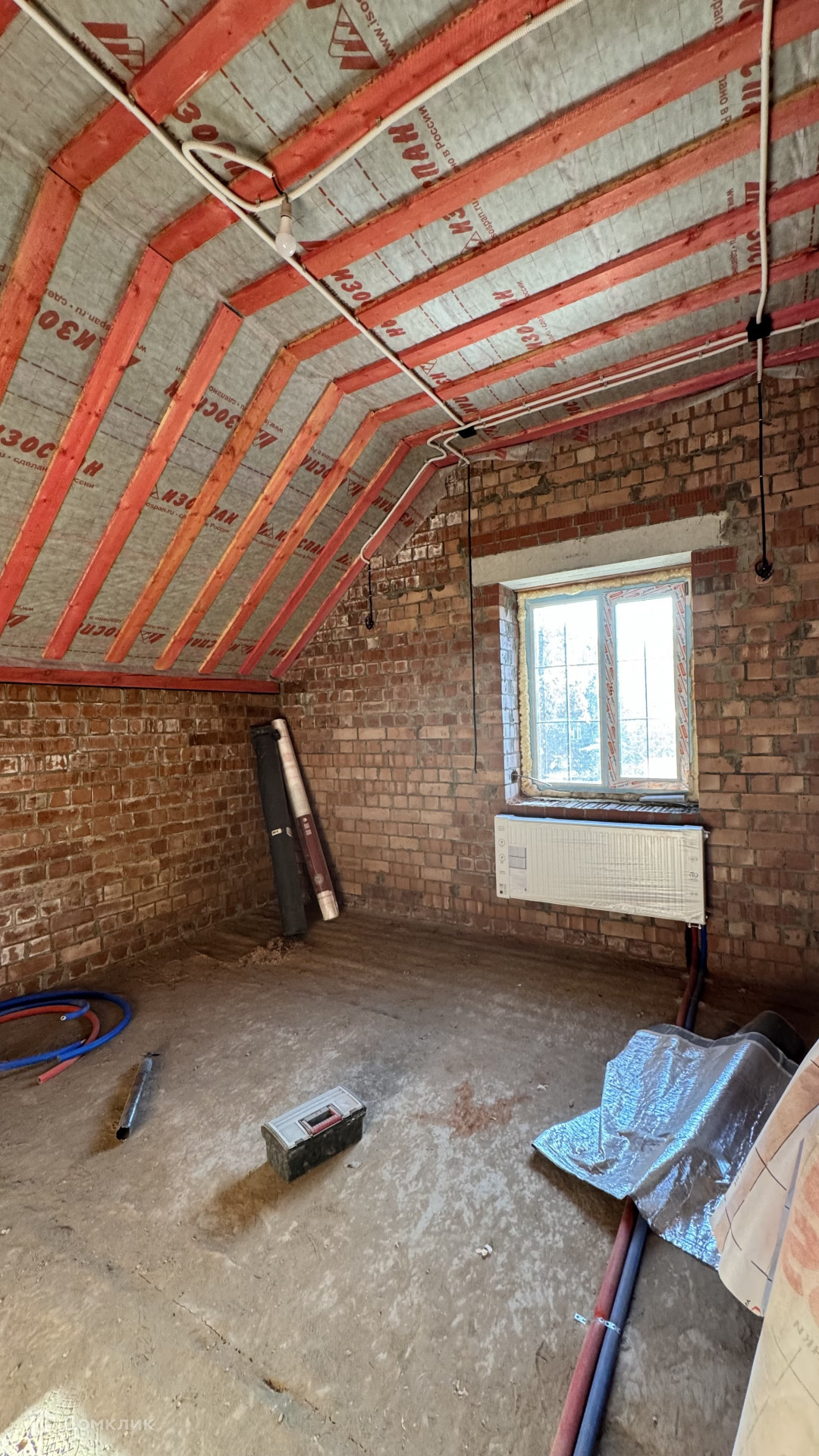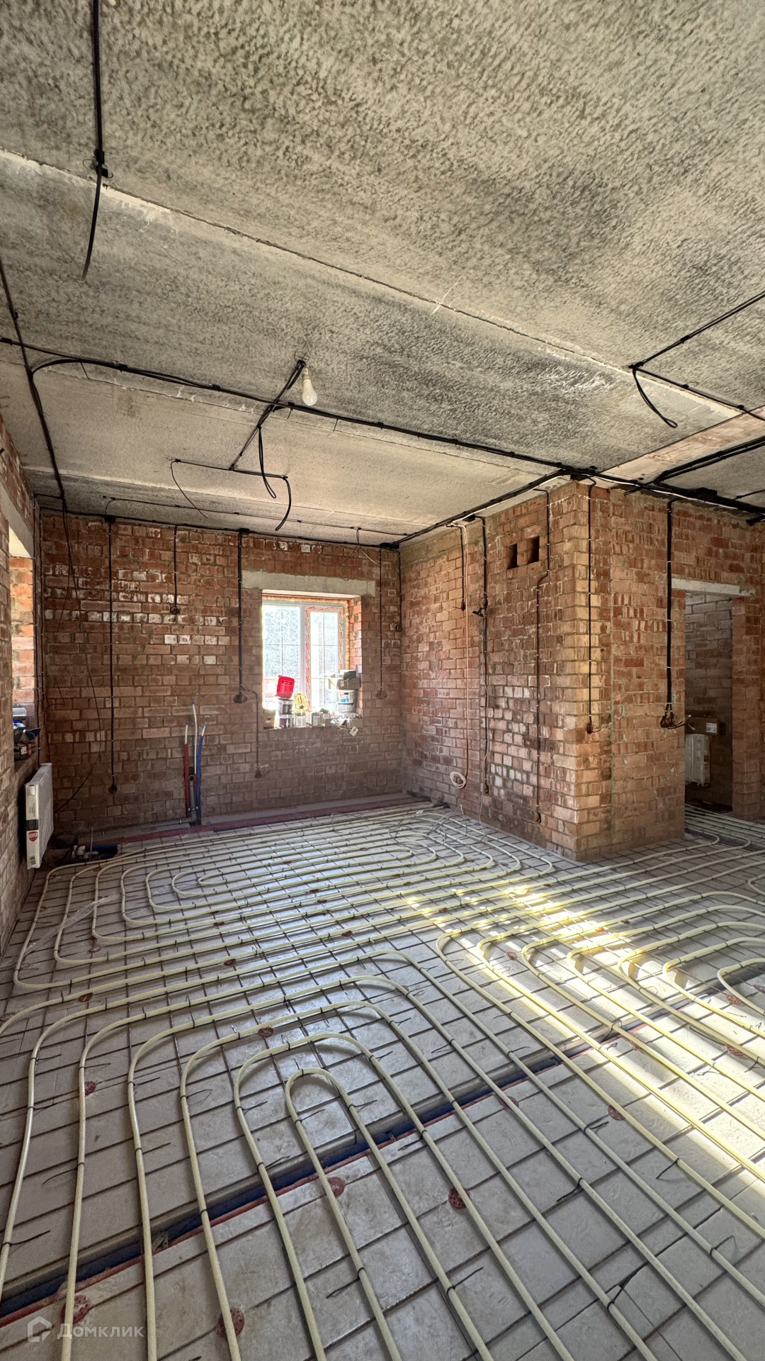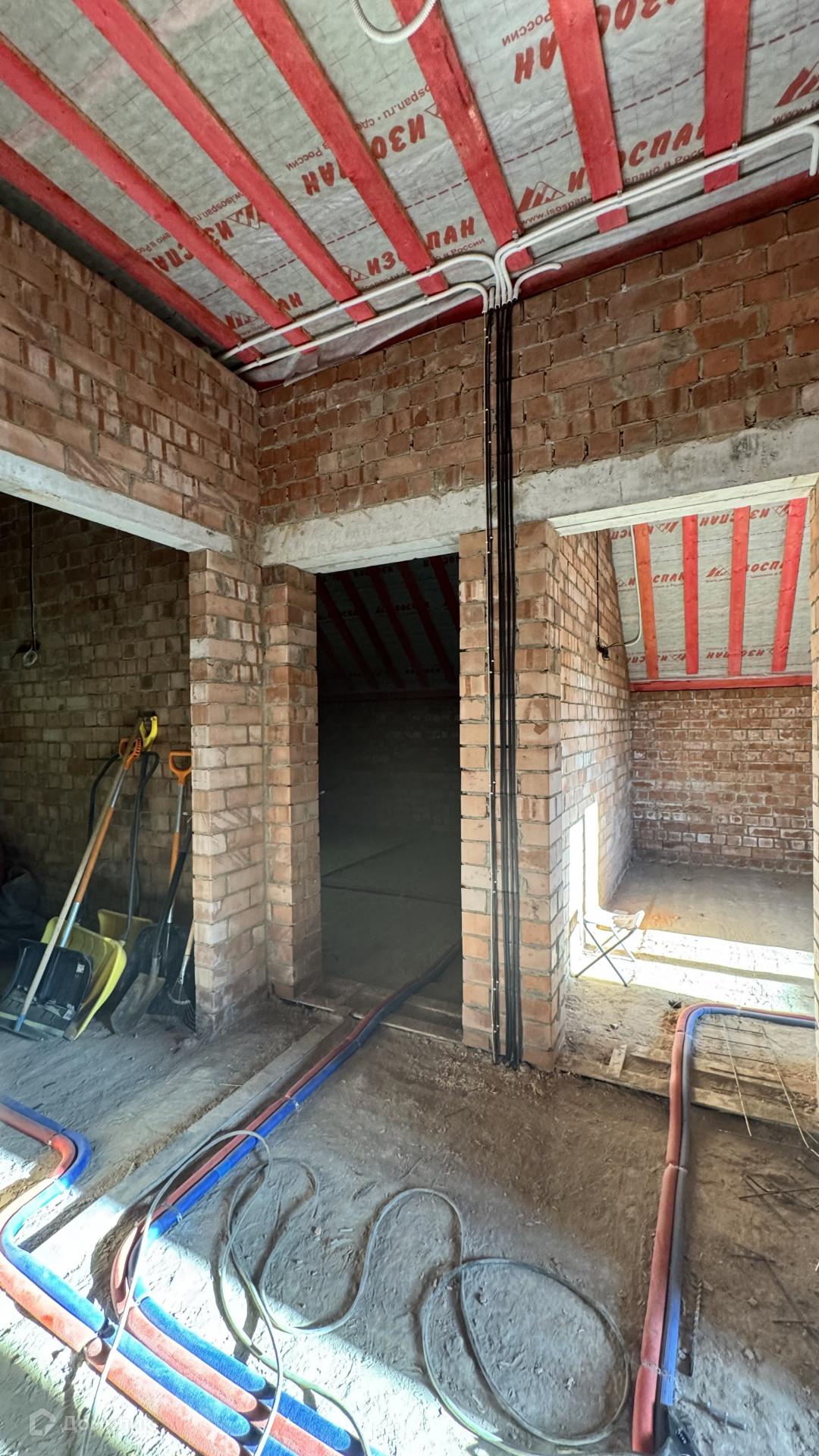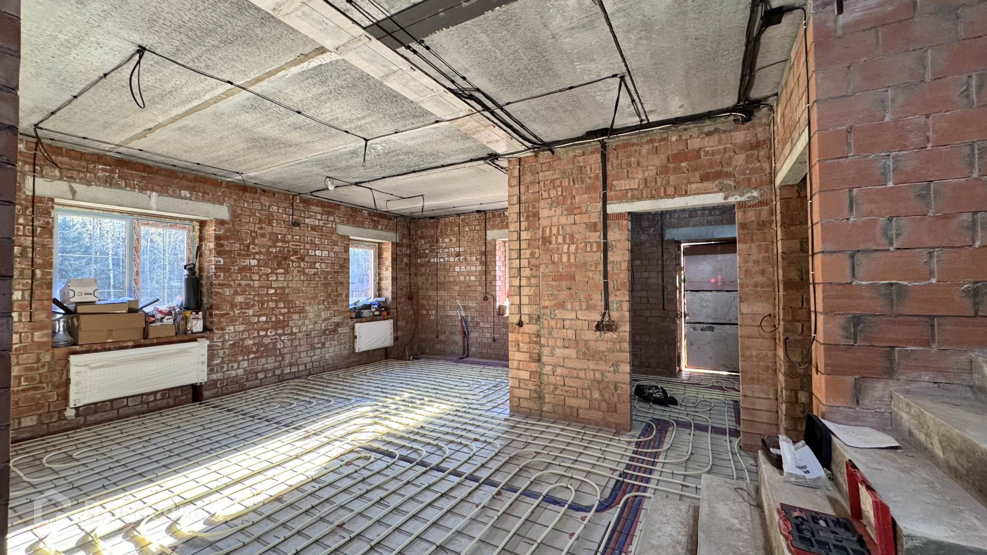 В дом заведен газ, скважина 43 метра, септик, сделаны работы: электрика, теплые полы, стяжка полов будет входит в стоимость, установлены котлы газовый и электрический, высокие потолки, есть выход на террасу, на втором этаже три спальни и санузел с окном