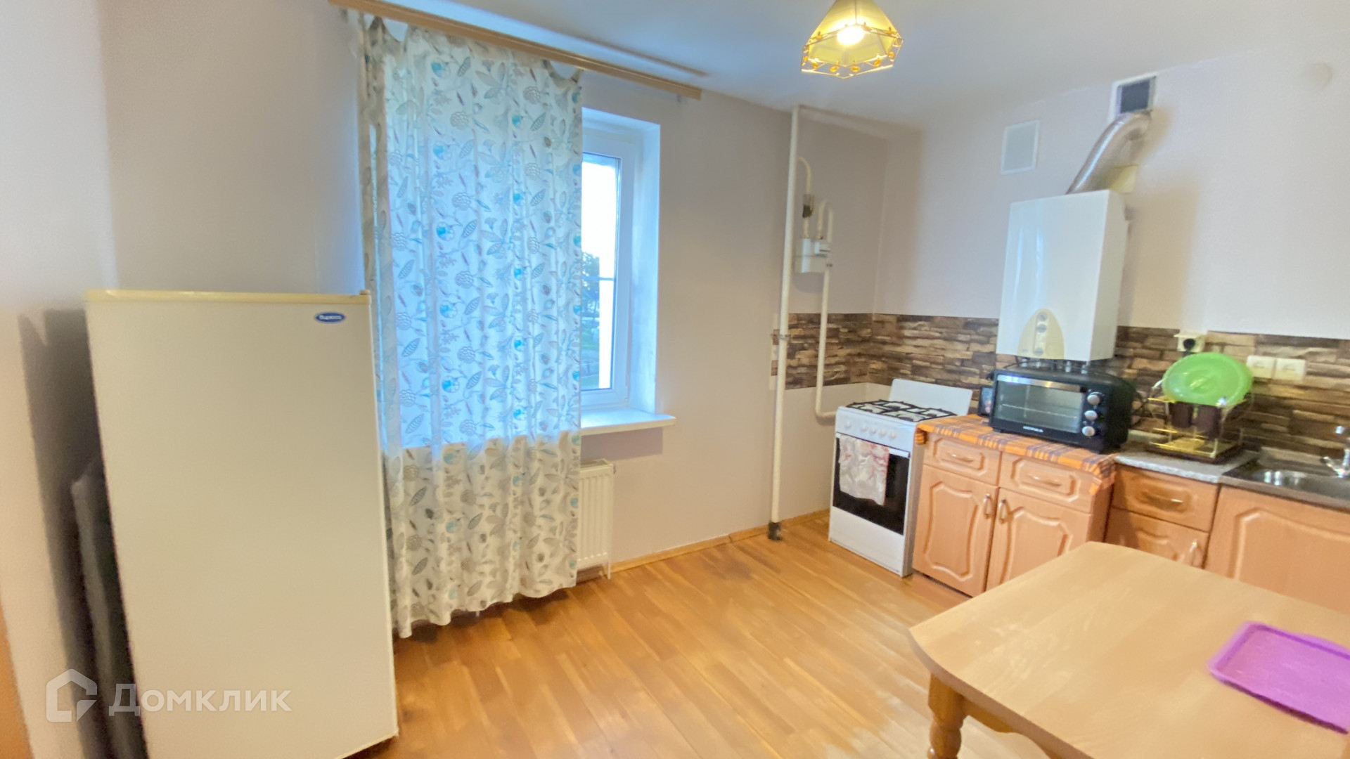Квартира расположена в кирпичном доме, общей площадью  33кв.м. Кухня с комнатой изолированы. В комнате 2 окна , поэтому разделена на зоны. Спальные места : двухспальная кровать, кровать чердак- двухуровневая. Кухня  меблирована кух.гарнитур, стол+3 стула, холодильник, газовая плита. Отсутствует стиральная машинка.