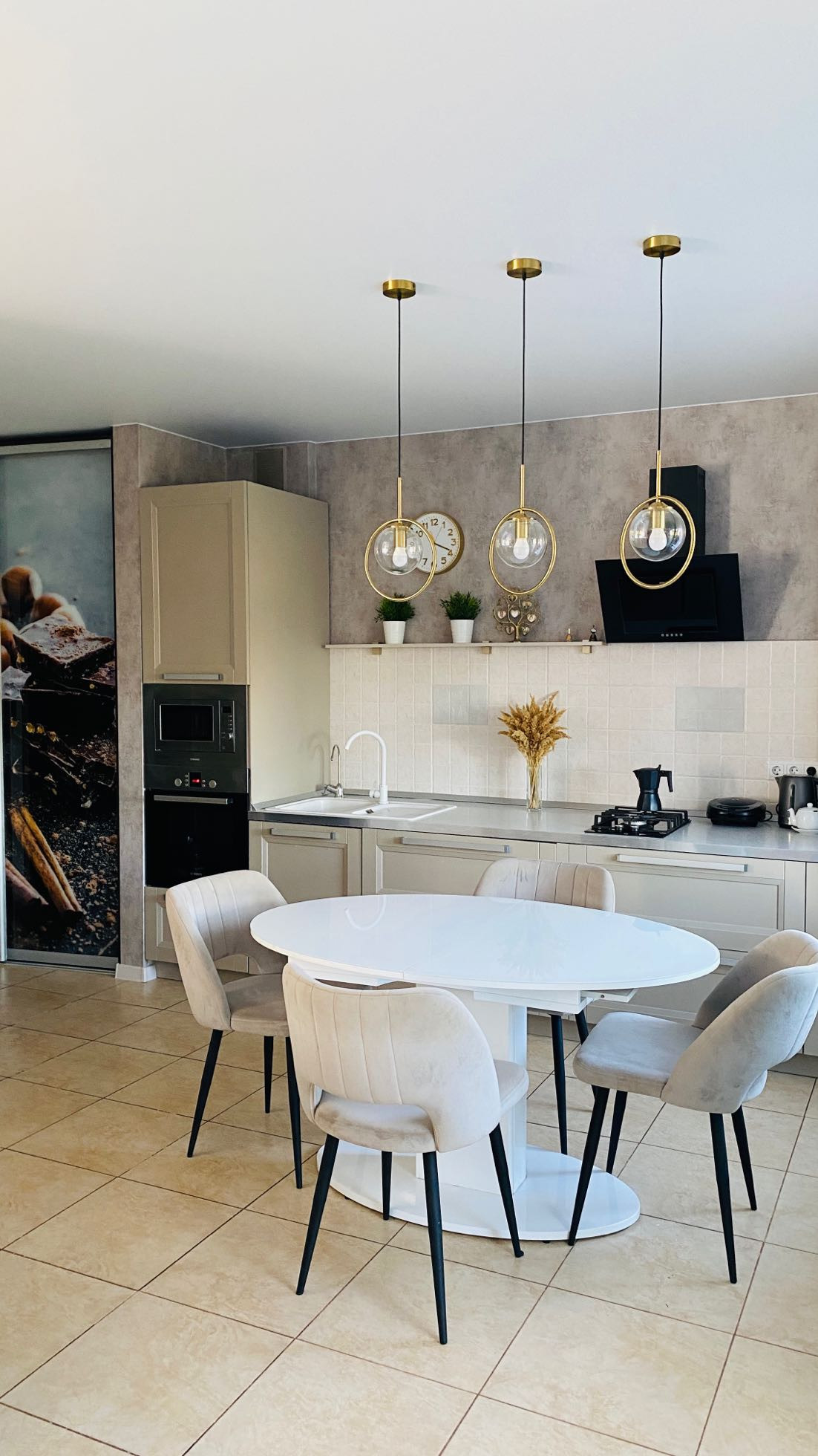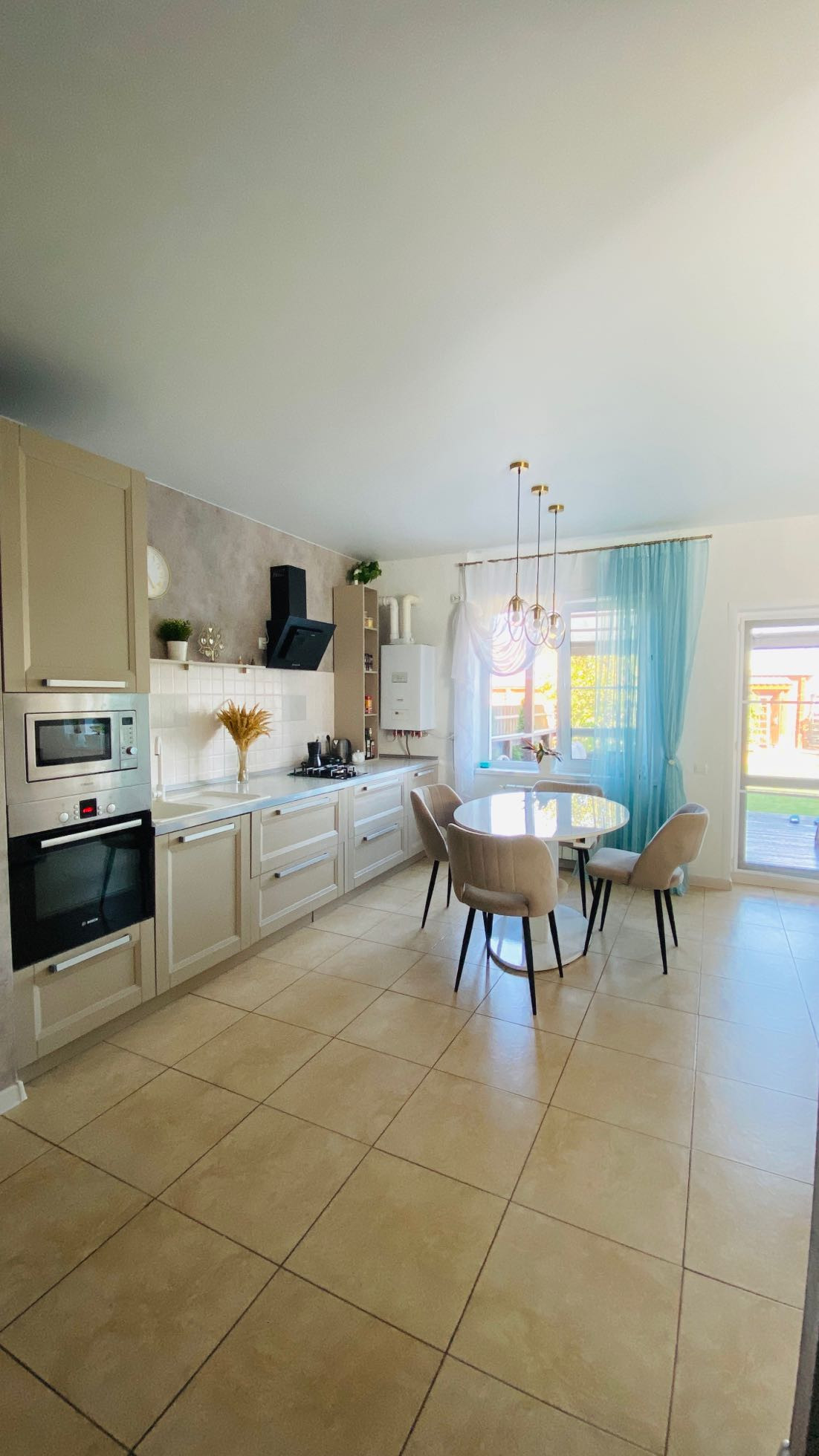 - кухня-гостинная 40 кв.м. с выходом на участок , с лаконичным гарнитуром и техникой: варочная панель газовая, духовой шкаф электрический, холодильник , вытяжка, газовый котел;