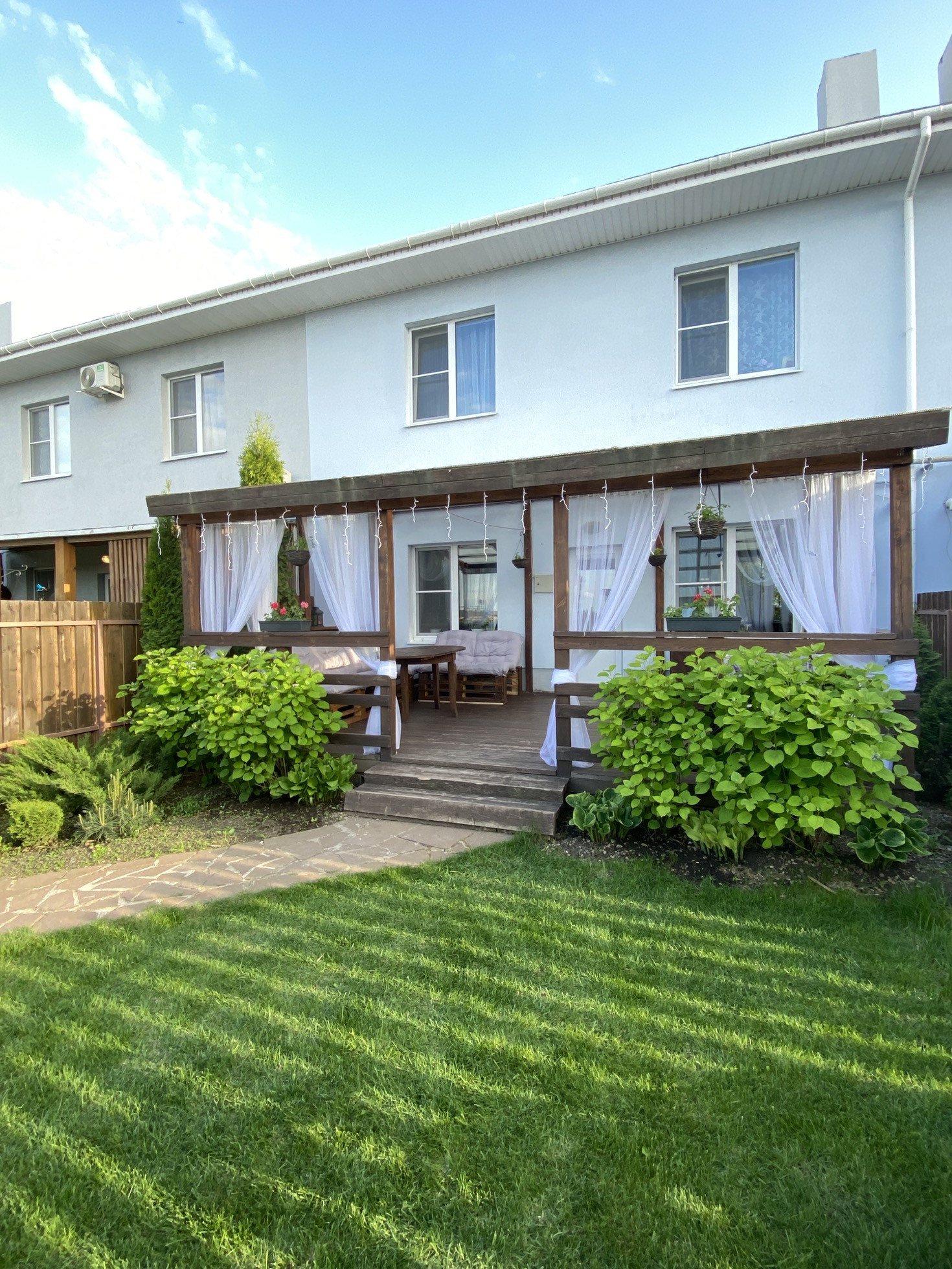 Предлагаю к покупке двухэтажный таунхаус с современным ремонтом и уютной придомовой территорией и парковкой на два автомобиля.
