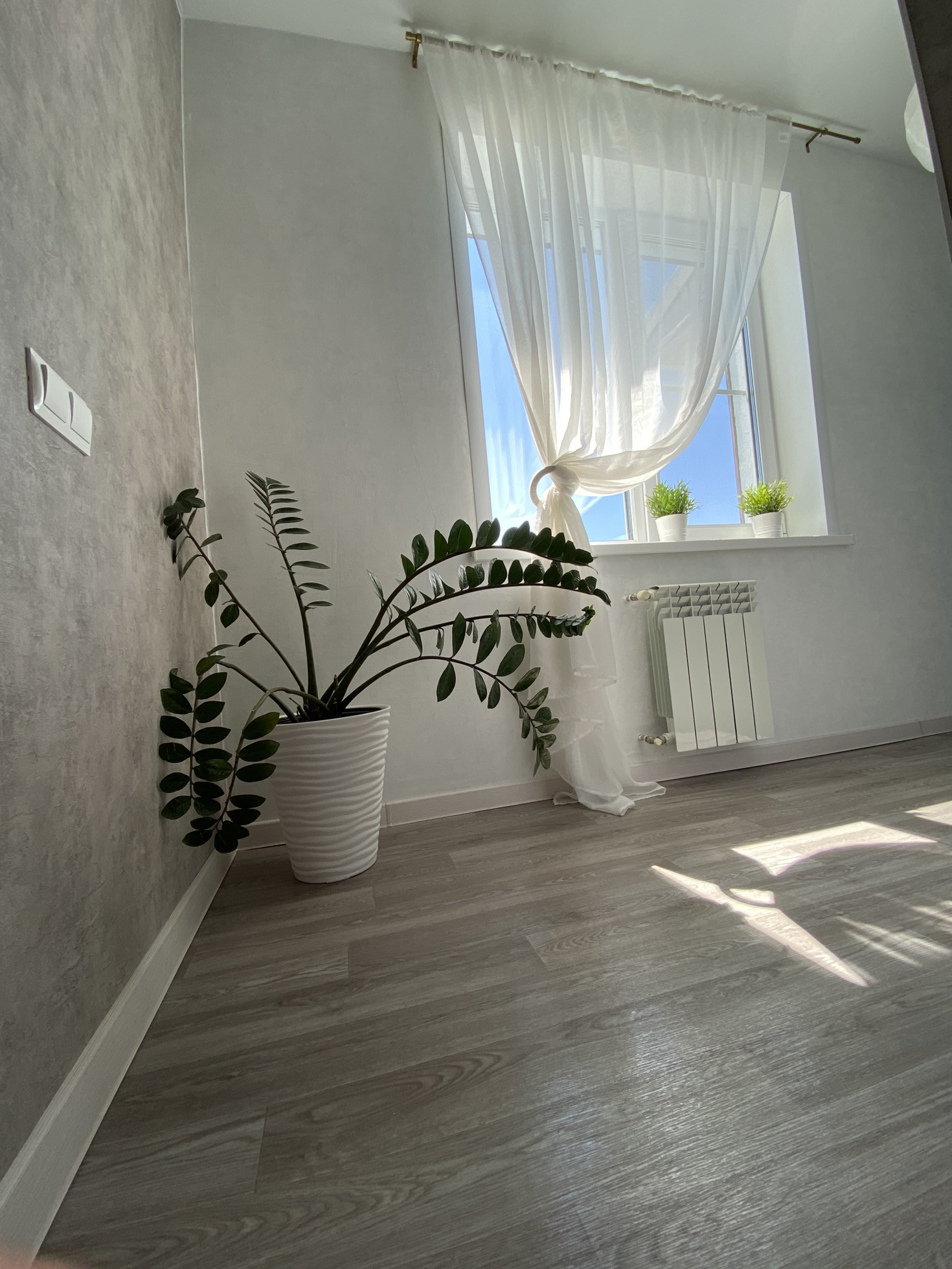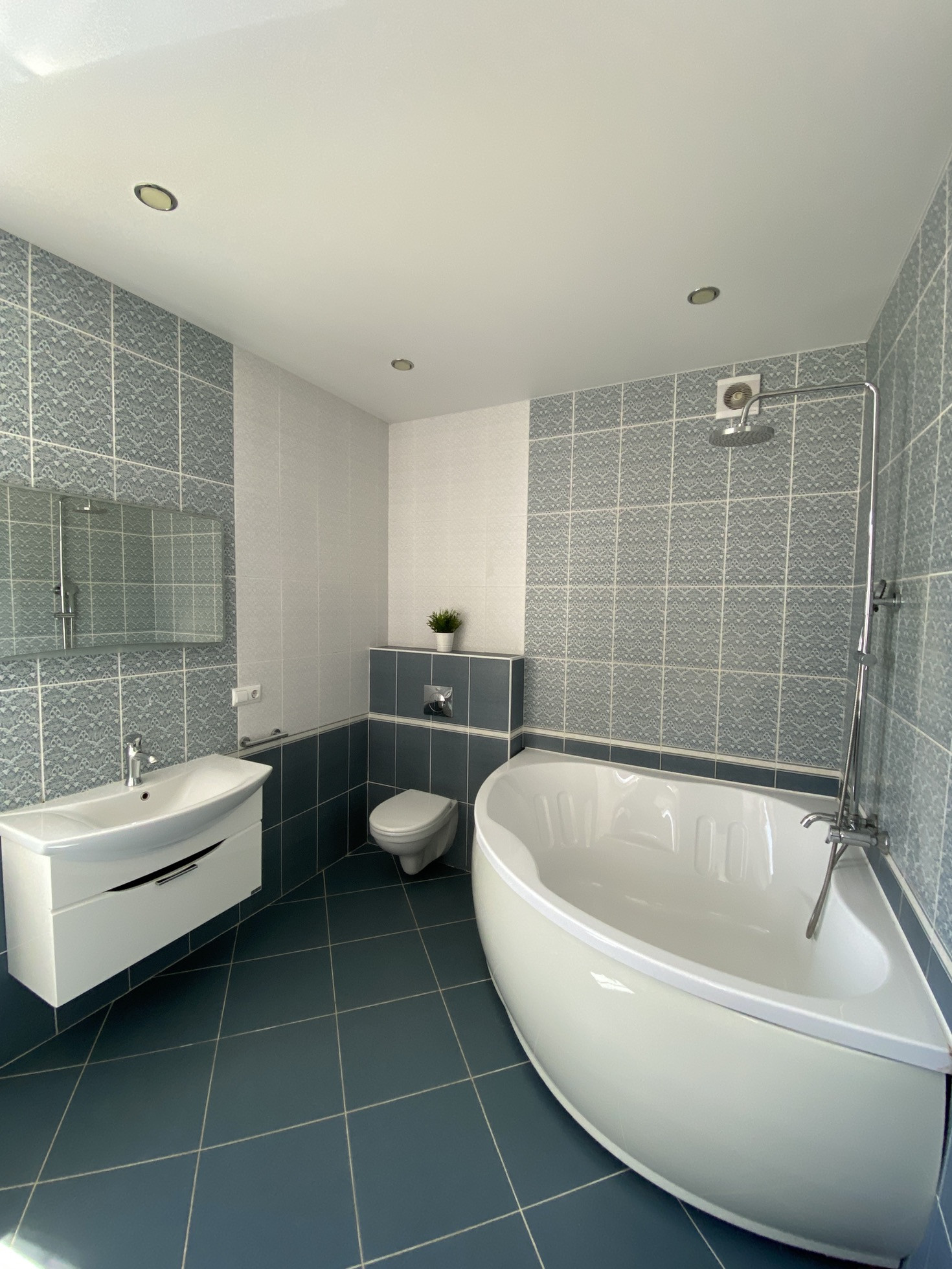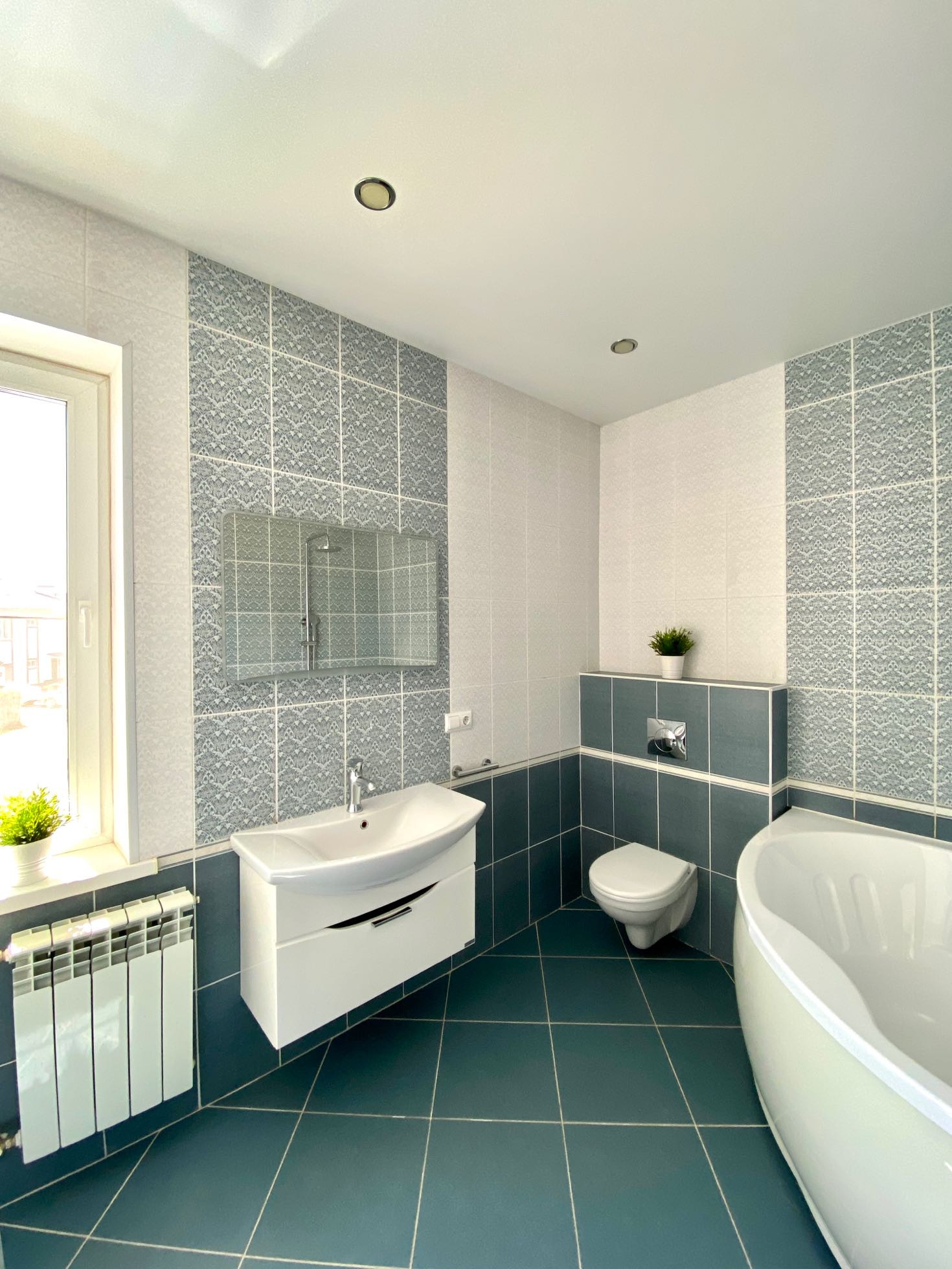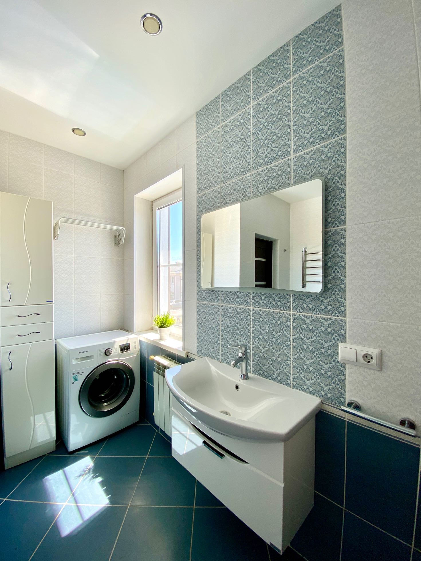 -просторный совмещенный с/узел с окном 8,5 кв.м в котором установлена угловая ванна, тумба с раковиной , зеркало, унитаз с инсталляцией ,машинка стиральная ;