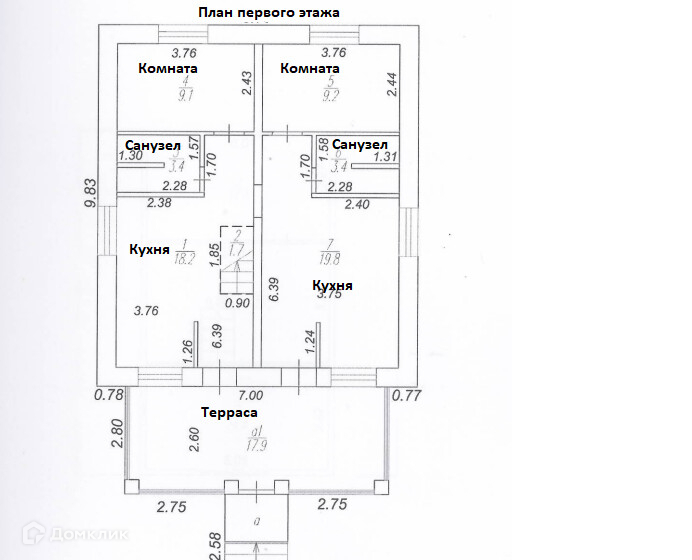 Две комнаты на первом этаже и две на втором;