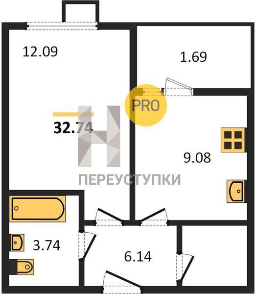 Общая площадь 32,74 кв.м.