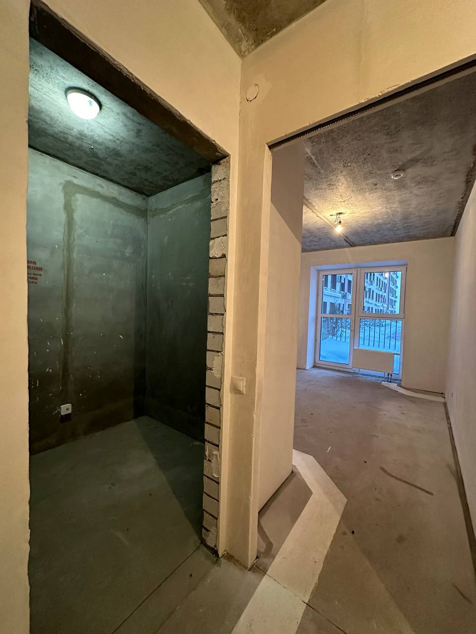 1 комфортный этаж. Общая площадь 51 кв.м, жилая 25 кв. Кухня 11.33 кв.м. Комнаты 12,44 и 12,74. Уникальность этой квартиры - собственная терраса, 4,97 кв.м. перед окнами. Выход на террасу из кухни. Есть навес над терассой..В квартире высокие потолки, проведена качественная электрика, стены готовы под покраску. Полы выровнены, залиты. Окна смотрят во двор.
