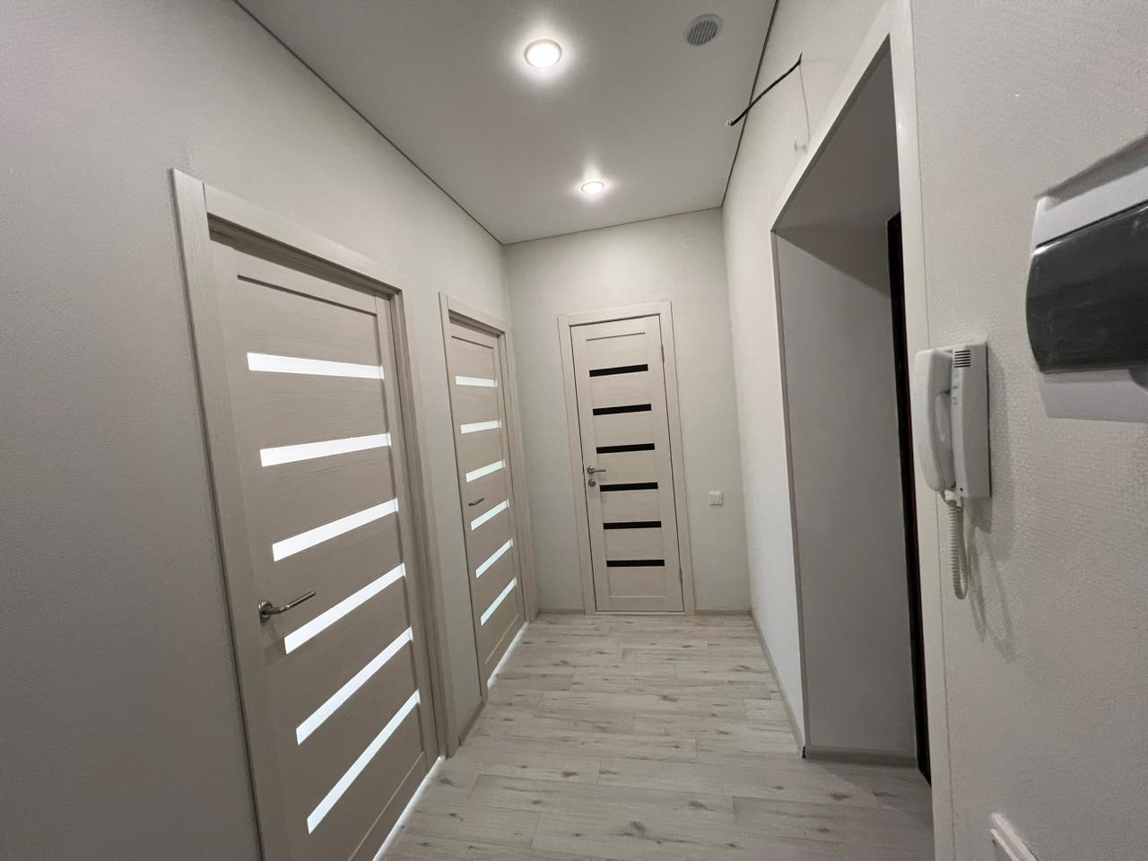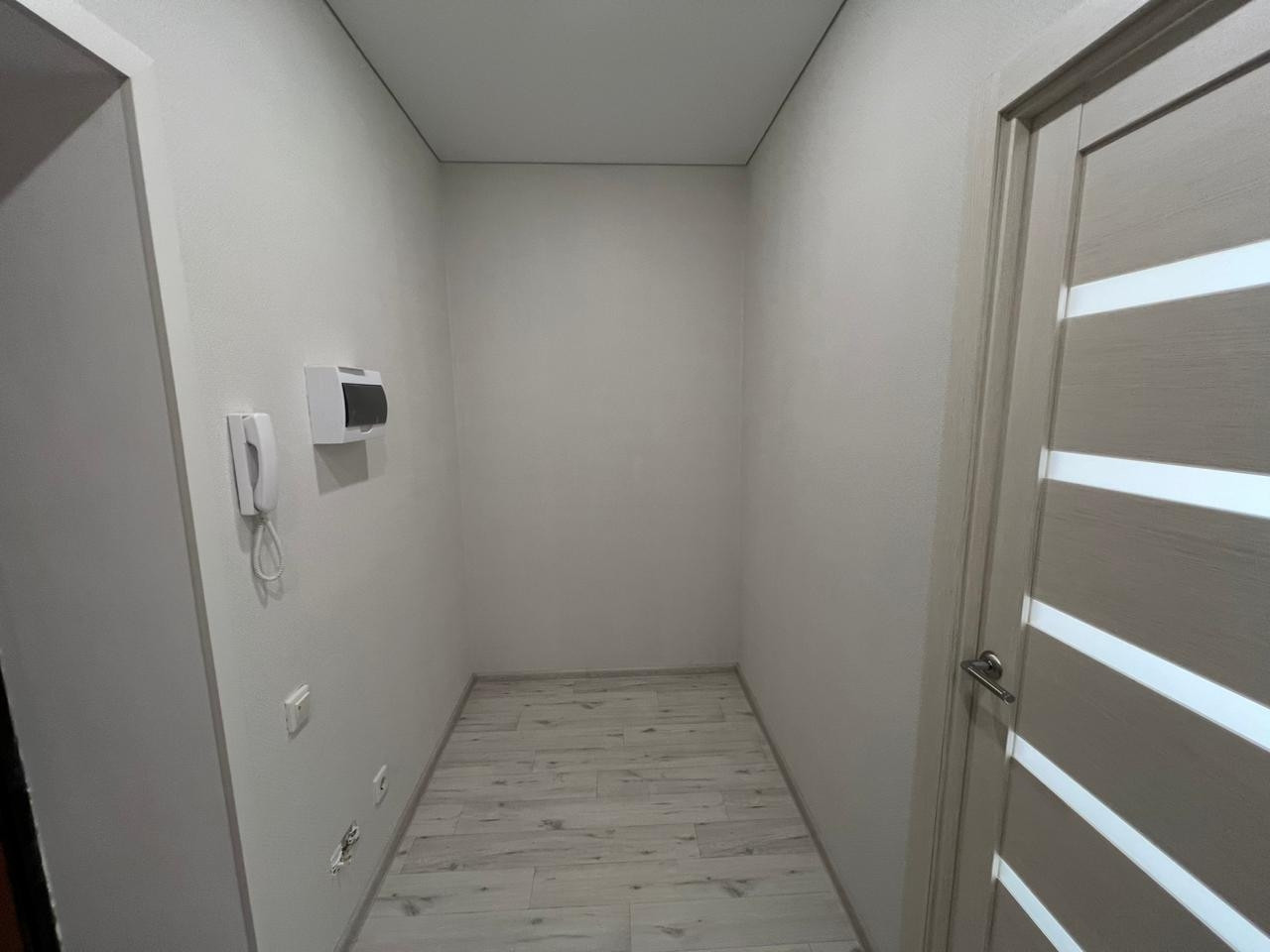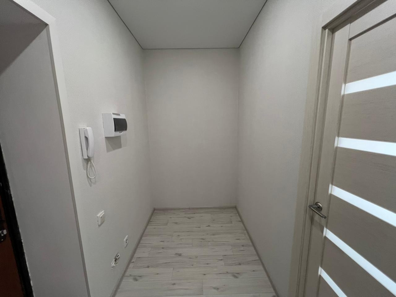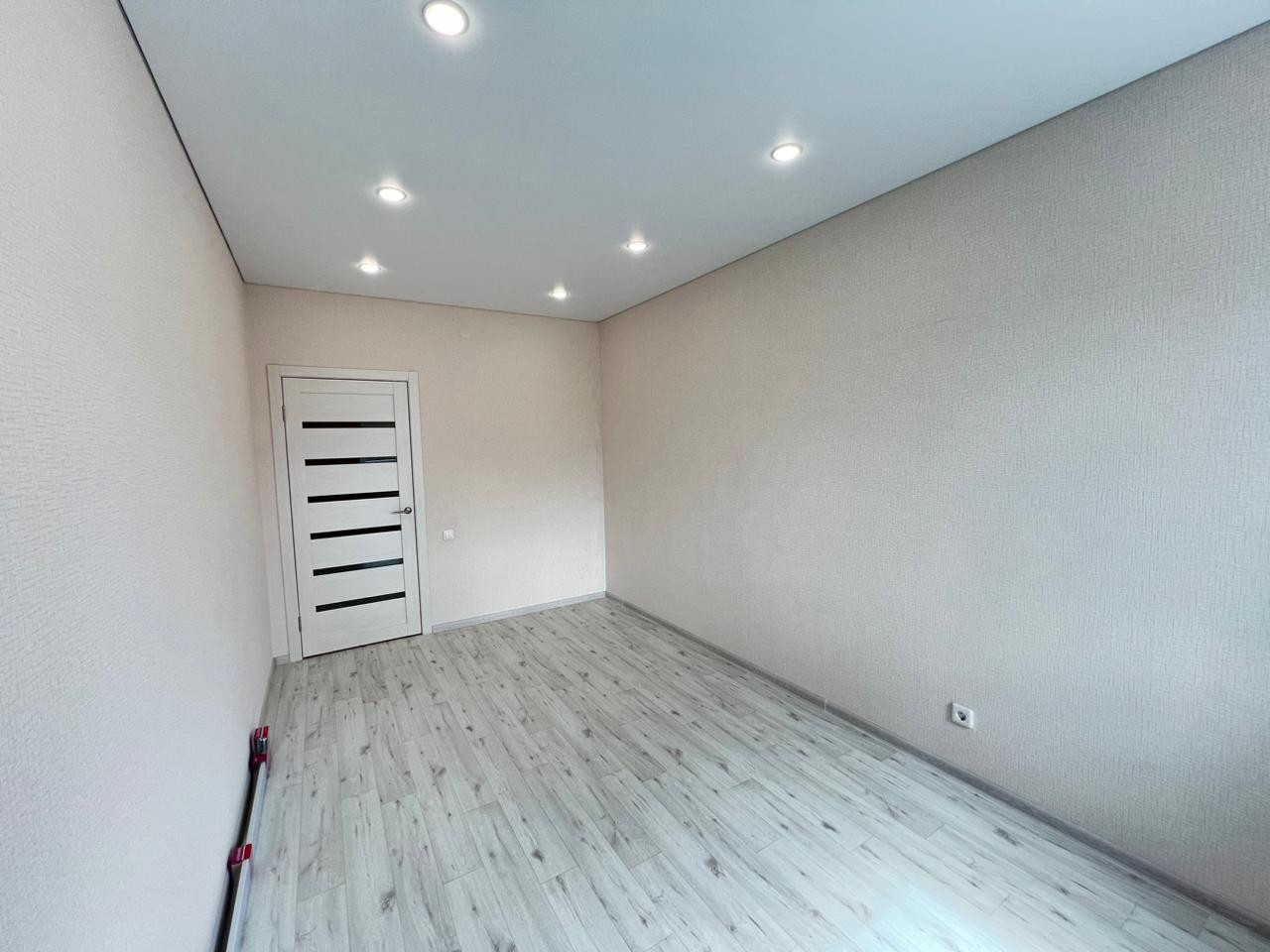 В комнатах обои в светлых тонах, на полу ламинат, в сан. узле плитка, натяжные потолки во всех комнатах с хорошим освещением.