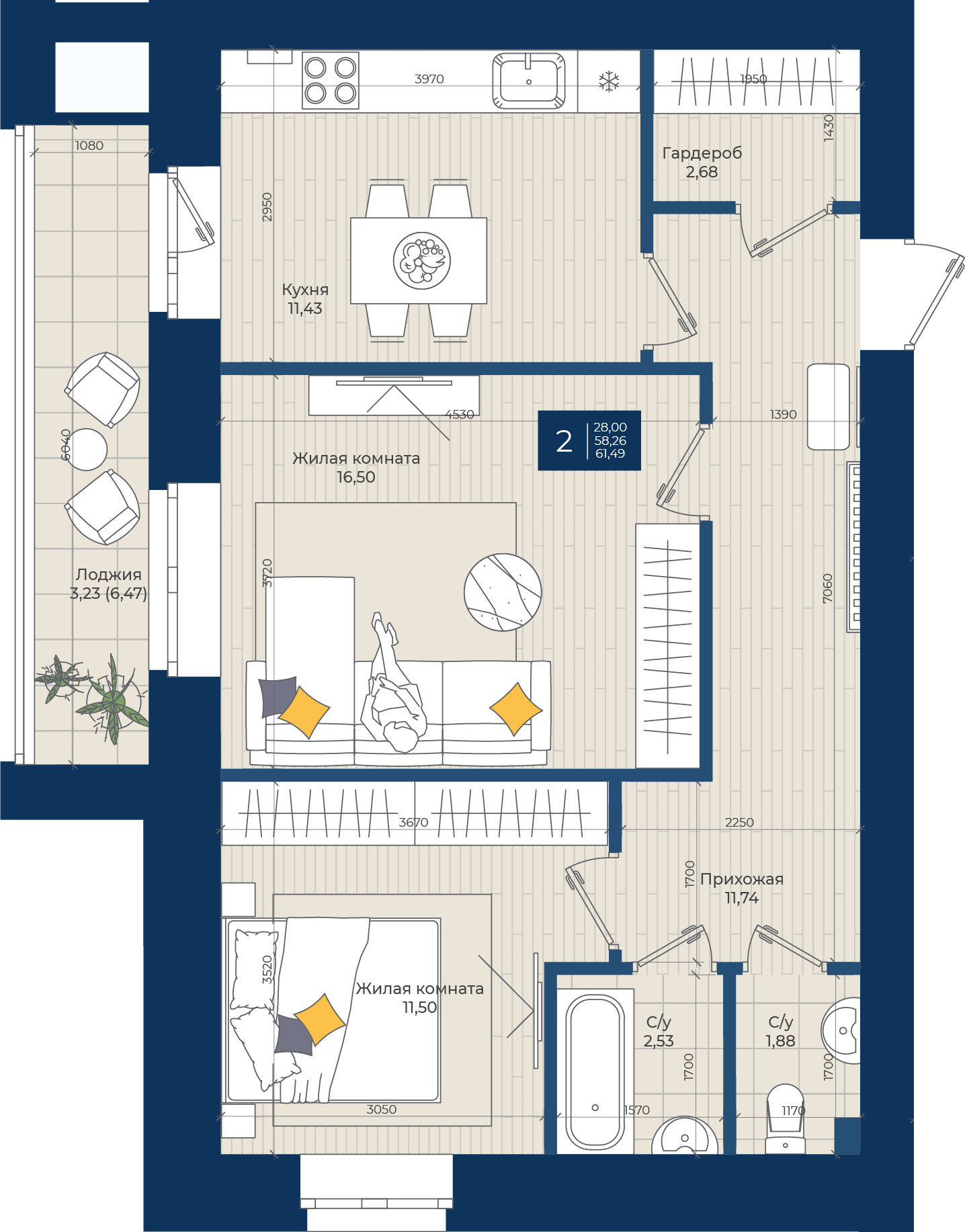 Общая площадь 61.49 м2