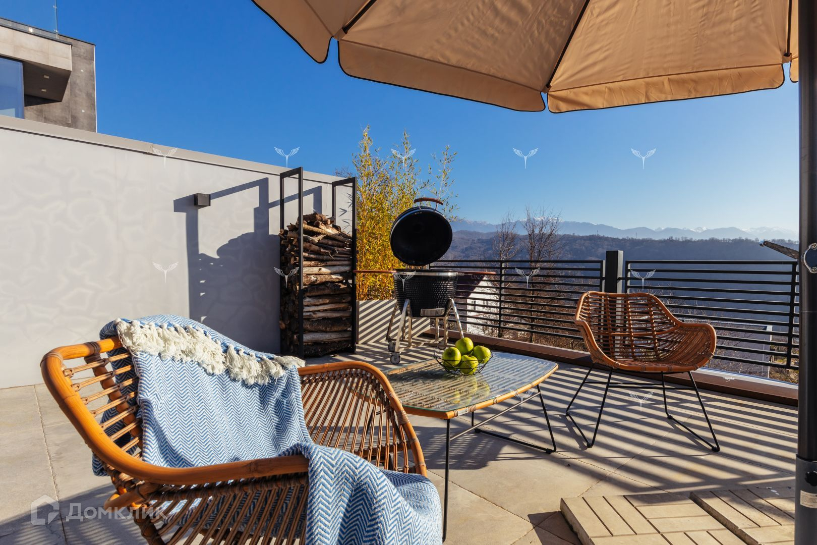 3 этаж: эксплуатируемая кровля с дополнительной полноценной кухней, набором посуды и бокалов, холодильником, посудомоечной машиной и т д. На кровле расположен большой набор мягкой мебели и огромный зонт. Все это делает кровлю сердцем дома с непередаваемыми видами и звуками природы.