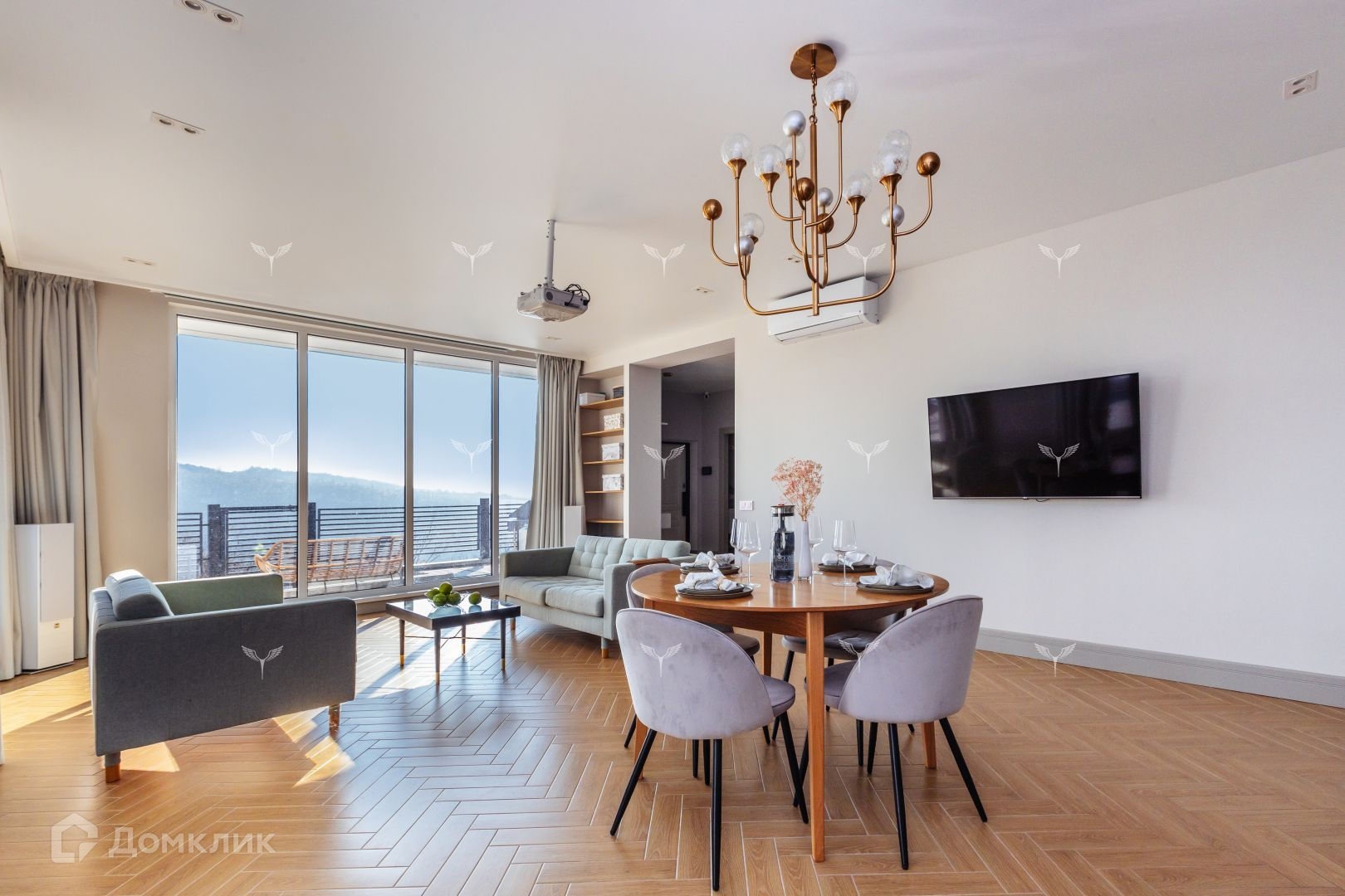 Внутри качественная отделка с мебелью и техникой. Домашний кинотеатр с проектором Epson и большим экраном с электроприводом. Полноценный 5 точечным звук Dali.