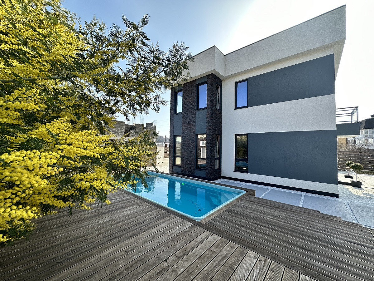 Фасад из качественных современных материалов, выполнено благоустройство, бассейн 6×3, детский уголок, мини сад.