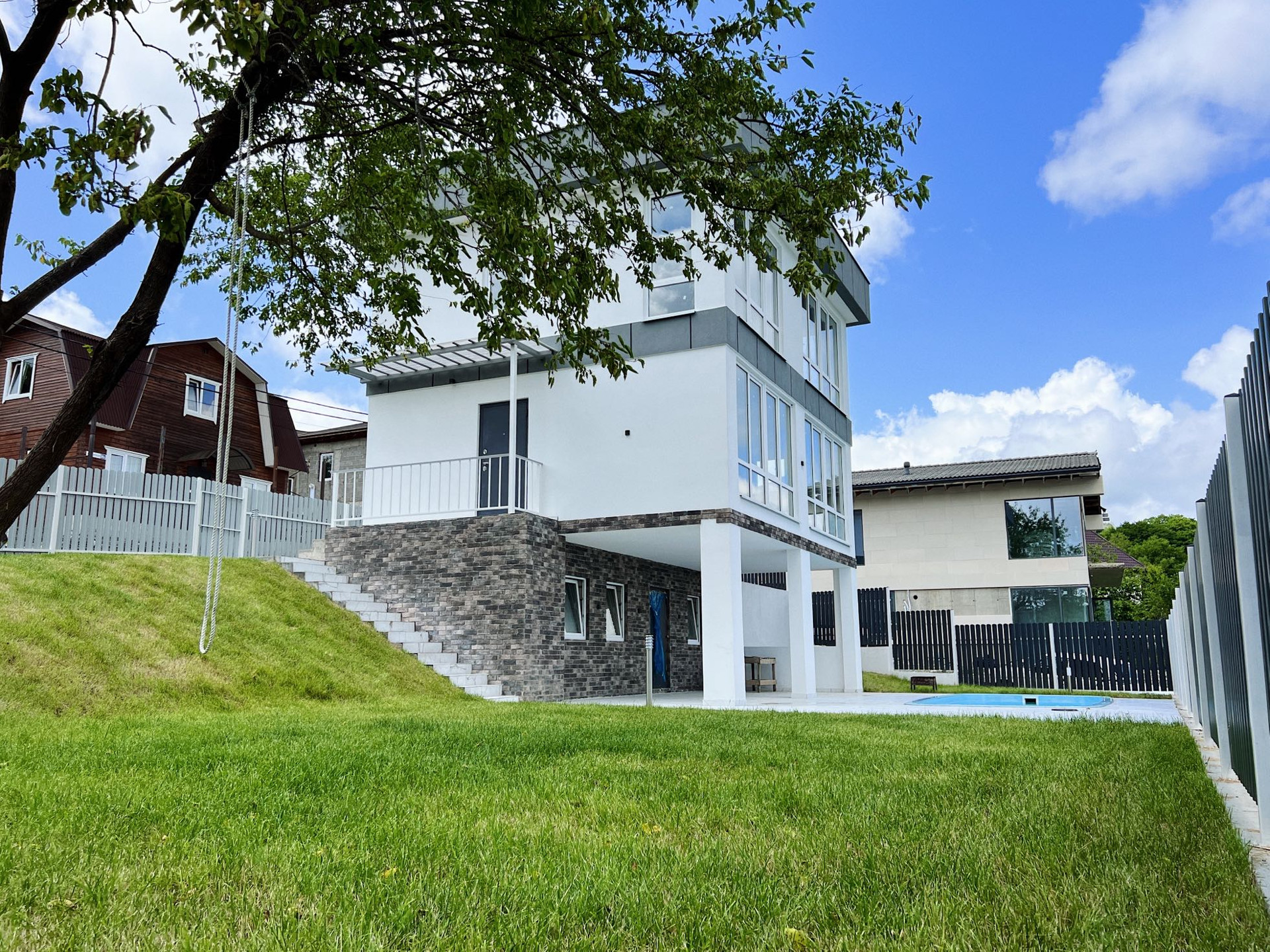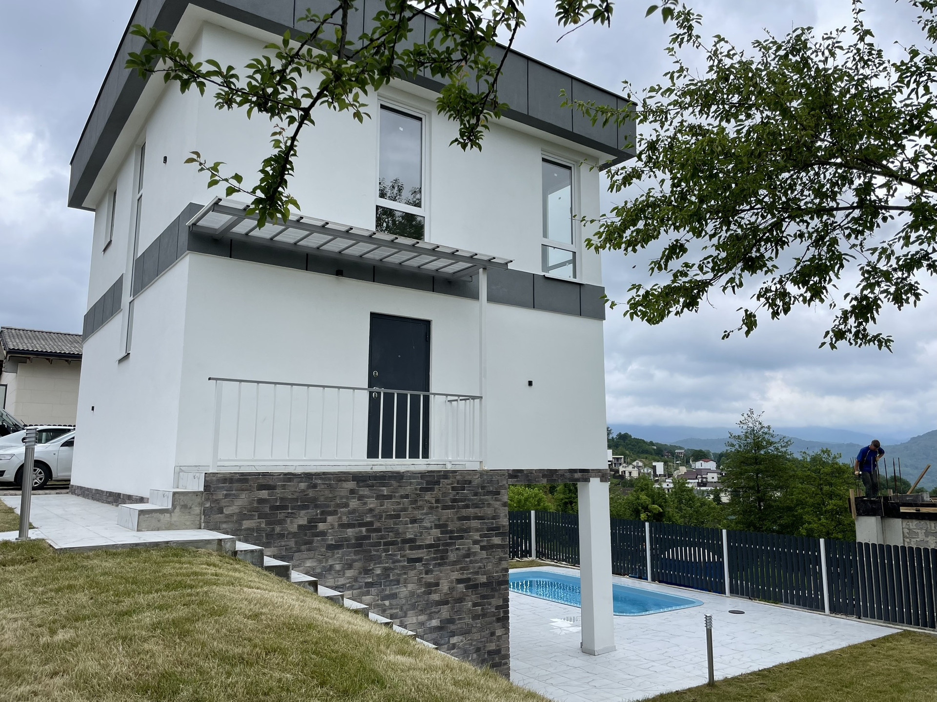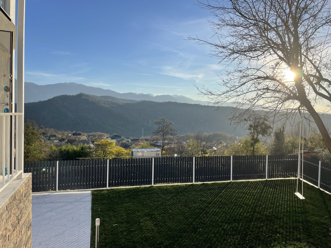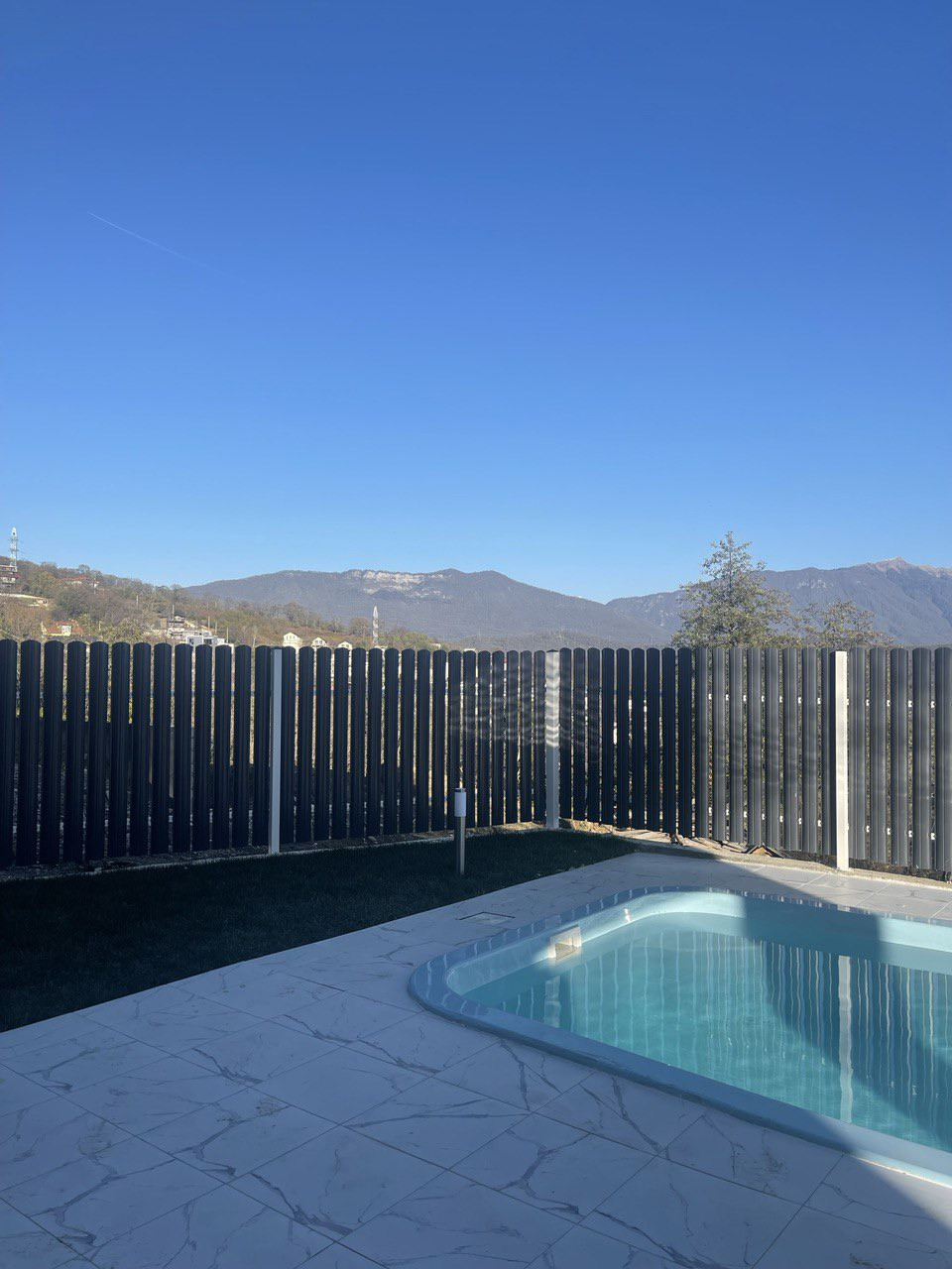 Участок очень грамотно спланирован: зоны отдыха у бассейна (3 на 6) с крытой террасой и видом на горы, 2 парковочных места, большая лужайка с идеально ровным газоном, огромное дерево шелковицы (плодоносящее), на ветке которого уютная качель.