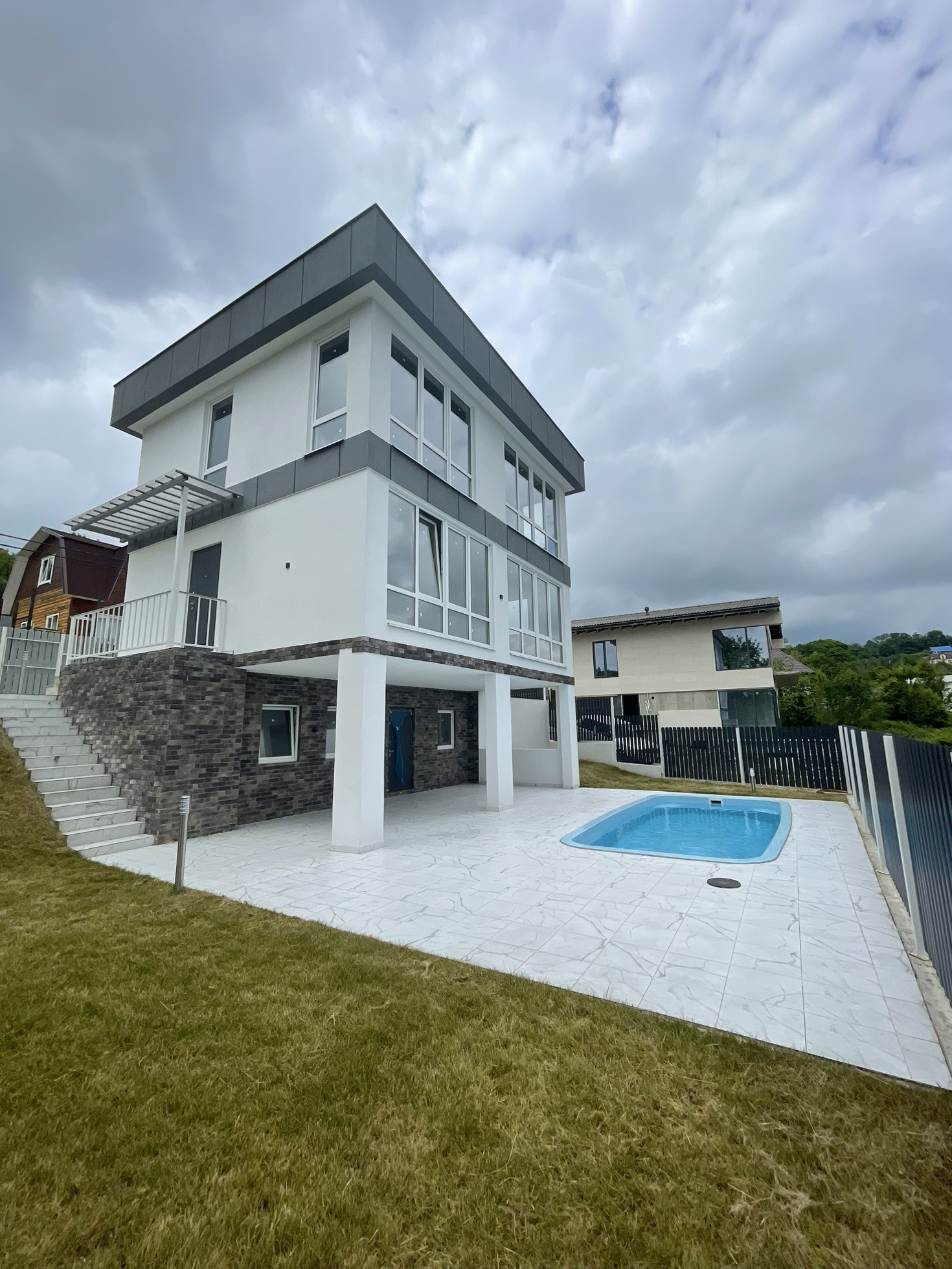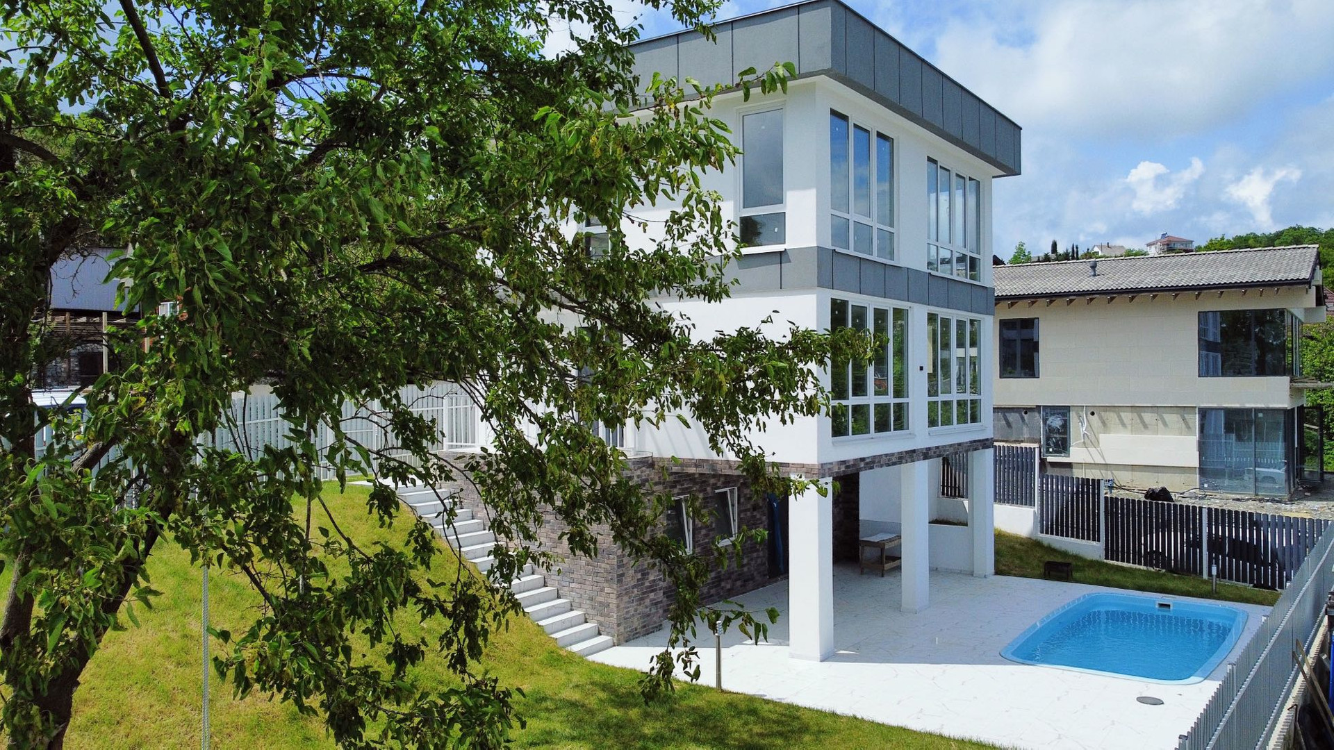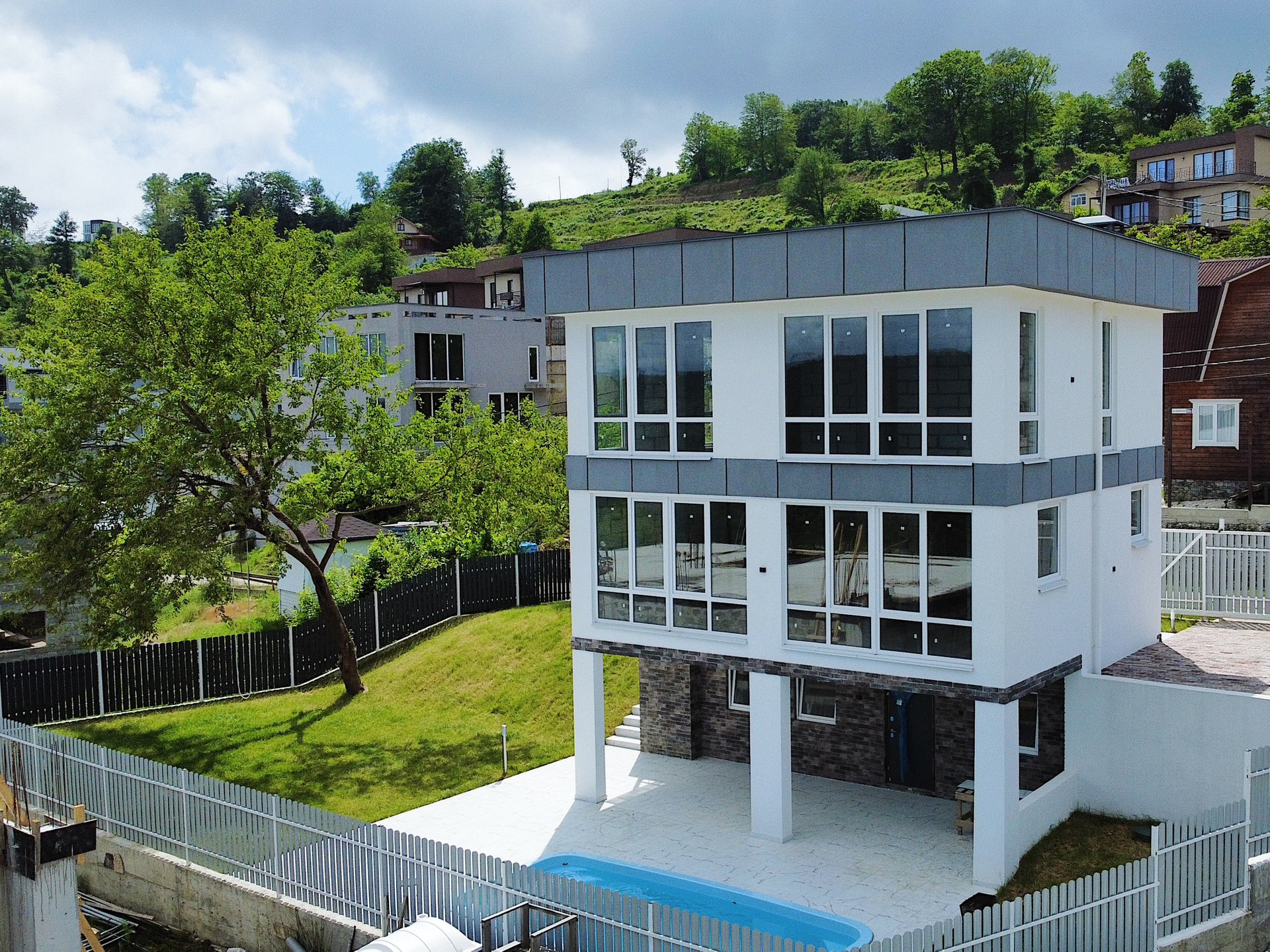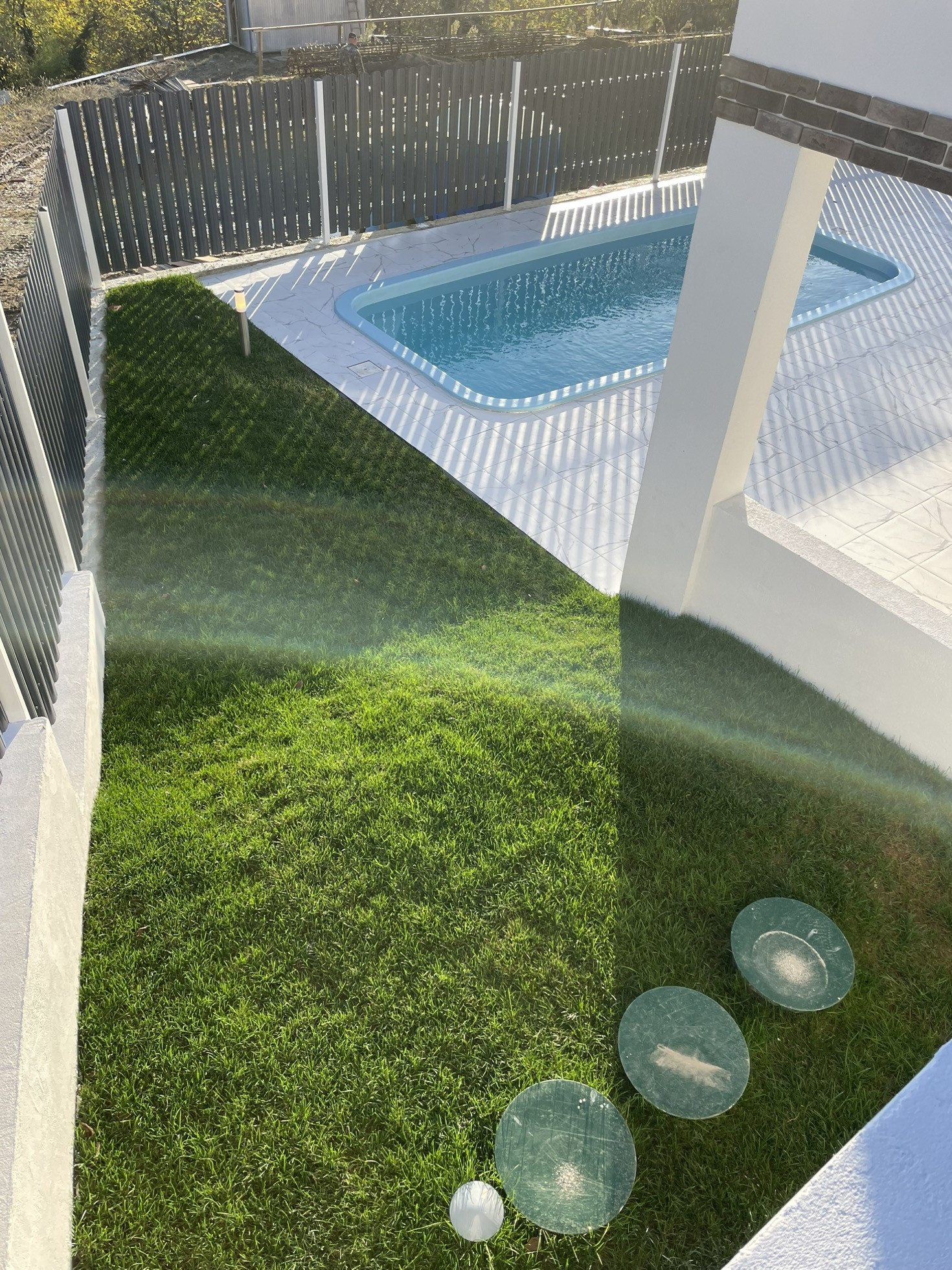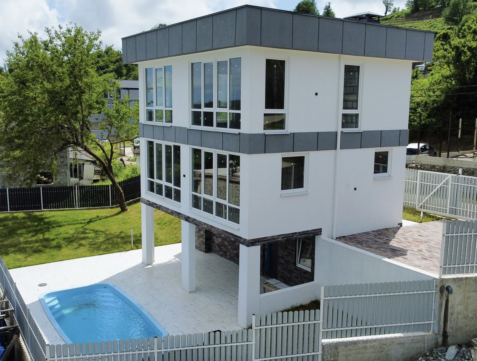 Участок очень грамотно спланирован: зоны отдыха у бассейна (3 на 6) с крытой террасой и видом на горы, 2 парковочных места, большая лужайка с идеально ровным газоном, огромное дерево шелковицы (плодоносящее), на ветке которого уютная качель.